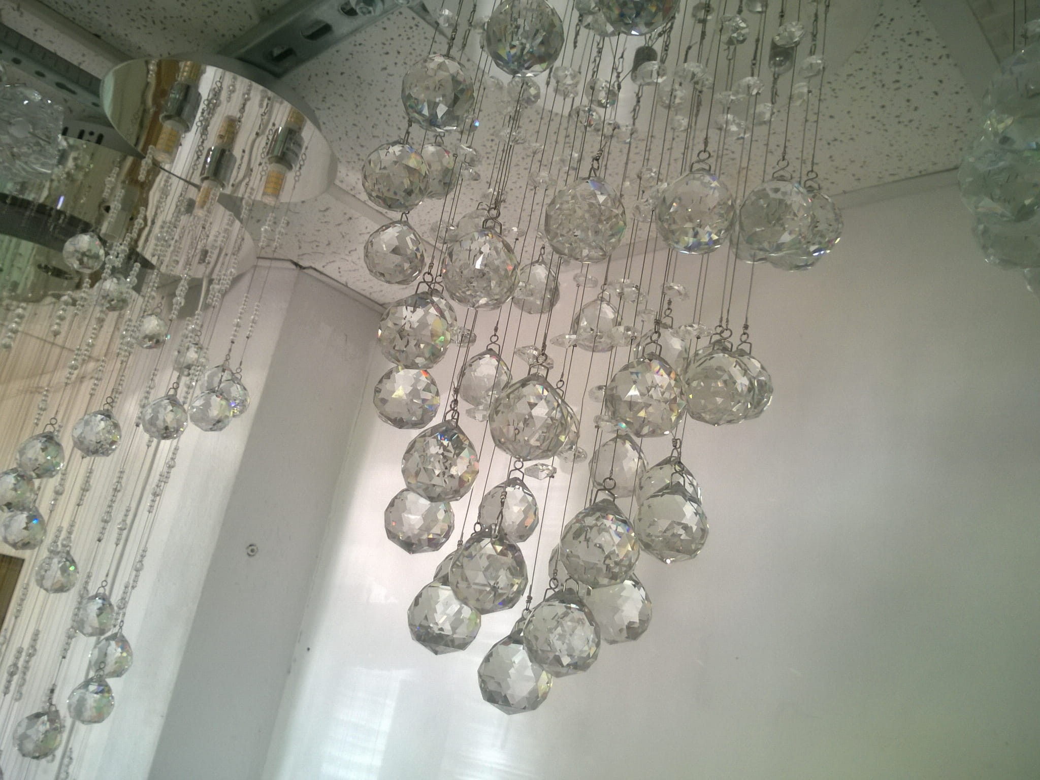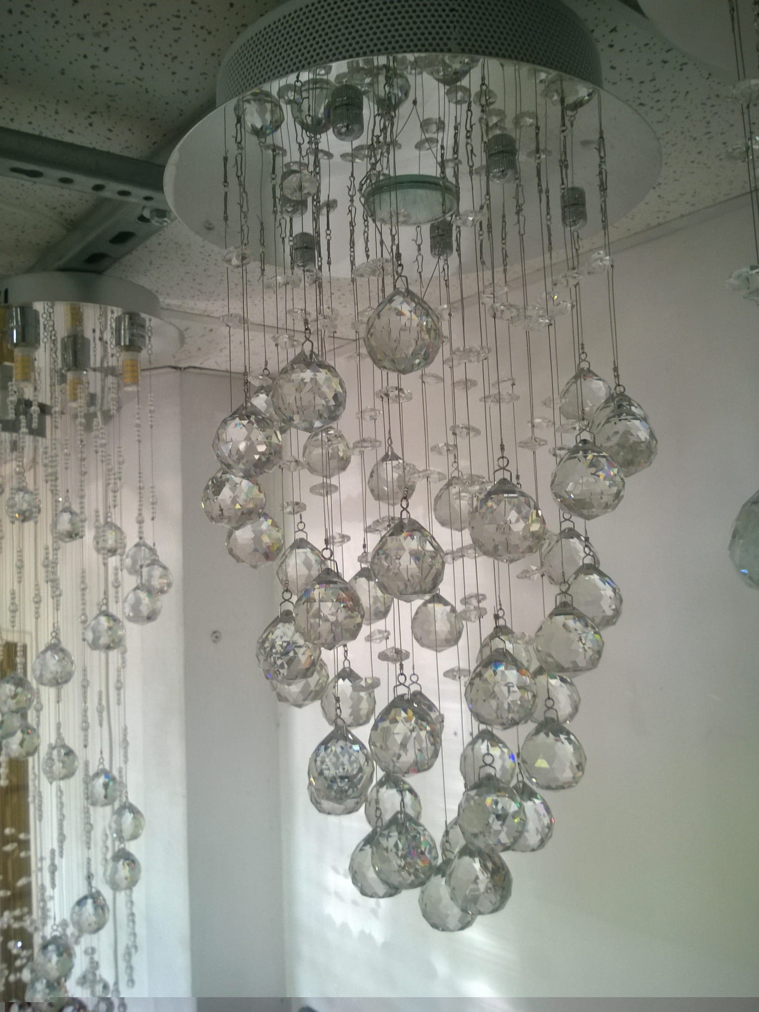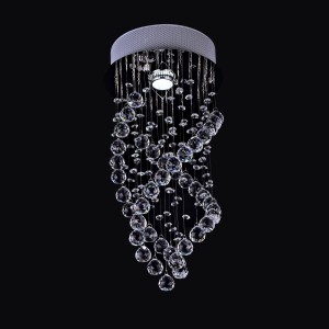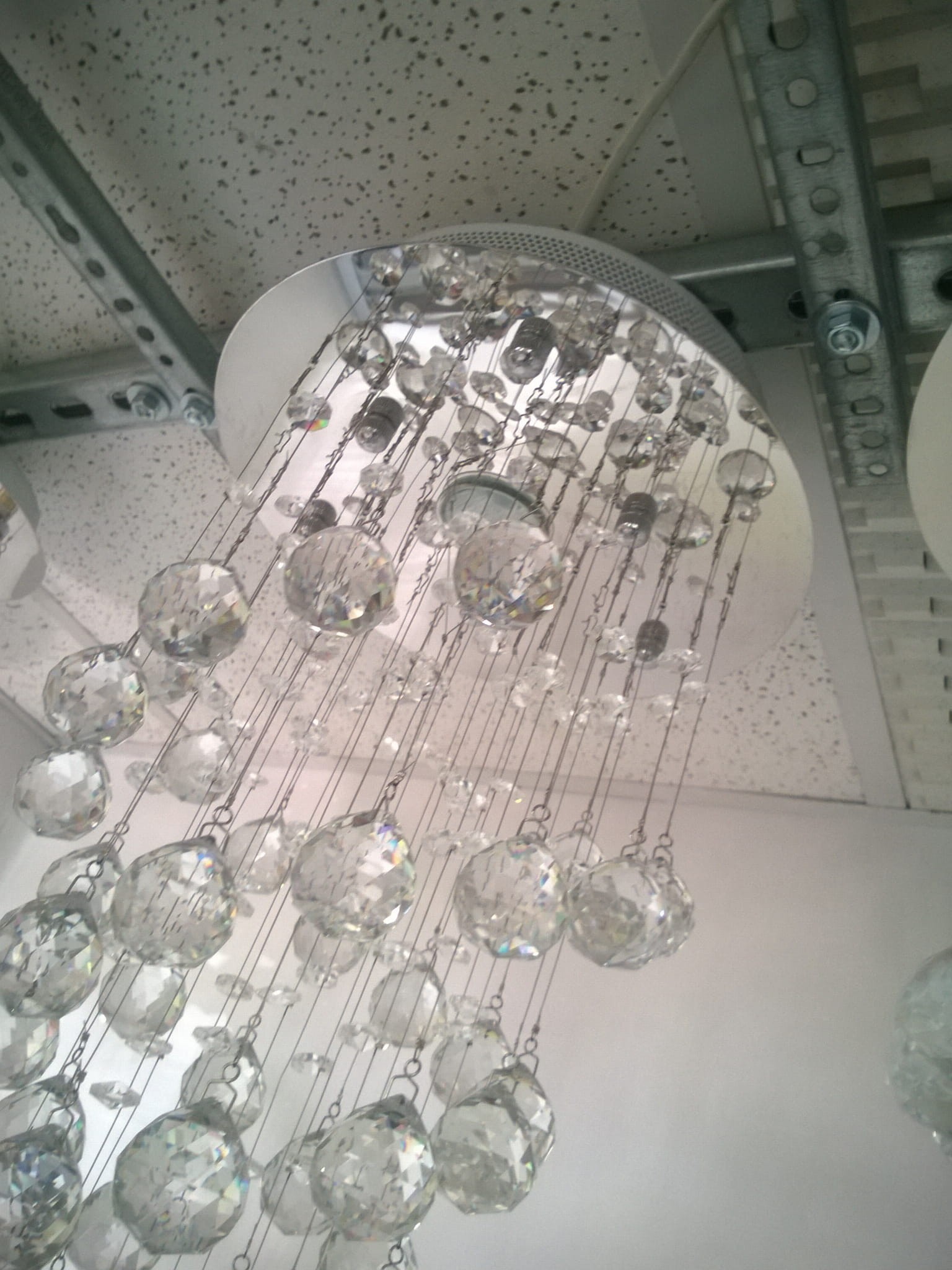 Oferujemy lampę kryształową, plafon o podstawie okrągłej o średnicy 25 cm wysokość 40 cm, wyposażoną w żarówkę Gu 10. Na podstawie płyty montażowej zamontowanie są zawieszki dla 43 ciągów kryształów wykonanych z linki stalowej z zawieszonymi drobnymi kryształami i zakończone kulką kryształową o średnicy ok 3 cm. Kryształy wykonane z szkła kryształowego K9. Kryształy układają się w trzy węże zbiegające się w czubku lampy kryształowej.