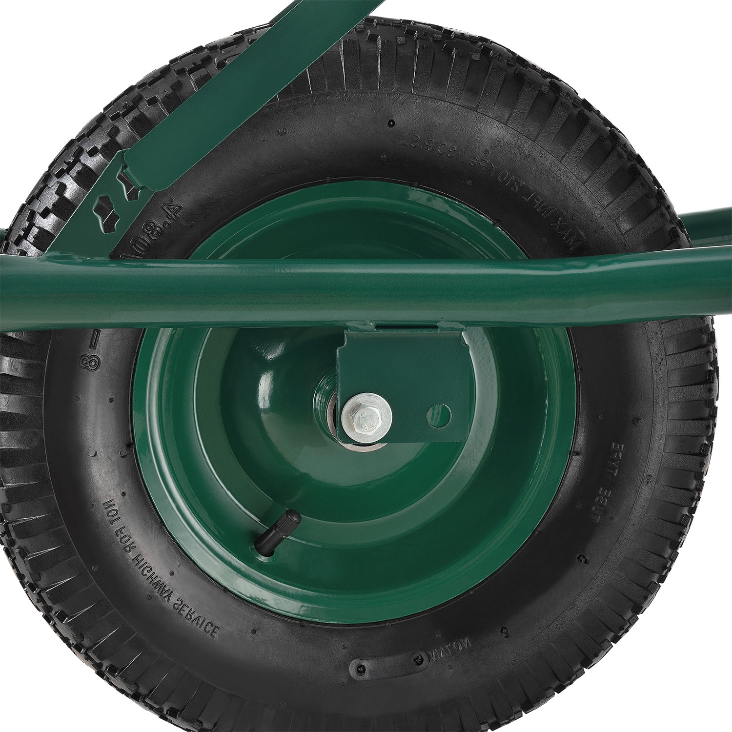 Stalowa rama w kolorze leśnej zieleni wyróżnia się dodatkowym przednim widelcem do stabilizacji wanny i użytecznym wspornikiem. Dzięki temu możesz z łatwością robić krótkie przerwy bez przewracania się wózka ogrodowego. Praktyczny wspornik uchylny ułatwia również opróżnianie wózka.