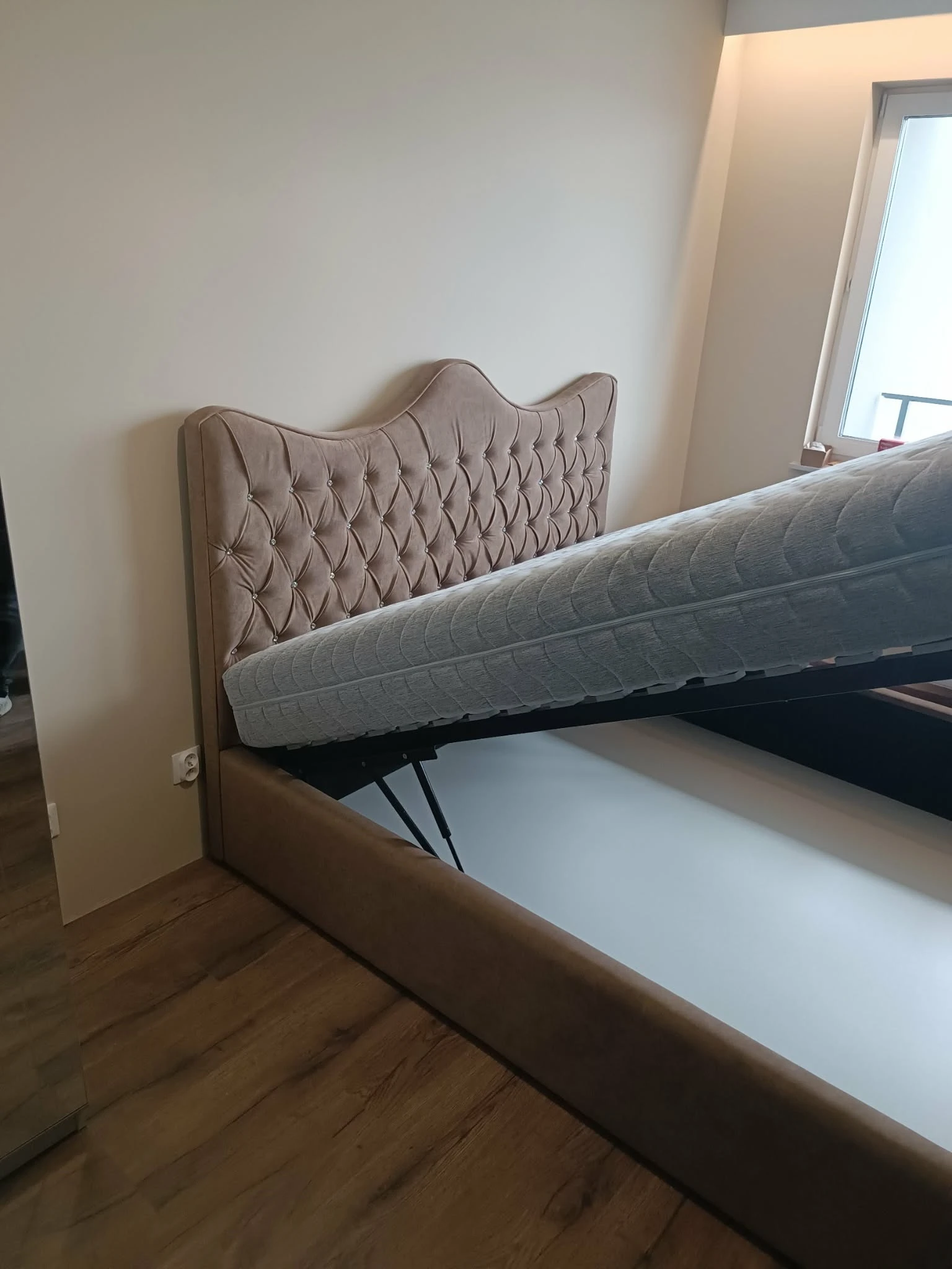 Łóżko tapicerowane z wezgłowiem pikowanym kryształkami wysokim wyposażone w stelaż podnoszony od dłuższej strony lub od krótszej w zależności od wymagań klienta, pod stelażem mamy pojemnik na pościel i nie tylko którego to głębokość uzależniona jest od wysokości boków łózka oraz zastosowanych nóżek . Ściany pojemnika są obite materiałem podbiciowym czarnym. Obite wysokiej jakości materiałem który posłuży użytkownikom przez wiele lat, materiały firmy prohurt.