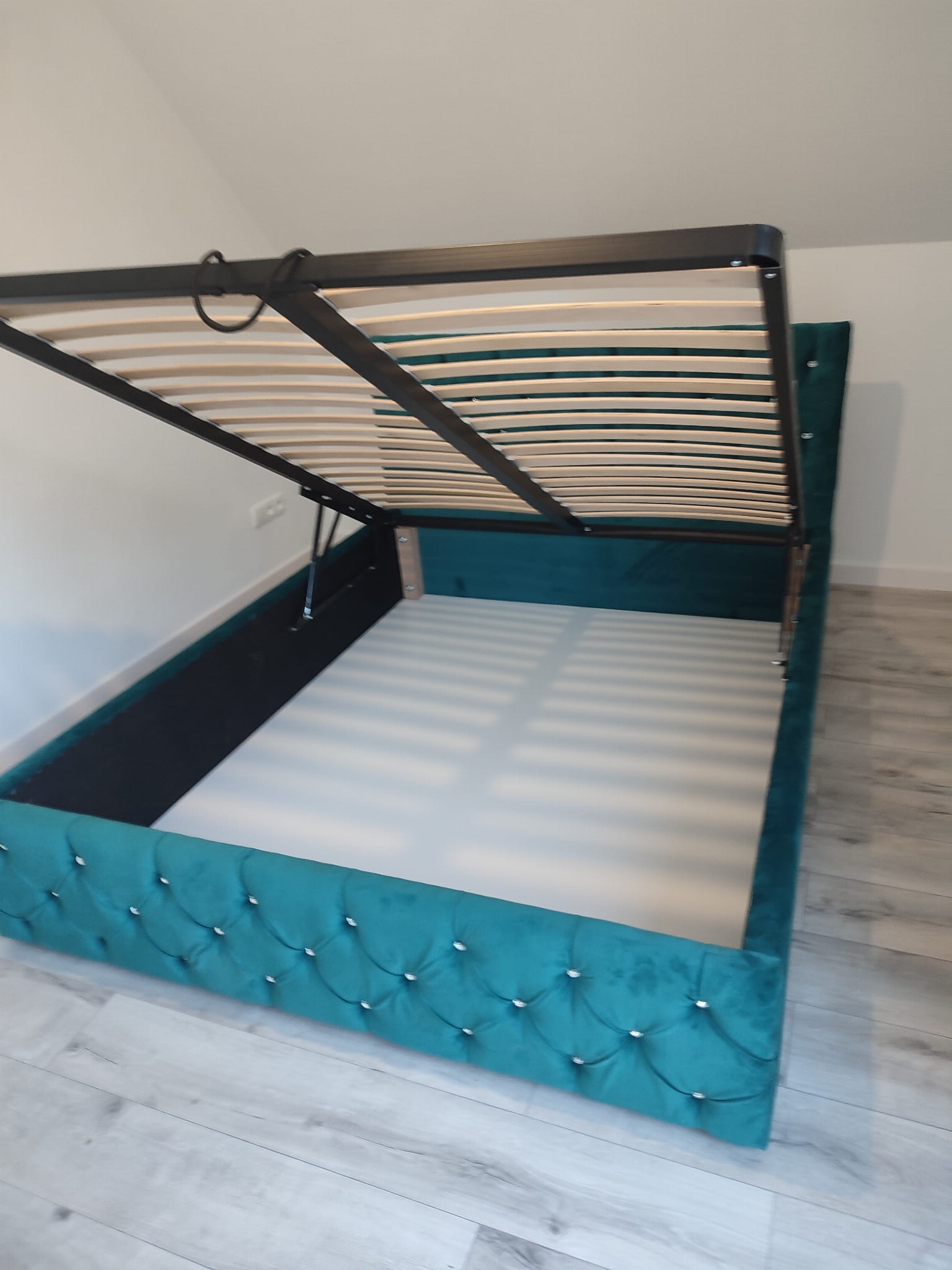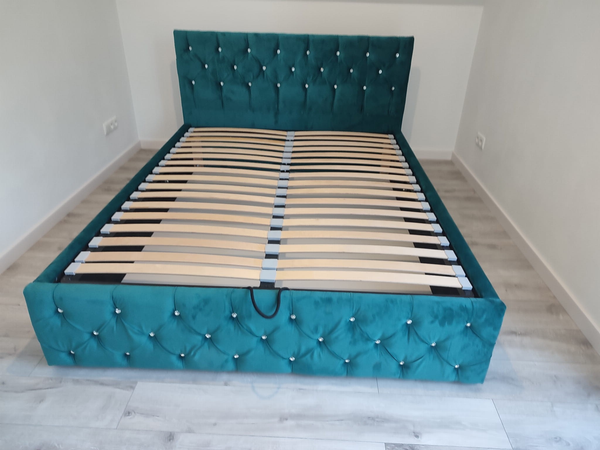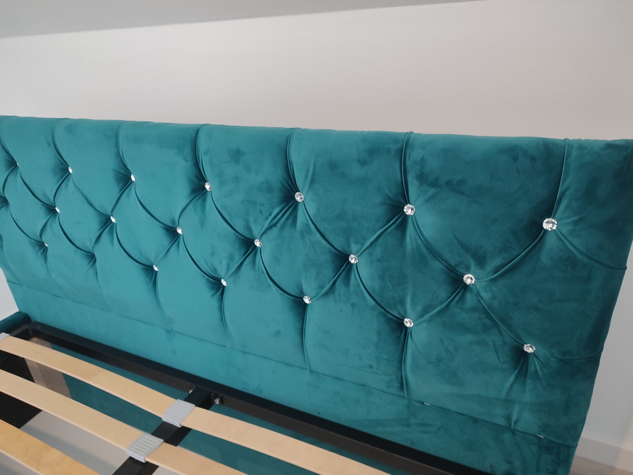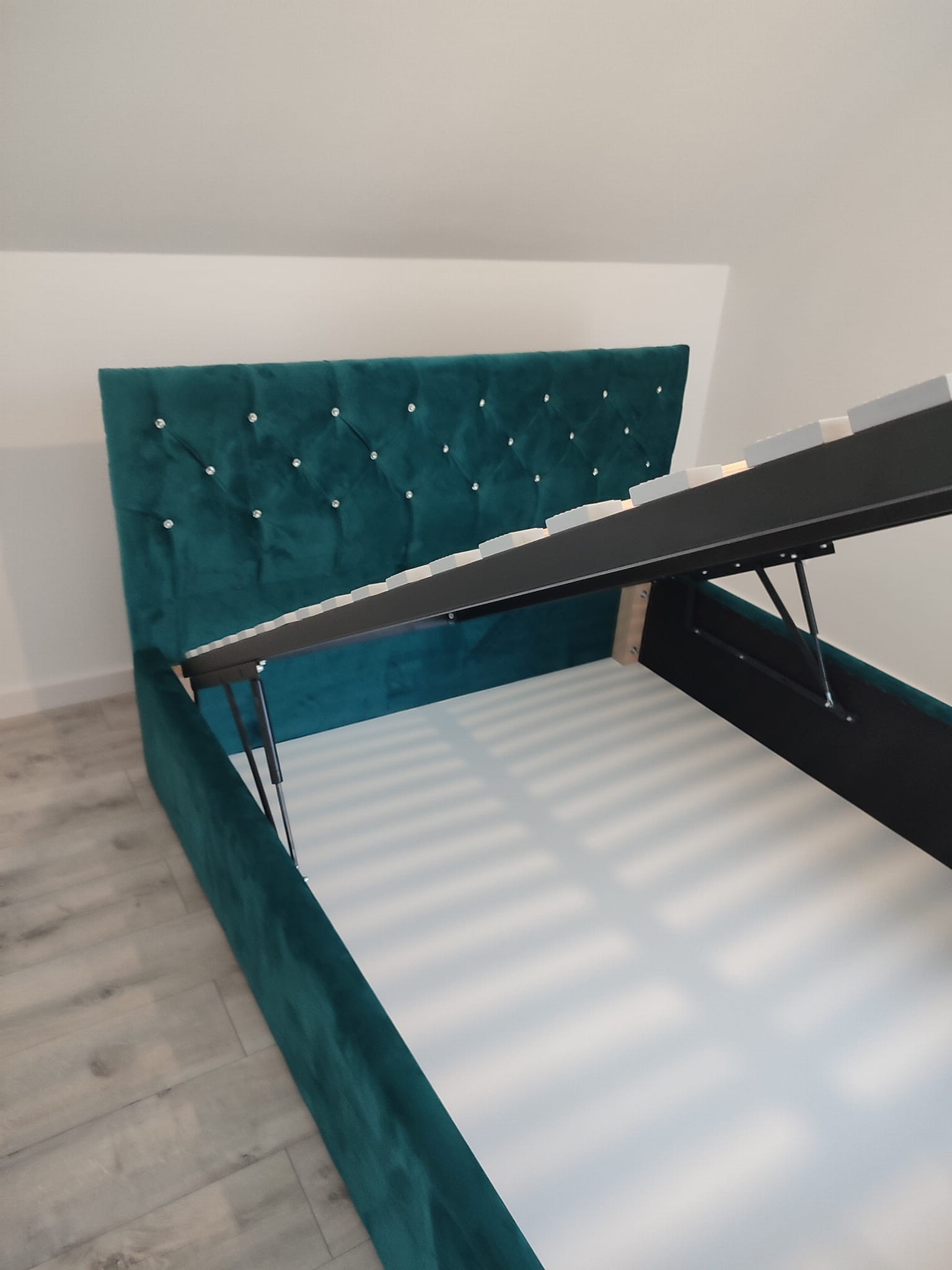 Łóżko tapicerowane z wezgłowiam pikowanym kryształkami wyposażone w stelaż podnoszony od dłuższej strony lub od krótszej w zależności od wymagań klienta, pod stelażem mamy pojemnik na pościel i nie tylko którego to głębokość uzależniona jest od wysokości boków łózka oraz zastosowanych nóżek . Ściany pojemnika są obite materiałem podbiciowym czarnym. Obite wysokiej jakości materiałem który posłuży użytkownikom przez wiele lat, materiały firmy prohurt nazwa materiału IVE.