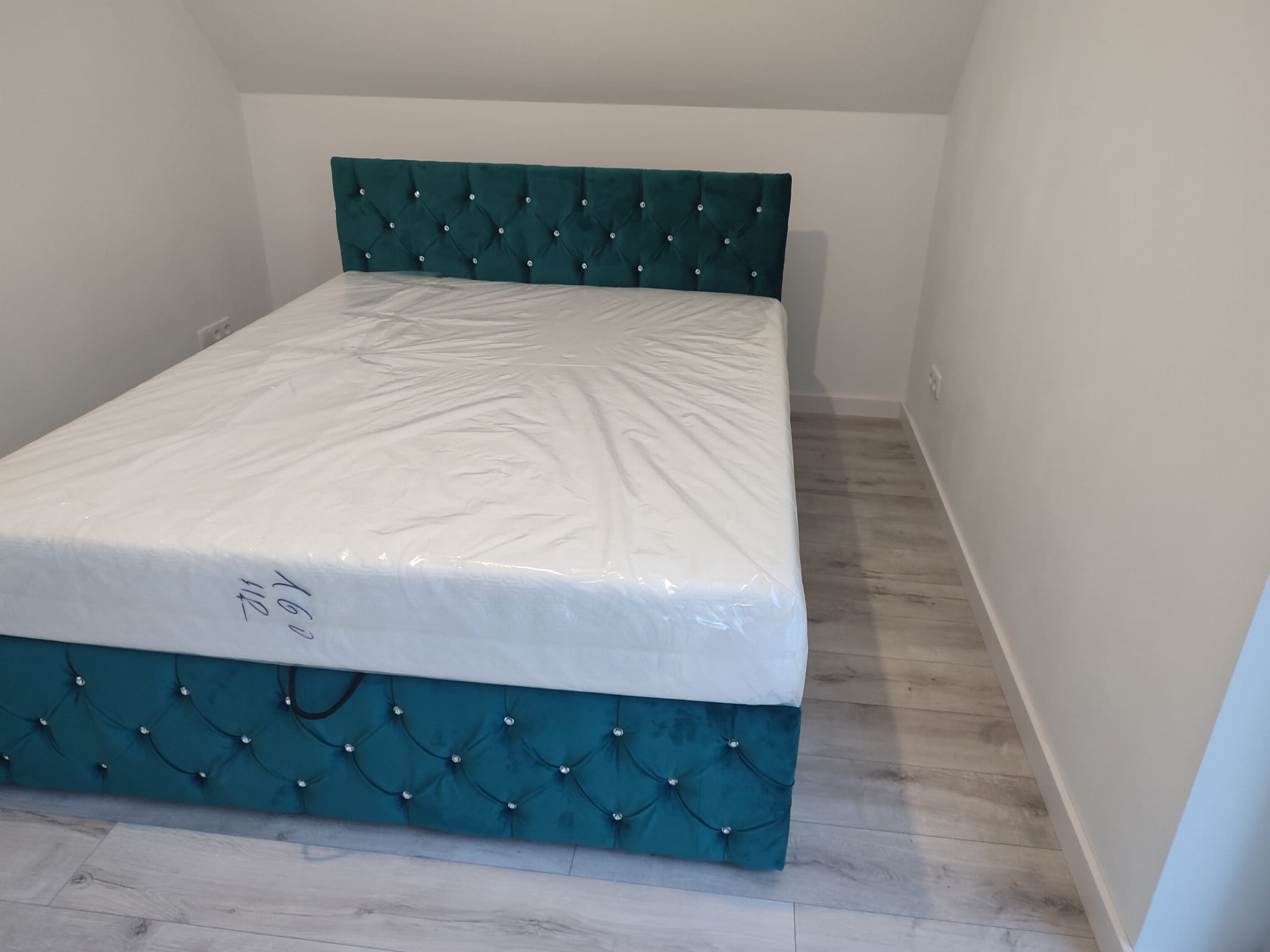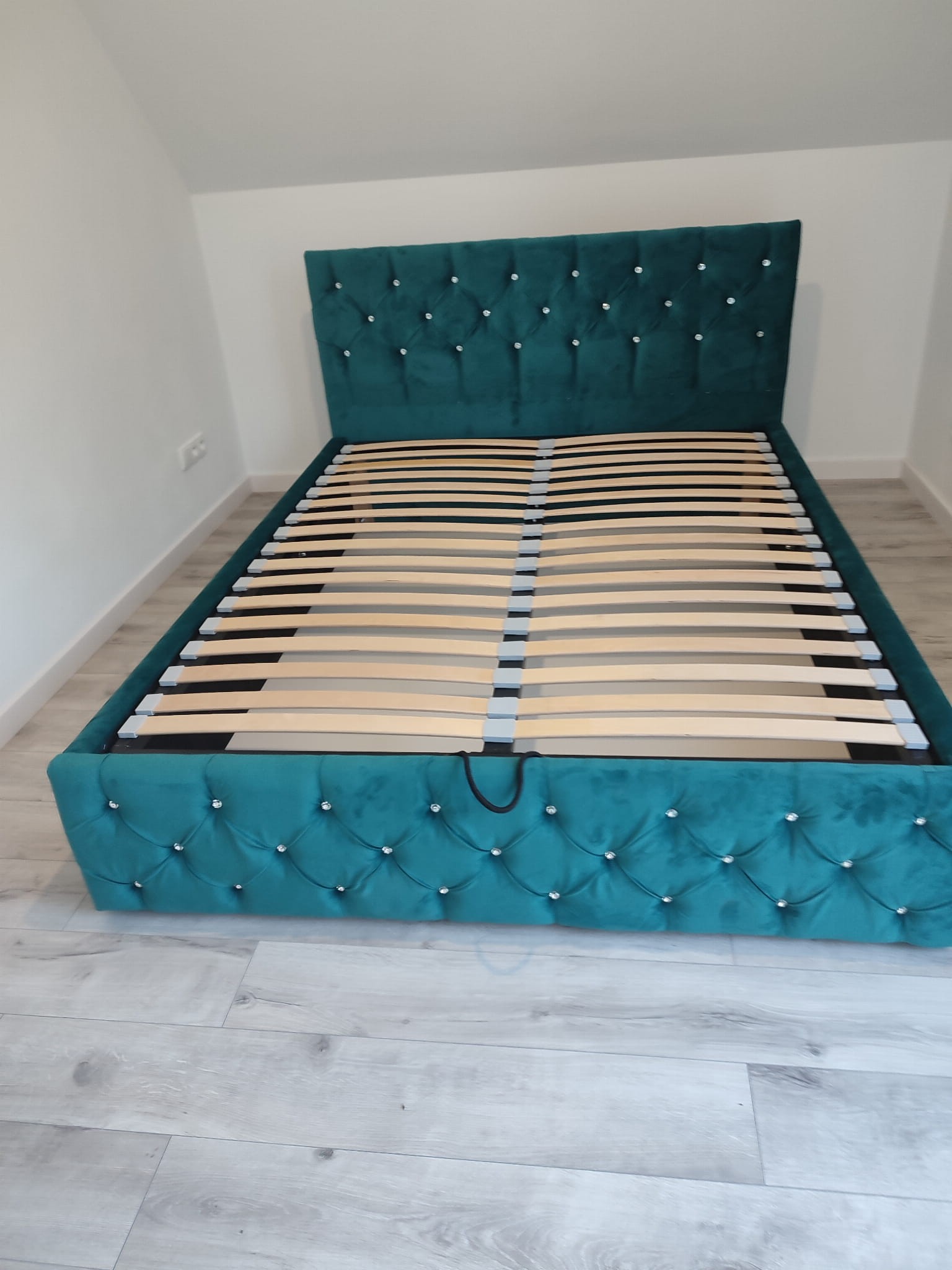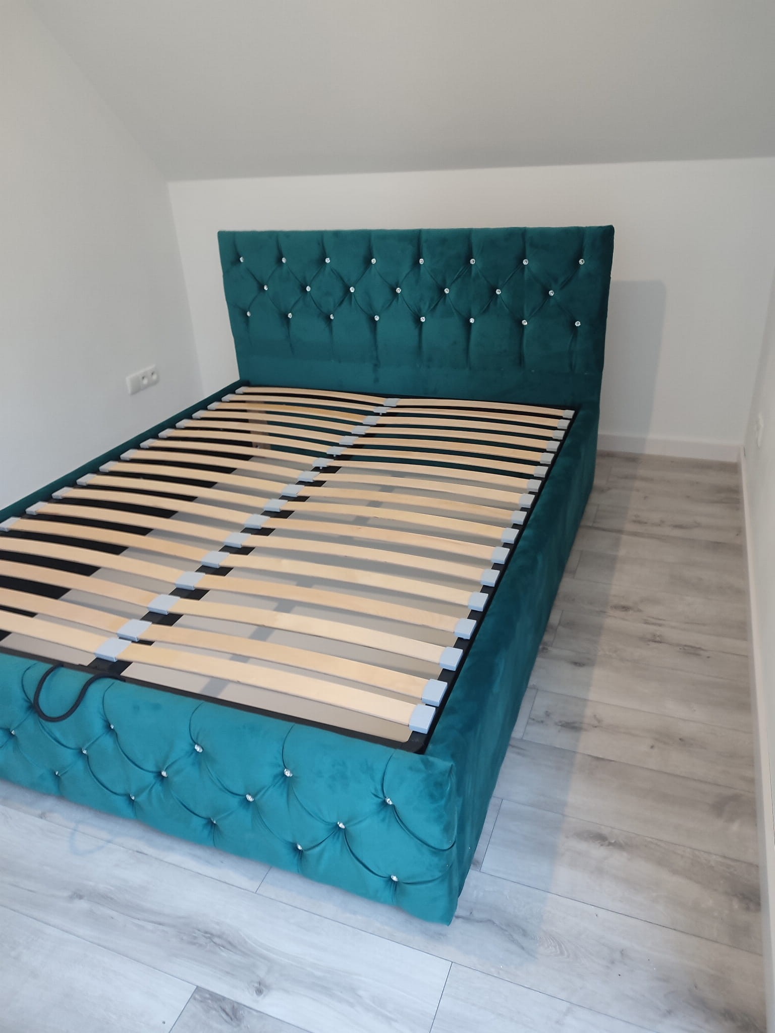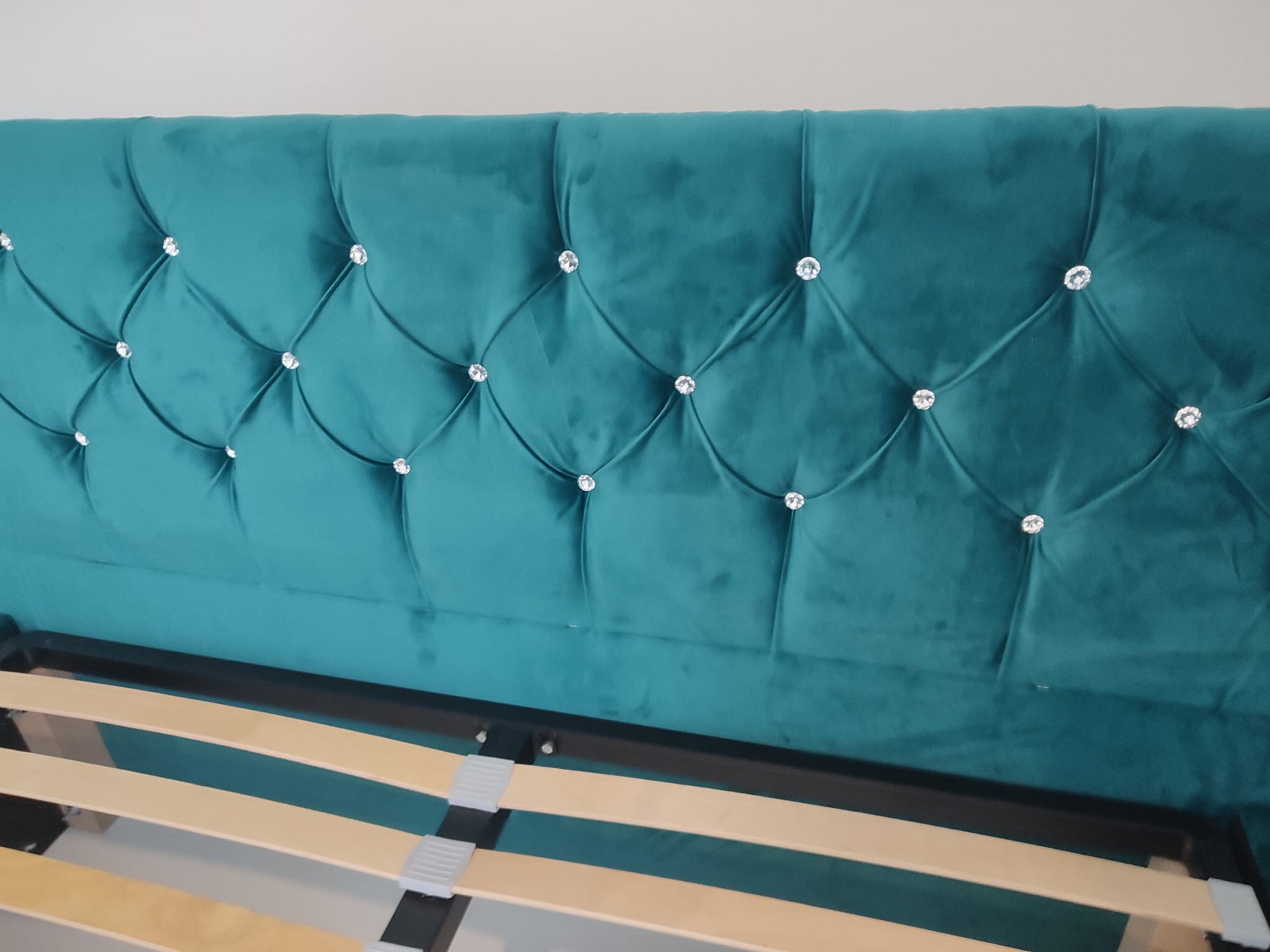 Łóżko tapicerowane z wezgłowiam pikowanym kryształkami wyposażone w stelaż podnoszony od dłuższej strony lub od krótszej w zależności od wymagań klienta, pod stelażem mamy pojemnik na pościel i nie tylko którego to głębokość uzależniona jest od wysokości boków łózka oraz zastosowanych nóżek . Ściany pojemnika są obite materiałem podbiciowym czarnym. Obite wysokiej jakości materiałem który posłuży użytkownikom przez wiele lat, materiały firmy prohurt nazwa materiału IVE.