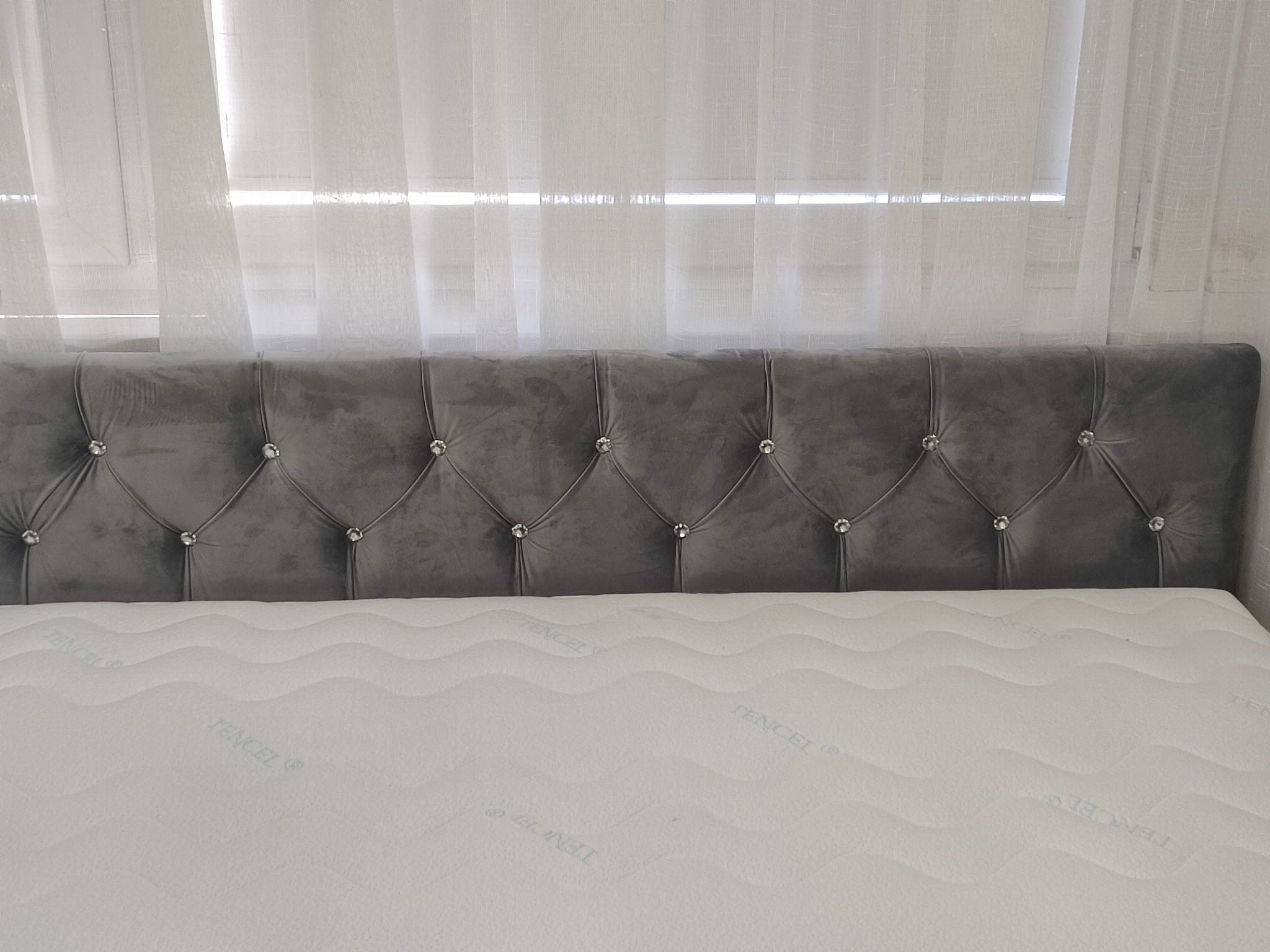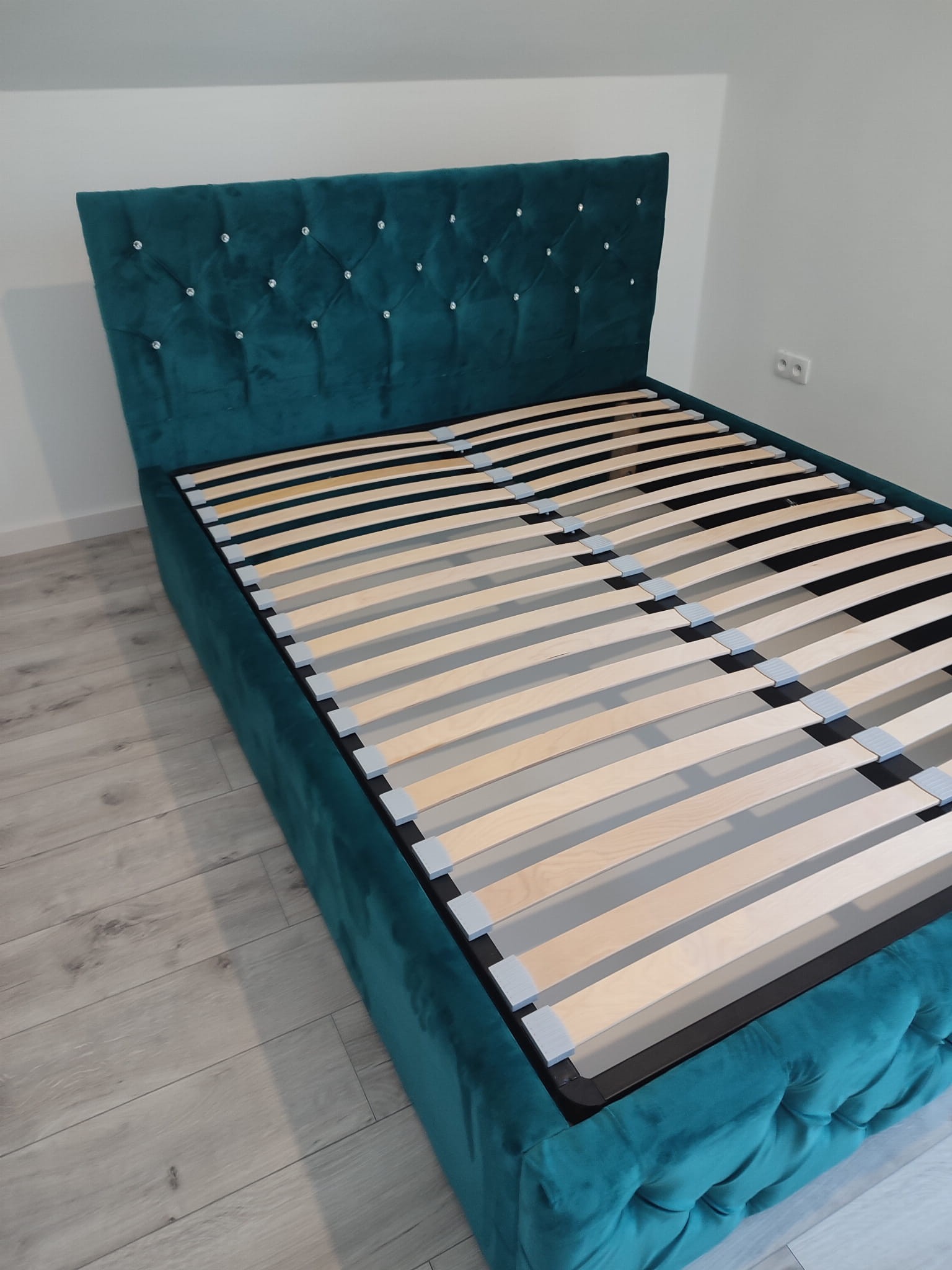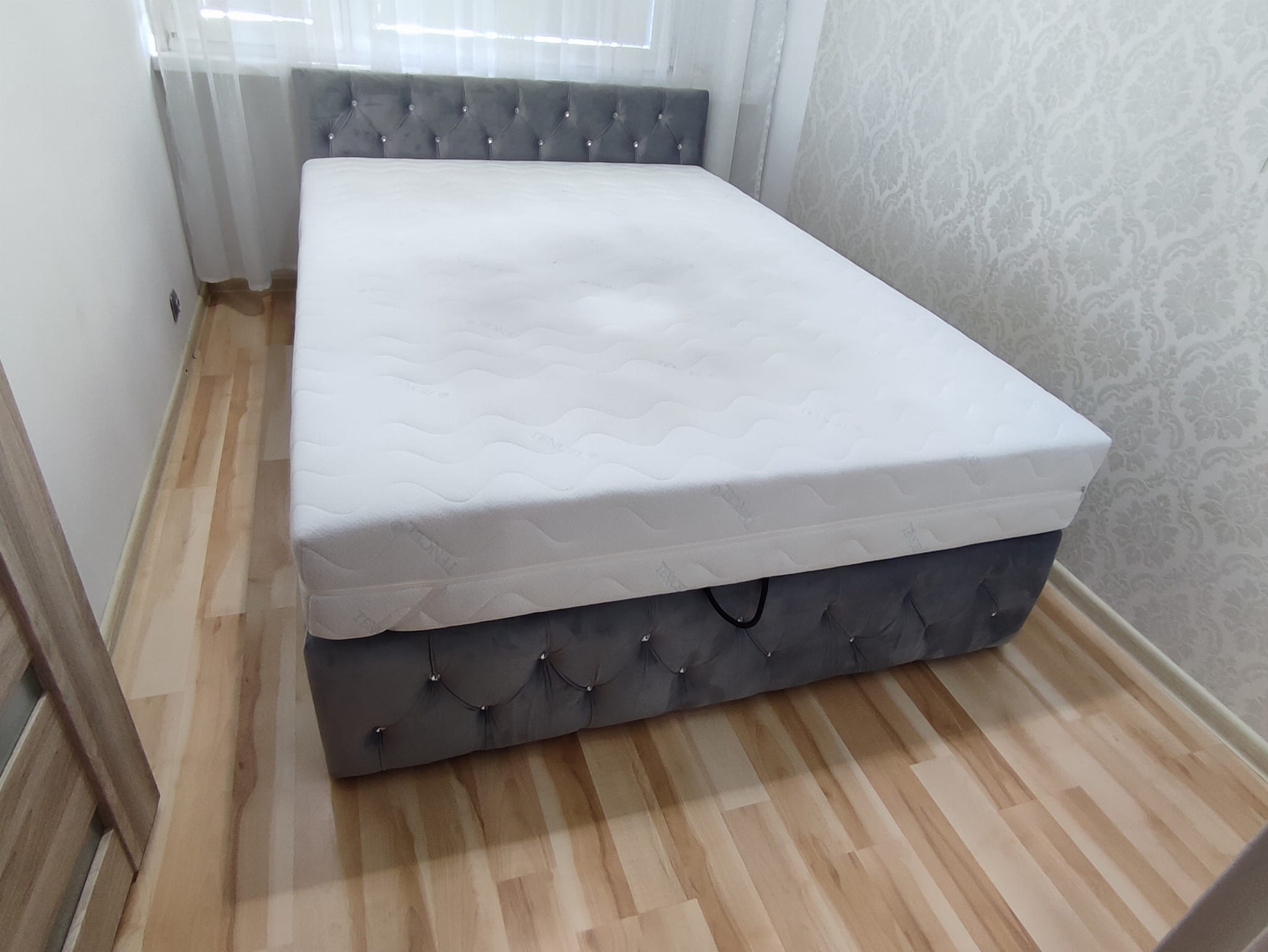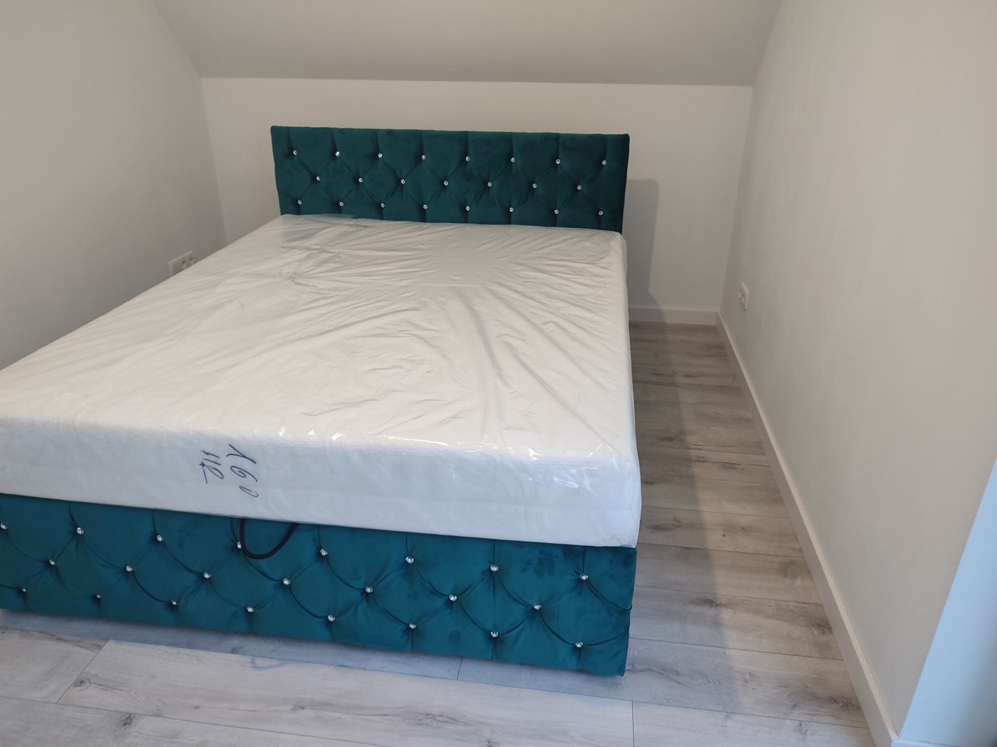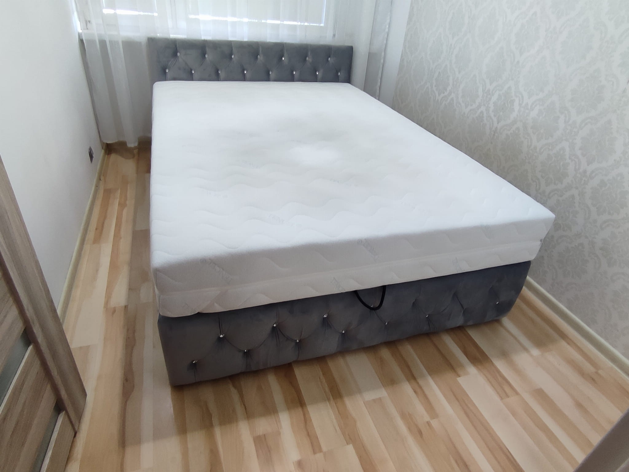 Łóżko tapicerowane z wezgłowiam pikowanym kryształkami wyposażone w stelaż podnoszony od dłuższej strony lub od krótszej w zależności od wymagań klienta, pod stelażem mamy pojemnik na pościel i nie tylko którego to głębokość uzależniona jest od wysokości boków łózka oraz zastosowanych nóżek . Ściany pojemnika są obite materiałem podbiciowym czarnym. Obite wysokiej jakości materiałem który posłuży użytkownikom przez wiele lat, materiały firmy prohurt nazwa materiału IVE.