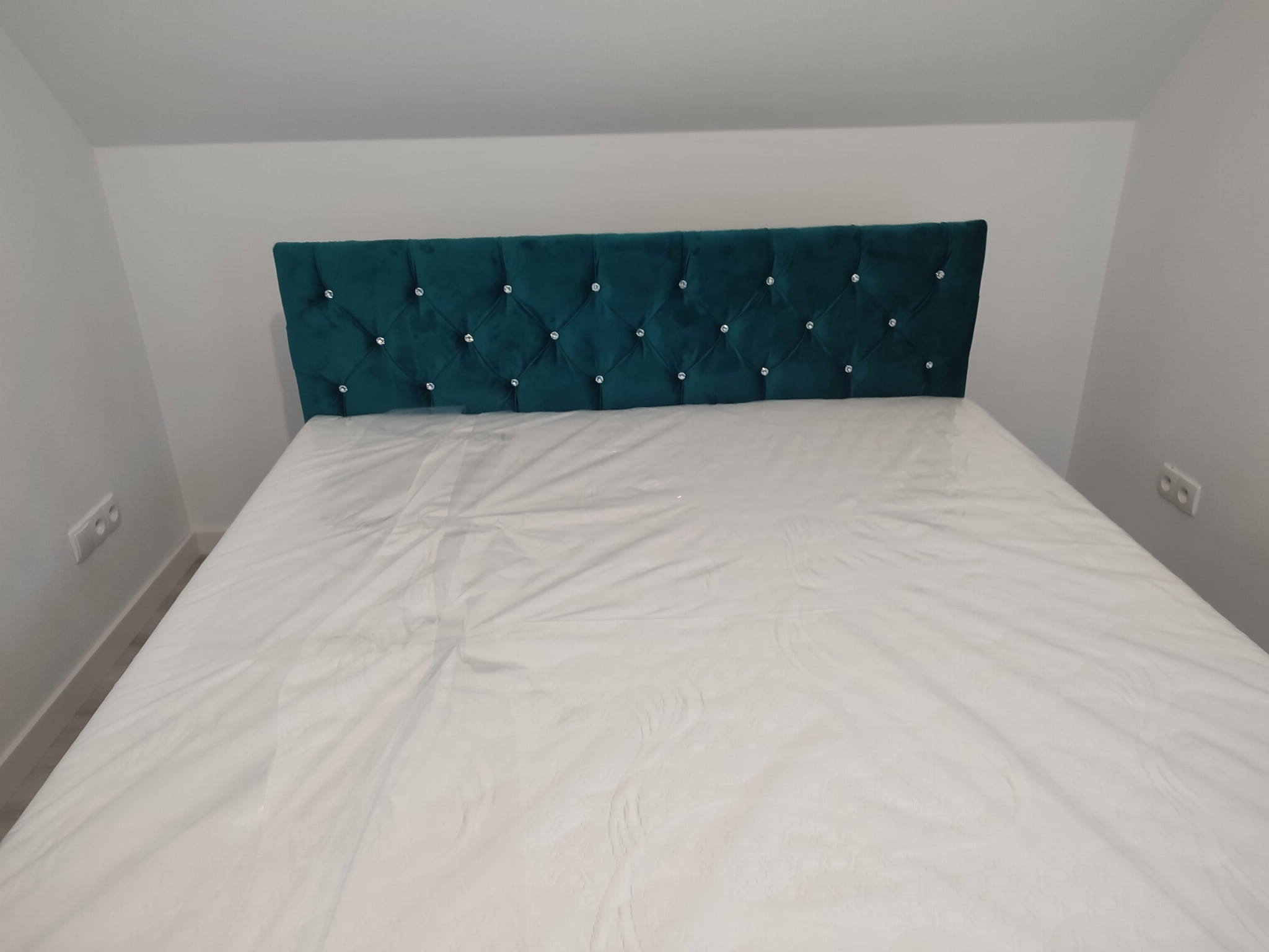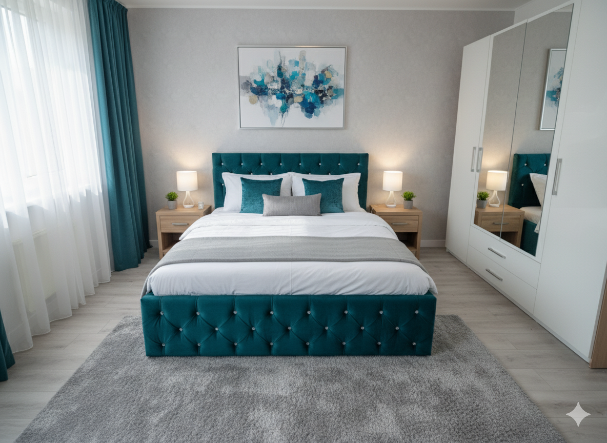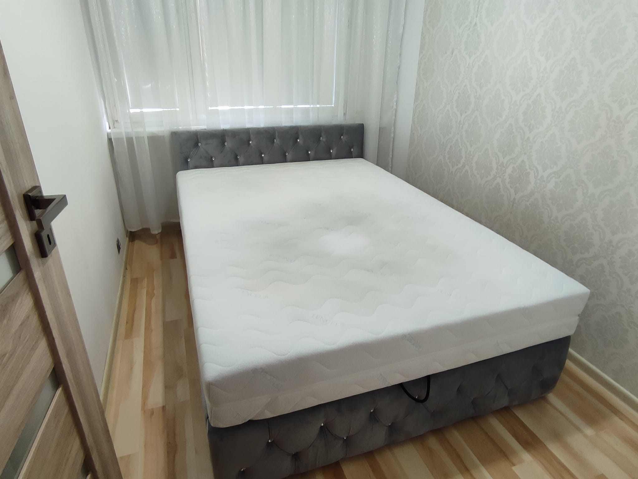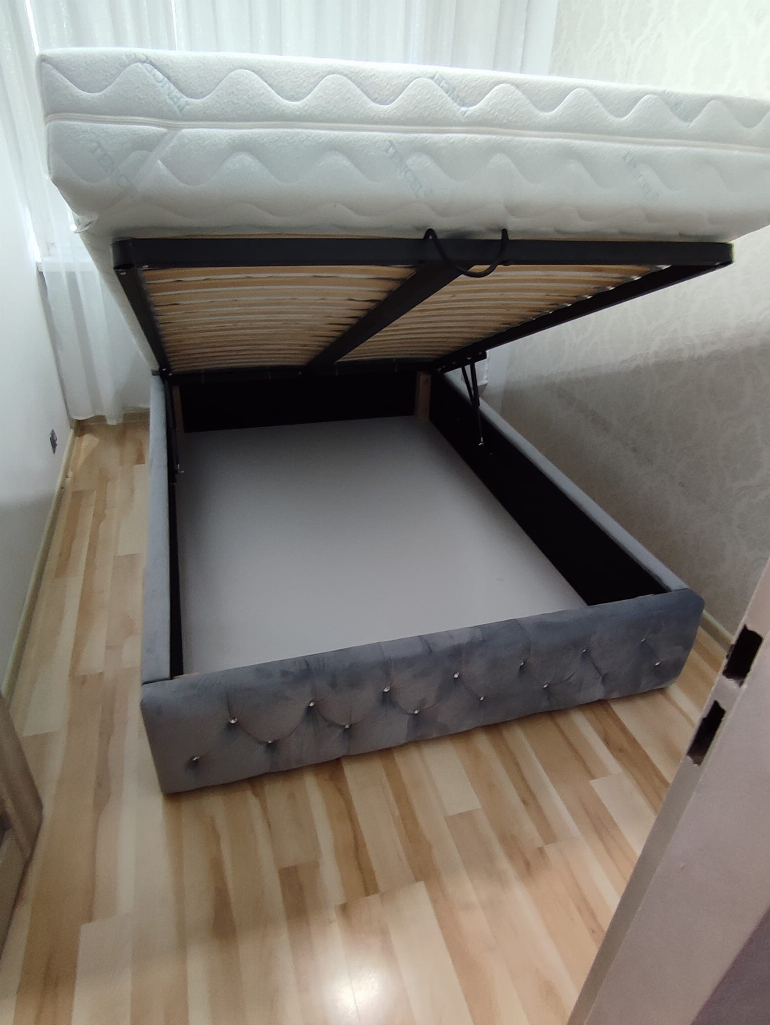 Łóżko tapicerowane z wezgłowiam pikowanym kryształkami wyposażone w stelaż podnoszony od dłuższej strony lub od krótszej w zależności od wymagań klienta, pod stelażem mamy pojemnik na pościel i nie tylko którego to głębokość uzależniona jest od wysokości boków łózka oraz zastosowanych nóżek . Ściany pojemnika są obite materiałem podbiciowym czarnym. Obite wysokiej jakości materiałem który posłuży użytkownikom przez wiele lat, materiały firmy prohurt nazwa materiału IVE.