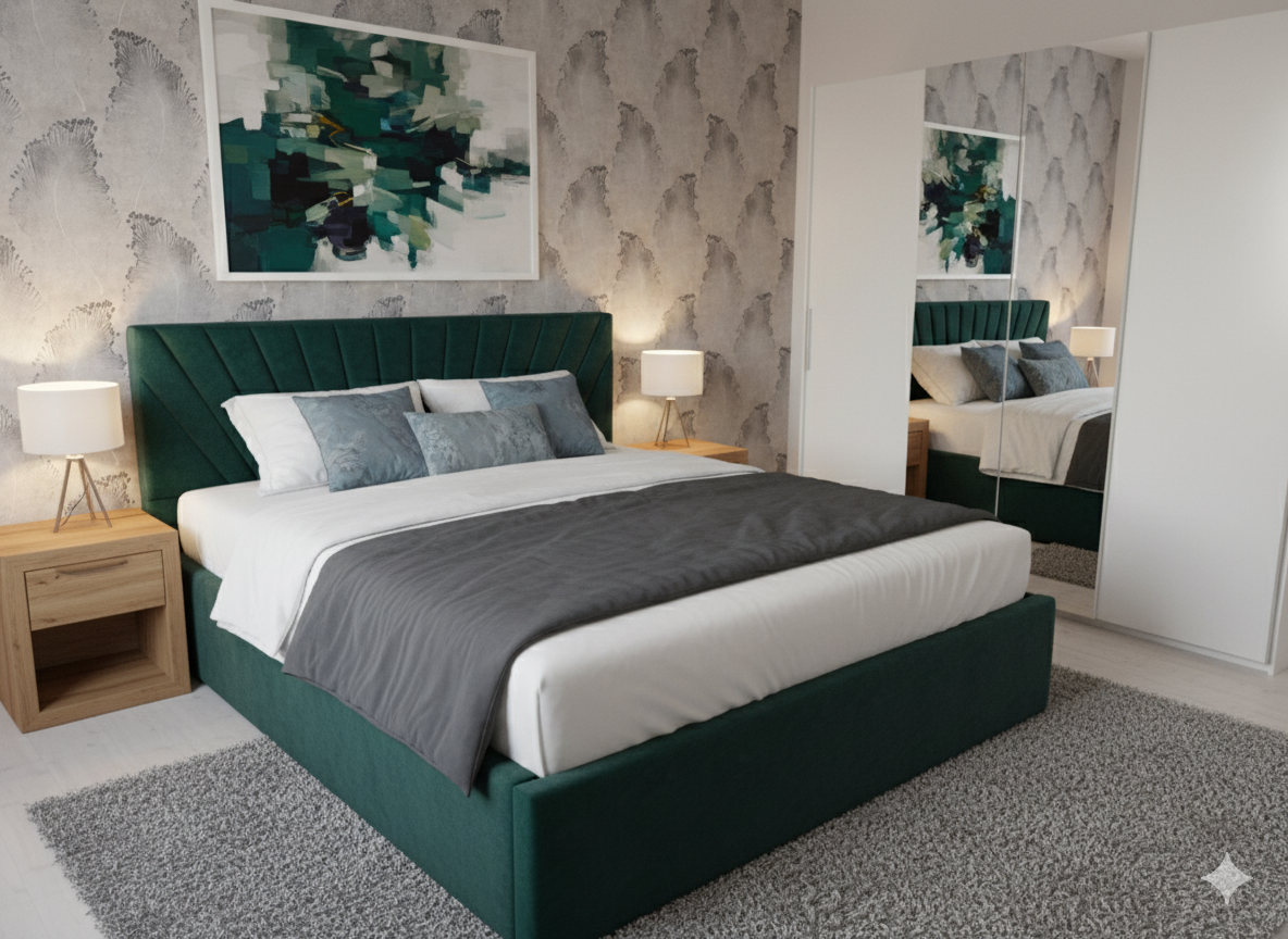 Łóżko tapicerowane z wezgłowiam w tzw. słoneczko bez obrysu wyposażone w stelaż podnoszony od dłuższej strony lub od krótszej w zależności od wymagań klienta, pod stelażem mamy pojemnik na pościel i nie tylko którego to głębokość uzależniona jest od wysokości boków łózka oraz zastosowanych nóżek . Ściany pojemnika są obite materiałem podbiciowym czarnym. Obite wysokiej jakości materiałem który posłuży użytkownikom przez wiele lat, materiały firmy prohurt nazwa materiału IVE.