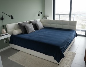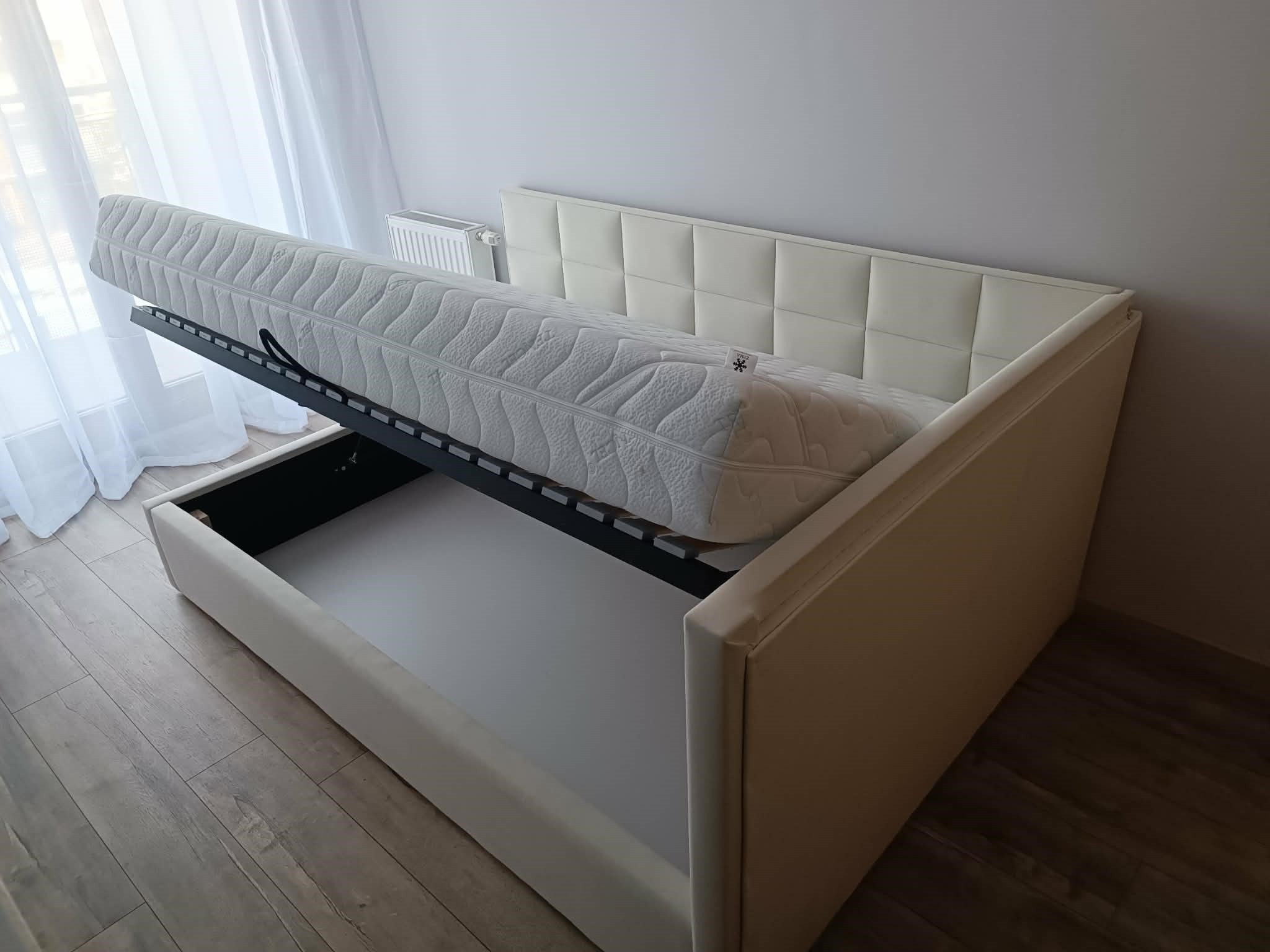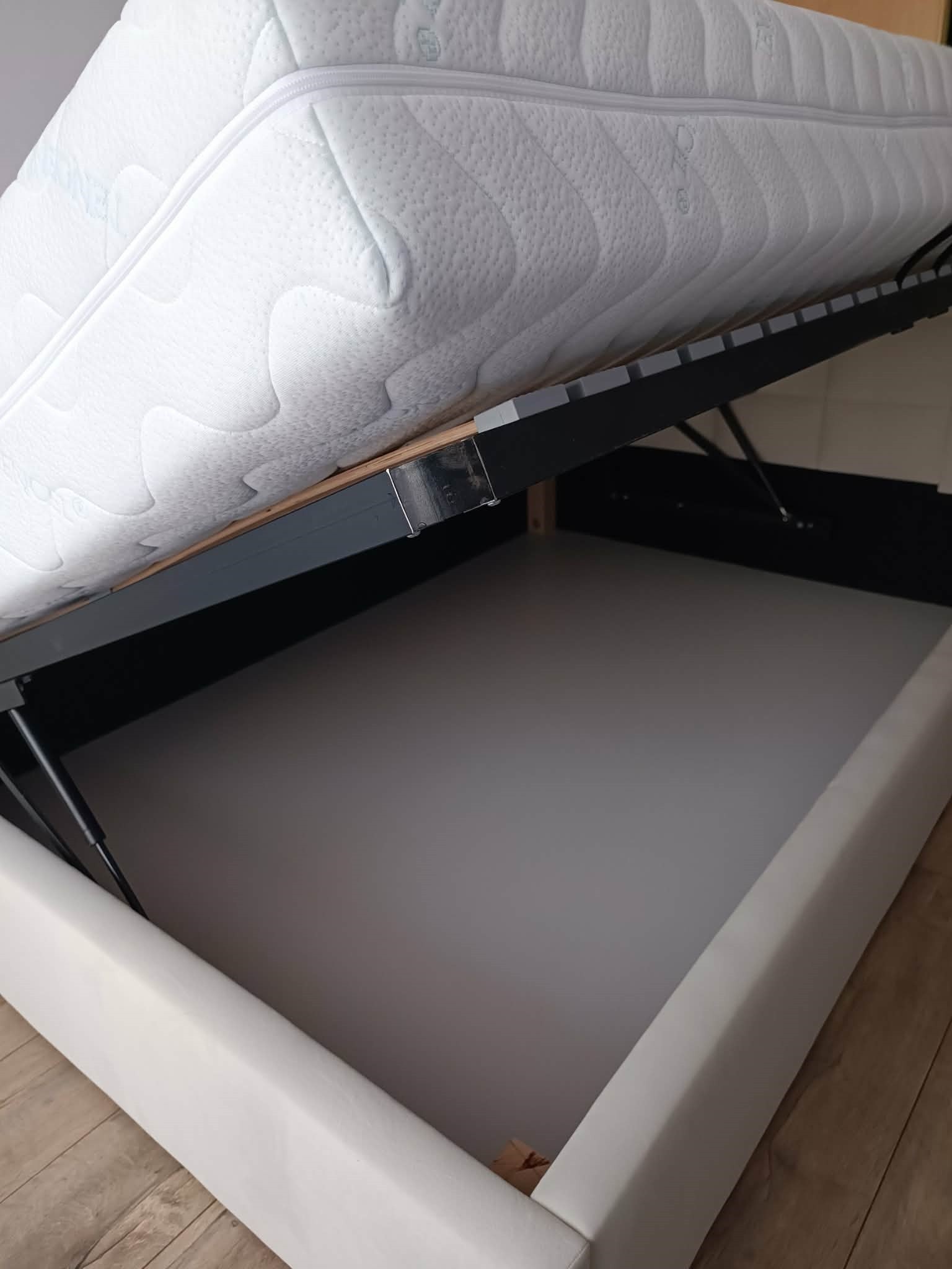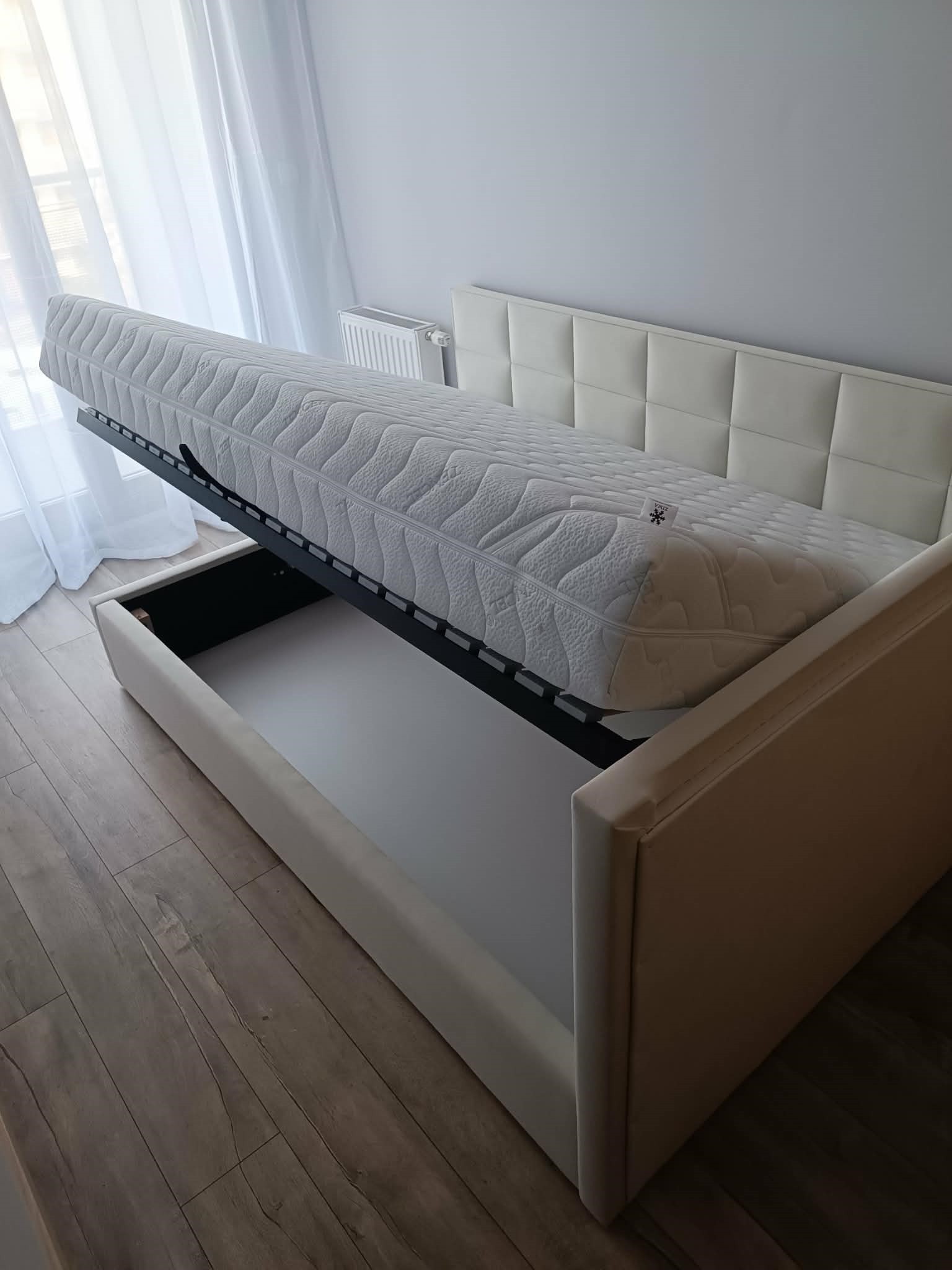 Łóżko tapicerowane narożne z wezgłowiami w kwadraty wyposażone w stelaż podnoszony od dłuższej strony lub od krótszej w zależności od wymagań klienta, pod stelażem mamy pojemnik na pościel i nie tylko którego to głębokość uzależniona jest od wysokości boków łózka oraz zastosowanych nóżek . Ściany pojemnika są obite materiałem podbiciowym czarnym. Obite wysokiej jakości materiałem który posłuży użytkownikom przez wiele lat, materiały firmy prohurt