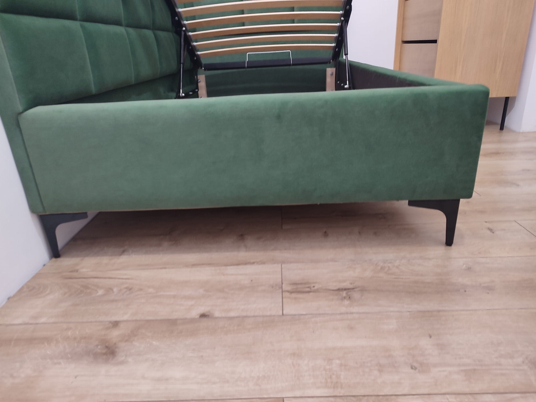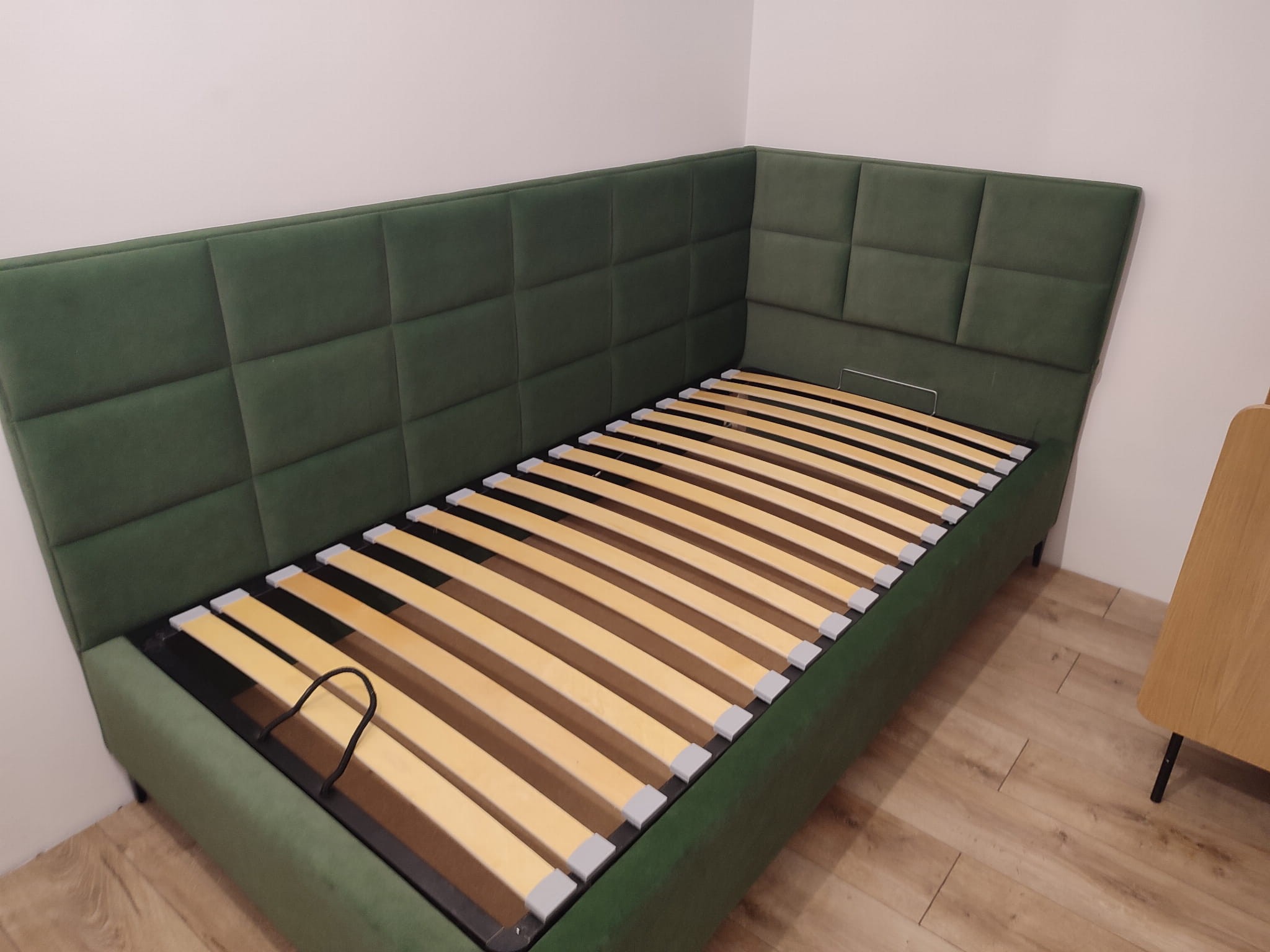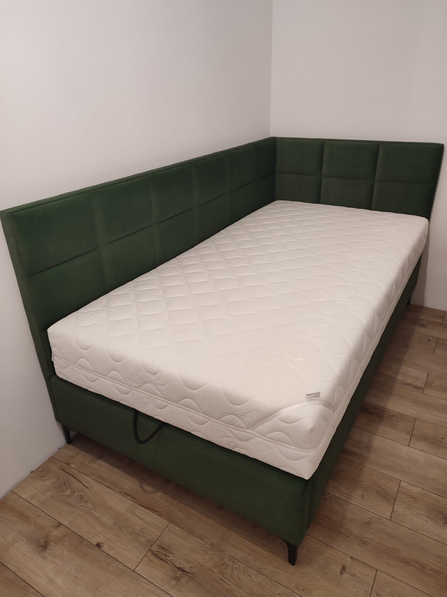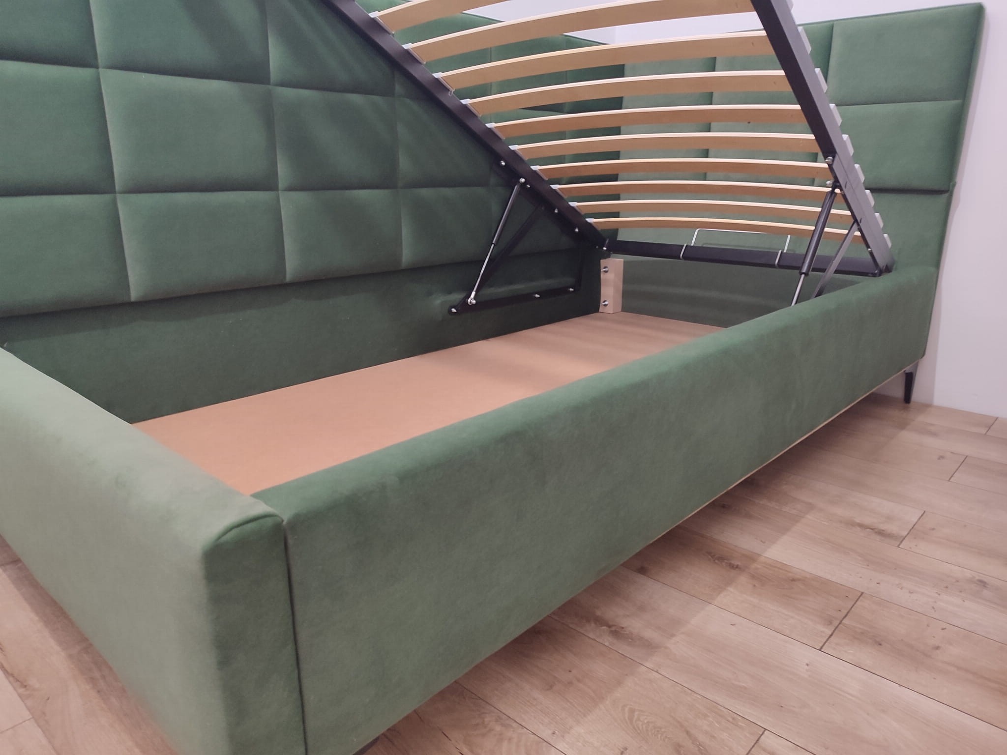 Łóżko tapicerowane narożne z wezgłowiami w kwadraty wyposażone w stelaż podnoszony od dłuższej strony lub od krótszej w zależności od wymagań klienta, pod stelażem mamy pojemnik na pościel i nie tylko którego to głębokość uzależniona jest od wysokości boków łózka oraz zastosowanych nóżek . Ściany pojemnika są obite materiałem podbiciowym czarnym. Obite wysokiej jakości materiałem który posłuży użytkownikom przez wiele lat, materiały firmy prohurt nazwa materiału IVE.