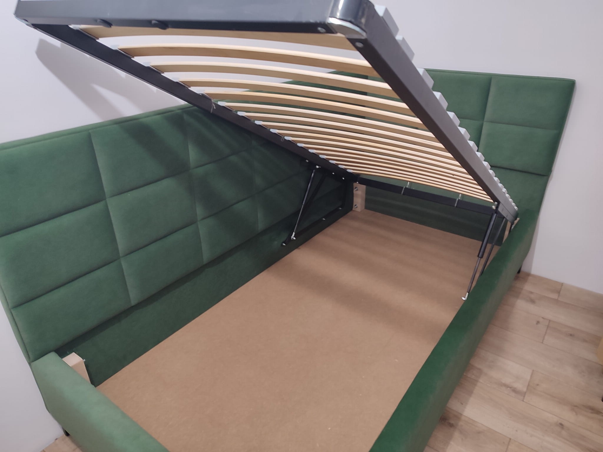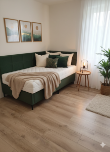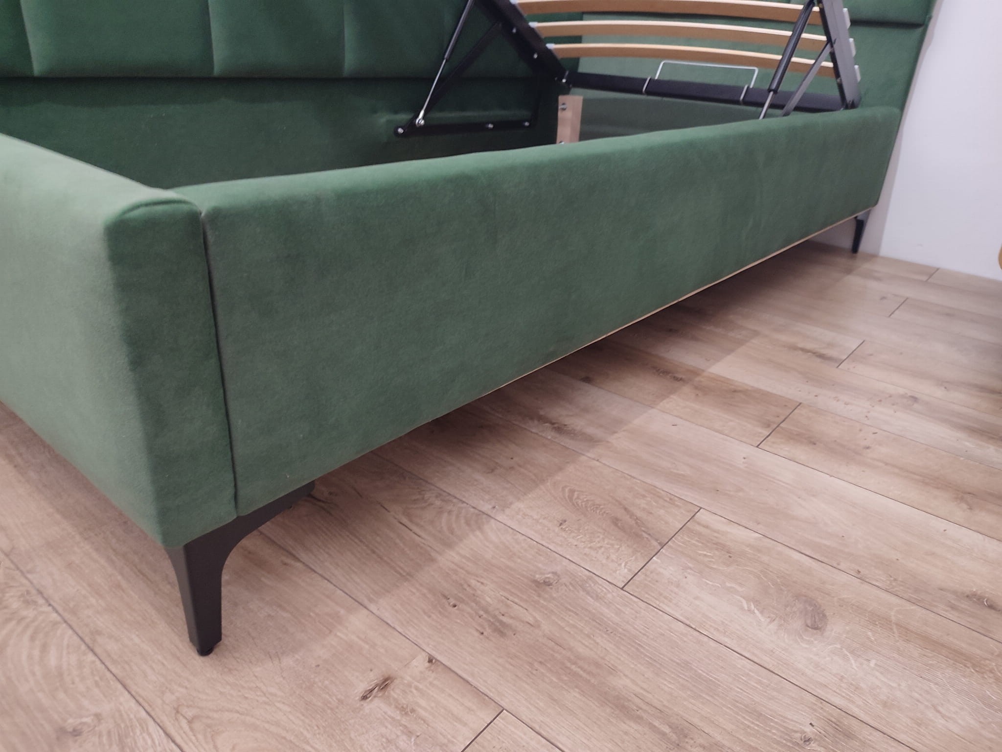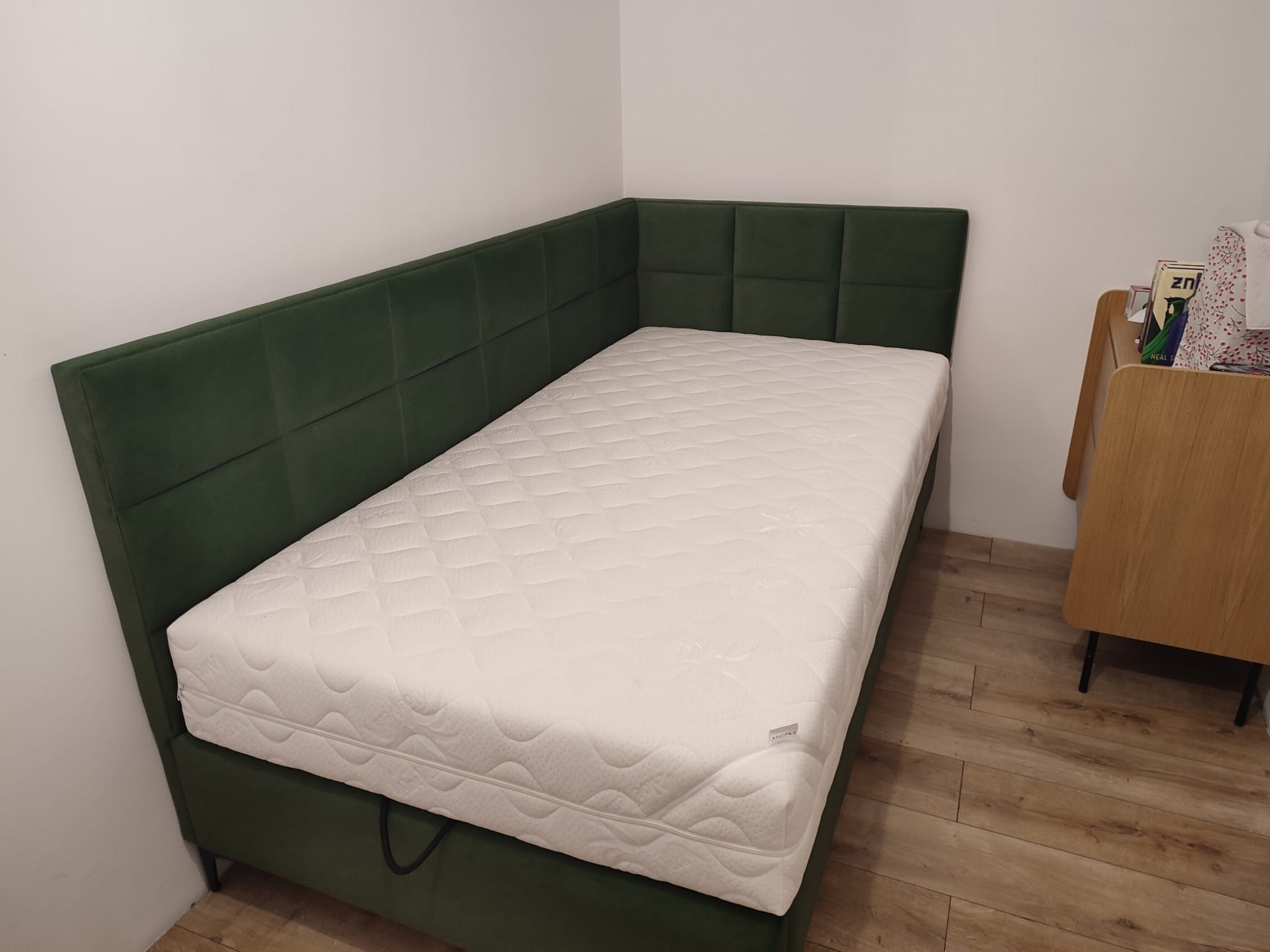 Łóżko tapicerowane narożne z wezgłowiami w kwadraty wyposażone w stelaż podnoszony od dłuższej strony lub od krótszej w zależności od wymagań klienta, pod stelażem mamy pojemnik na pościel i nie tylko którego to głębokość uzależniona jest od wysokości boków łózka oraz zastosowanych nóżek . Ściany pojemnika są obite materiałem podbiciowym czarnym. Obite wysokiej jakości materiałem który posłuży użytkownikom przez wiele lat, materiały firmy prohurt nazwa materiału IVE.