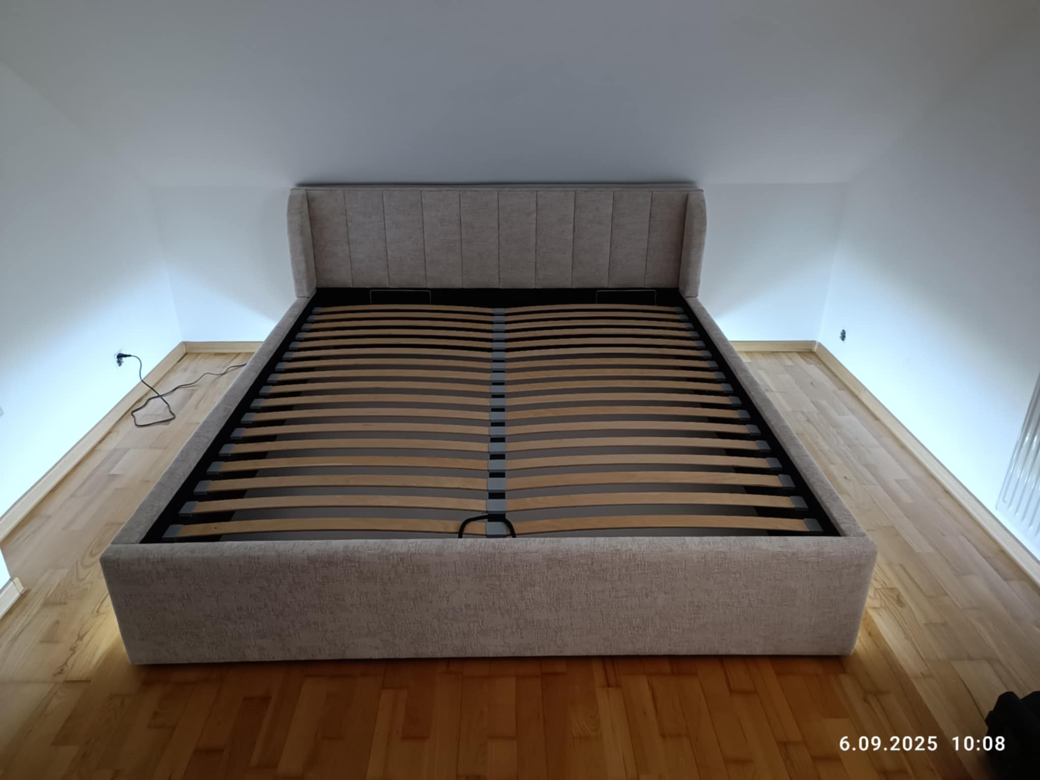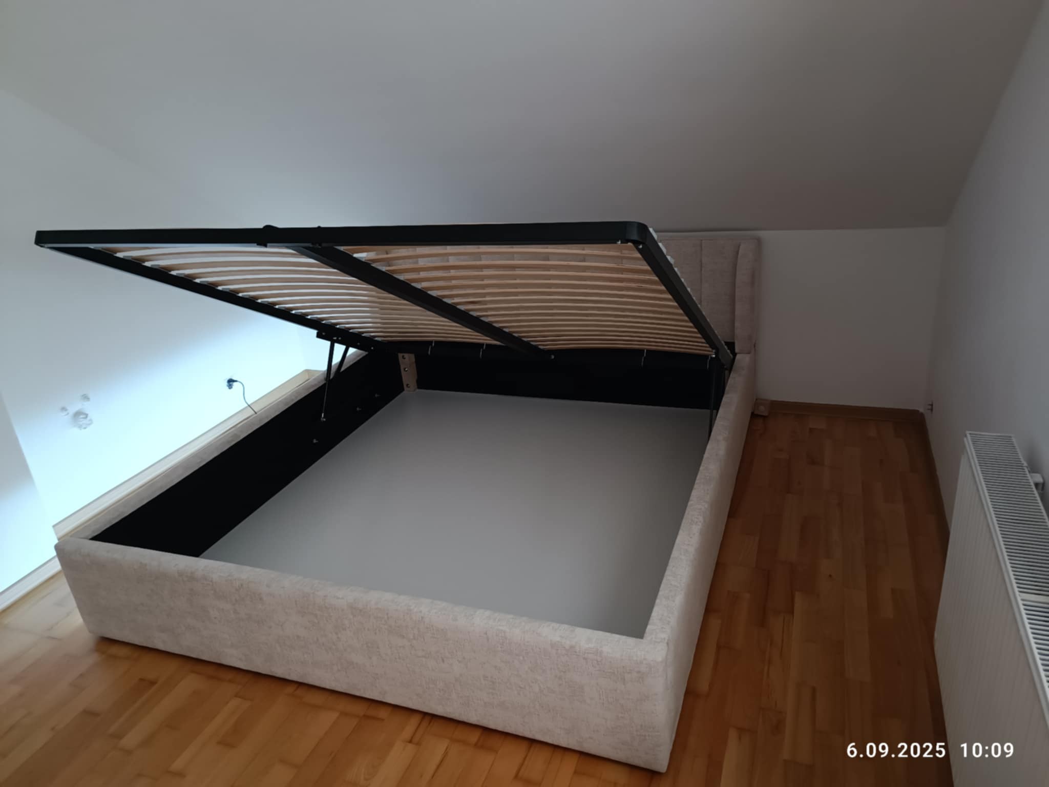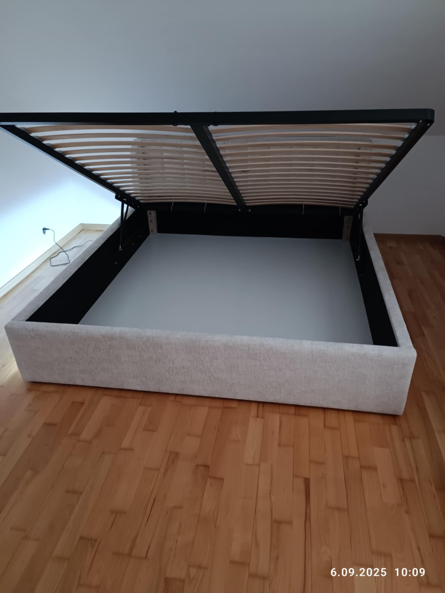 Łóżko tapicerowane z wezgłowiam w pasy szerokie i i boki tzw. uszatek z podświetleniem LED w dolnej części sterowane za pomocą pilota jak i na czujnik ruchu co jest bardzo wygodne bo wstając w nocy światło samo się zapala wyposażone w stelaż podnoszony od dłuższej strony lub od krótszej w zależności od wymagań klienta, pod stelażem mamy pojemnik na pościel i nie tylko którego to głębokość uzależniona jest od wysokości boków łózka oraz zastosowanych nóżek . Ściany pojemnika są obite materiałem podbiciowym czarnym. Obite wysokiej jakości materiałem który posłuży użytkownikom przez wiele lat, materiały firmy prohurt.