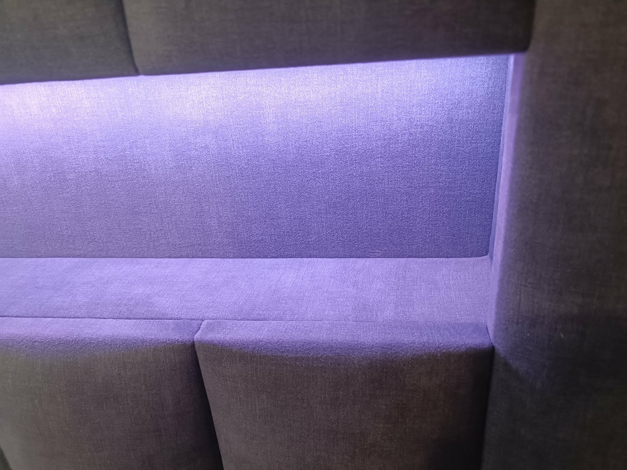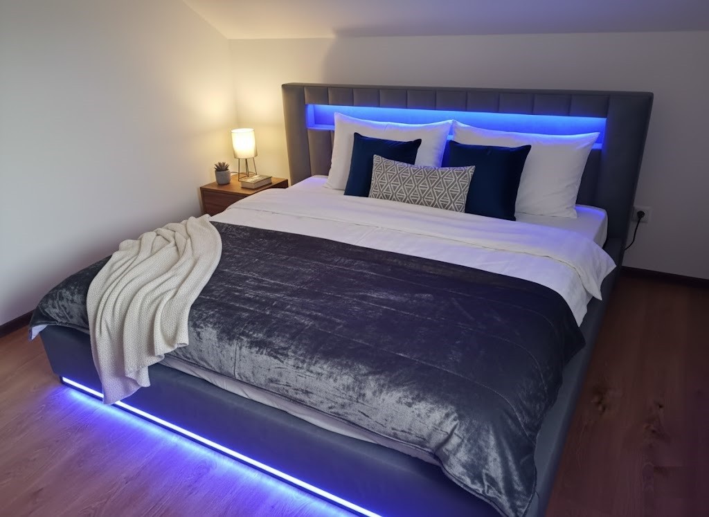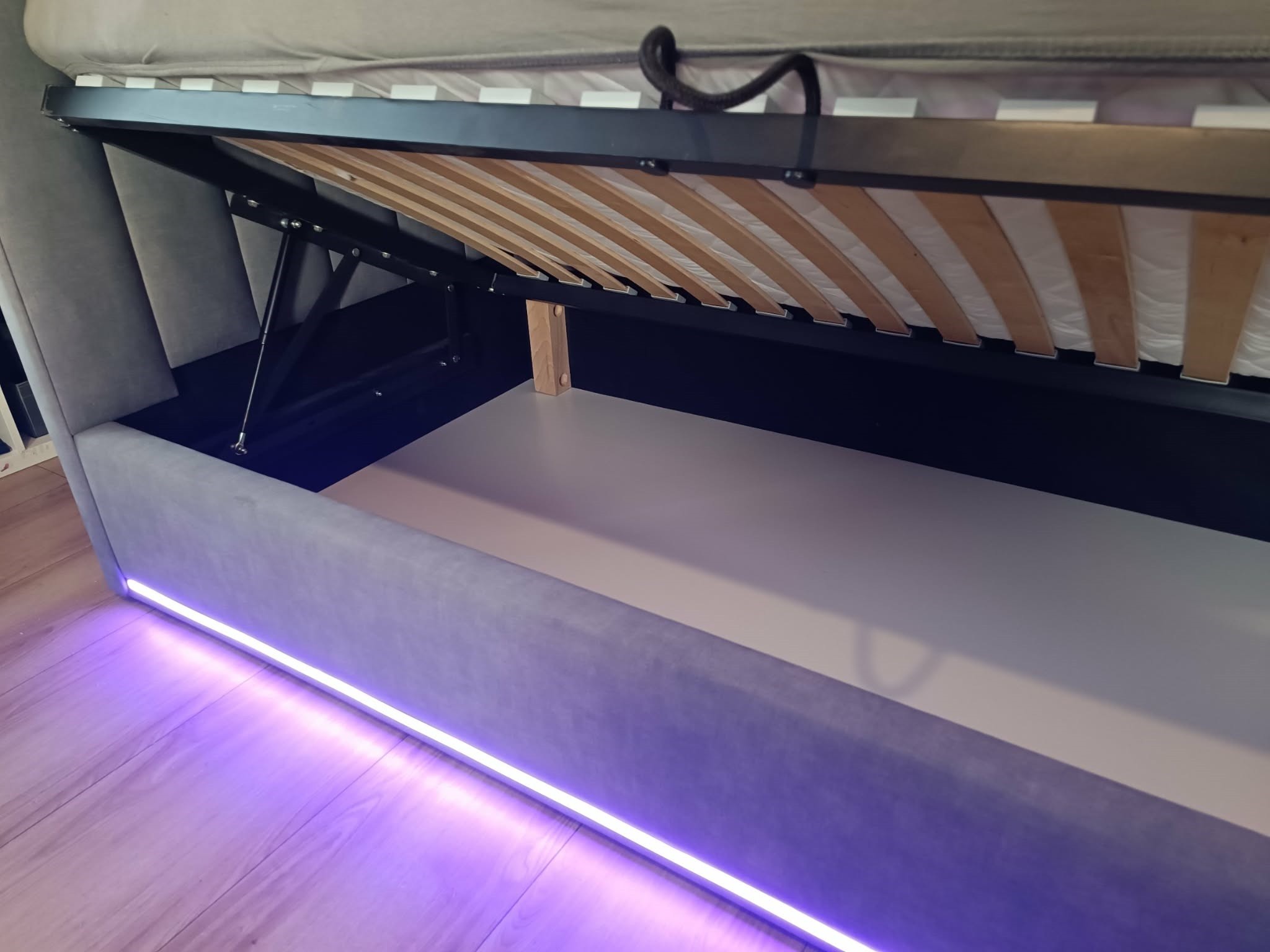 Łóżko tapicerowane z wezgłowiam w pasy z szeroką półką w dłuższym zagłowiu z podświetleniem LED w dolnej oraz górnej części sterowane za pomocą pilota. Wyposażone w stelaż podnoszony od dłuższej strony lub od krótszej w zależności od wymagań klienta, pod stelażem mamy pojemnik na pościel i nie tylko którego to głębokość uzależniona jest od wysokości boków łózka oraz zastosowanych nóżek . Ściany pojemnika są obite materiałem podbiciowym czarnym. Obite wysokiej jakości materiałem który posłuży użytkownikom przez wiele lat, materiały firmy prohurt.