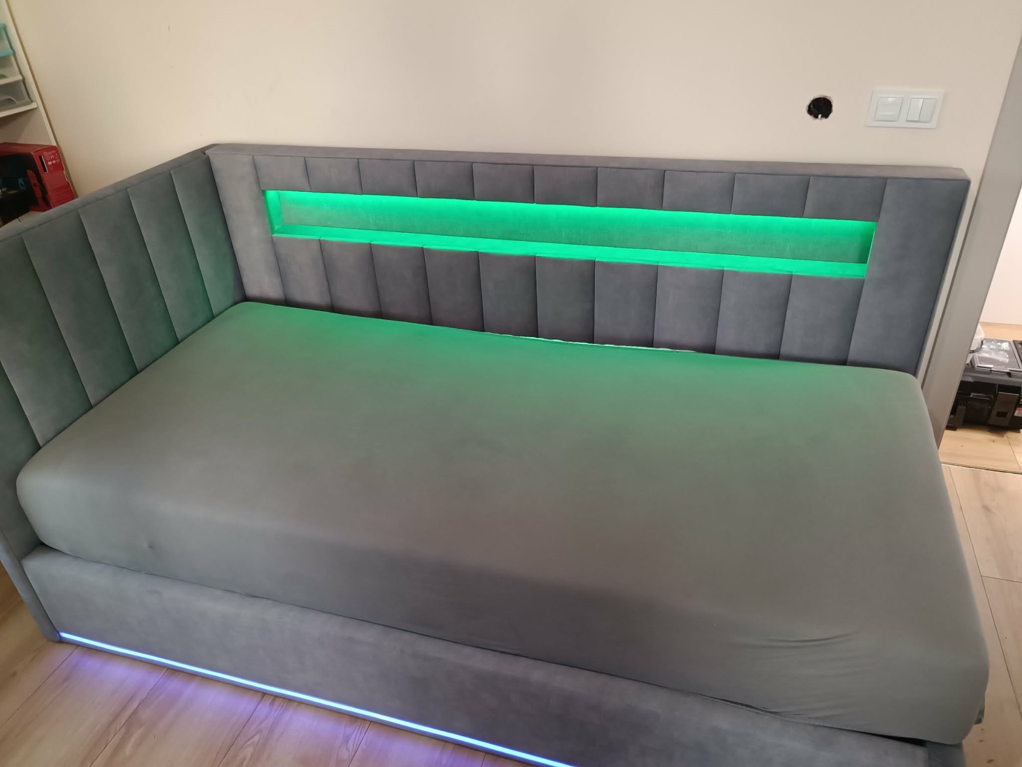 120x200 Łóżko tapicerowane z półeczką podświetleniem LED, pojemnik czujnik ruchu pilot aplikacja
