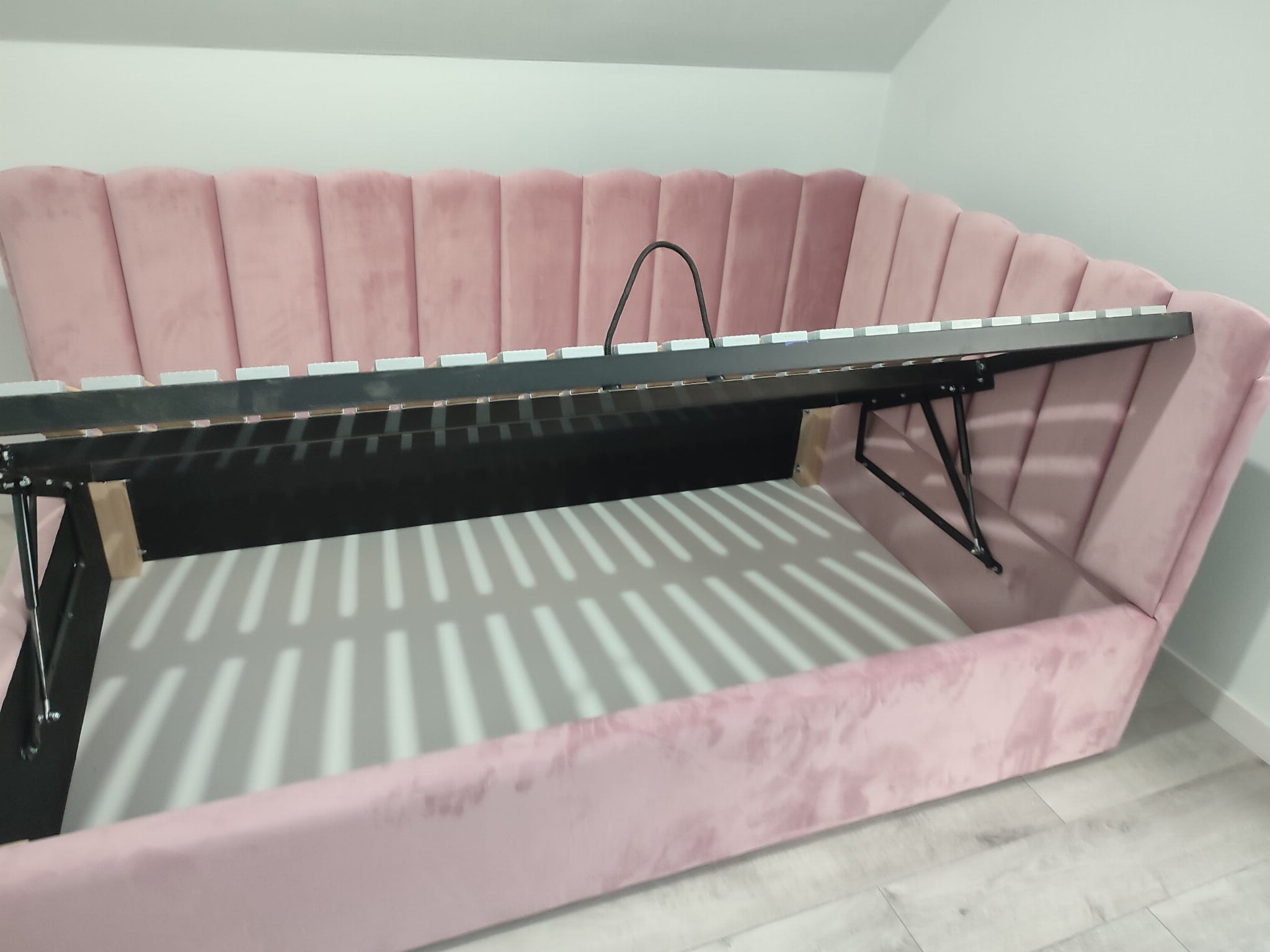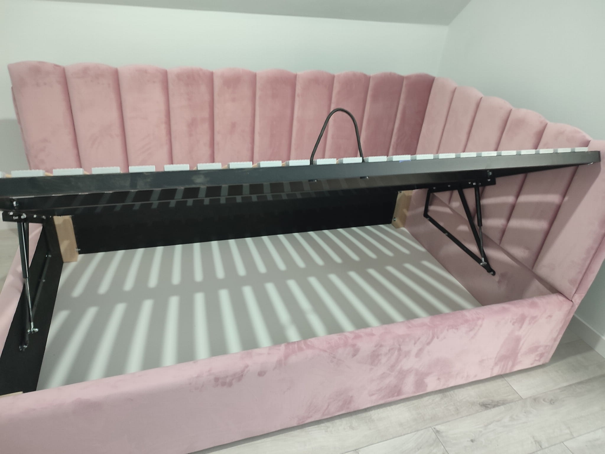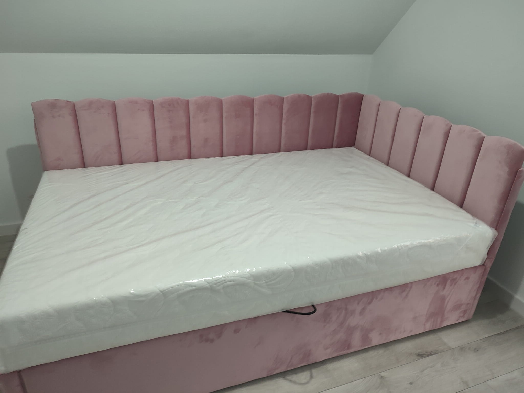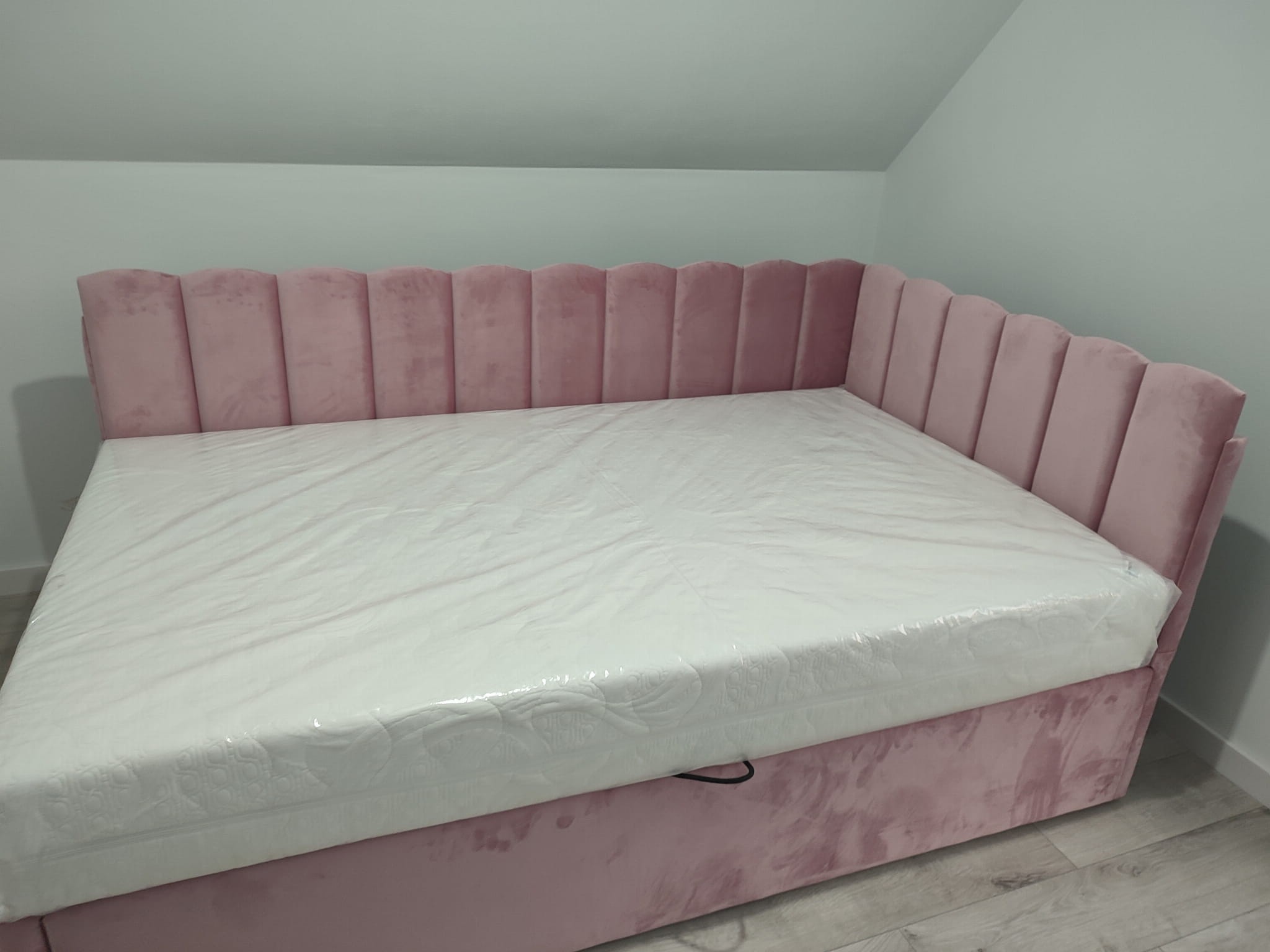 Łóżko tapicerowane narożne z wezgłowiami w pasy z górą leko zaokrągloną wyposażone w stelaż podnoszony od dłuższej strony lub od krótszej w zależności od wymagań klienta, pod stelażem mamy pojemnik na pościel i nie tylko którego to głębokość uzależniona jest od wysokości boków łózka oraz zastosowanych nóżek . Ściany pojemnika są obite materiałem podbiciowym czarnym. Obite wysokiej jakości materiałem który posłuży użytkownikom przez wiele lat, materiały firmy prohurt nazwa materiału IVE.