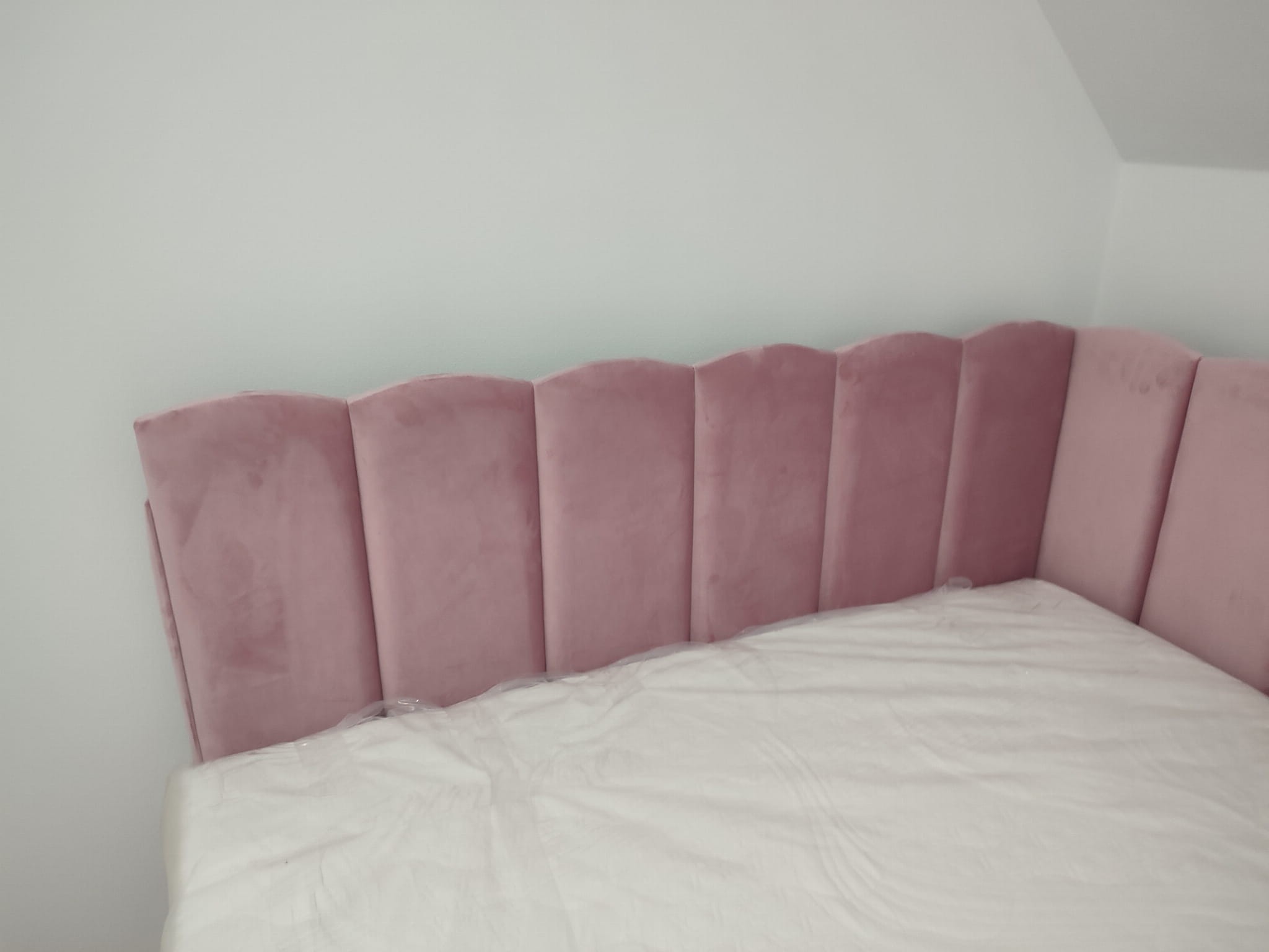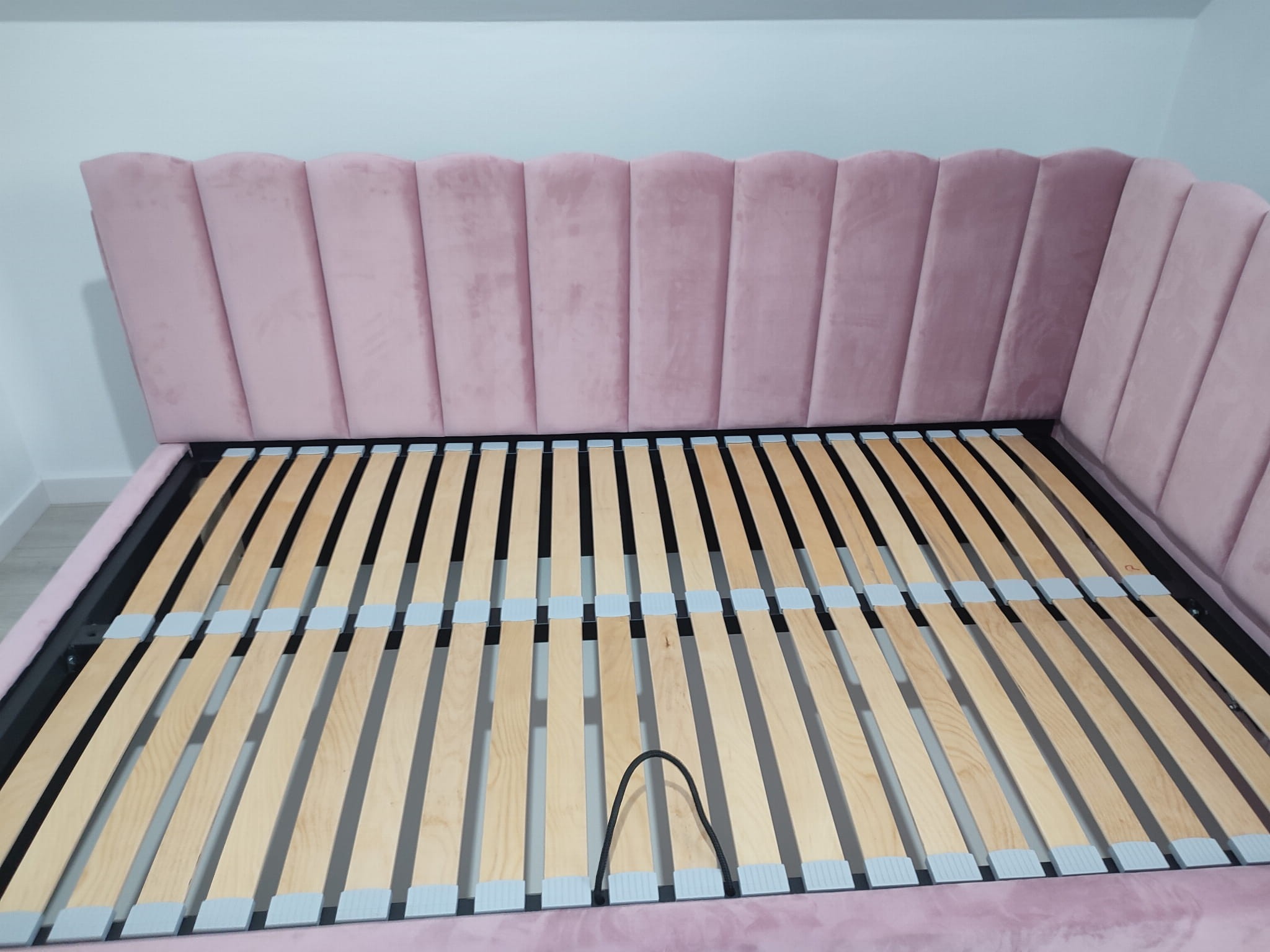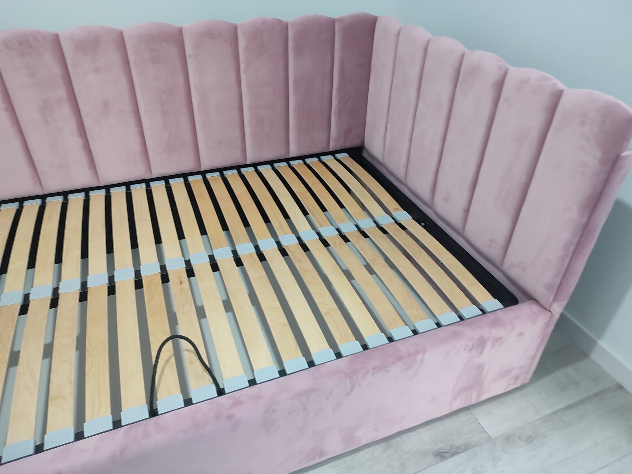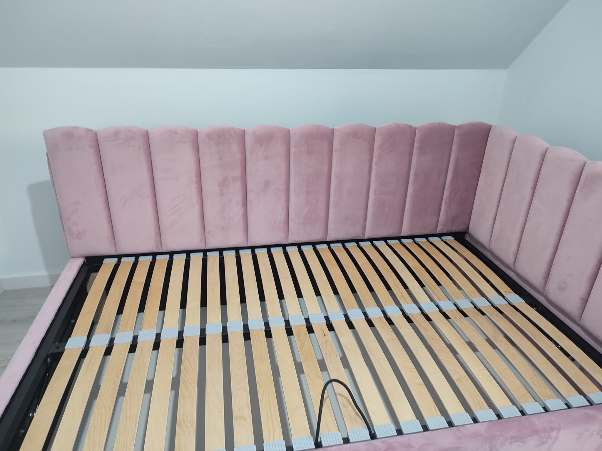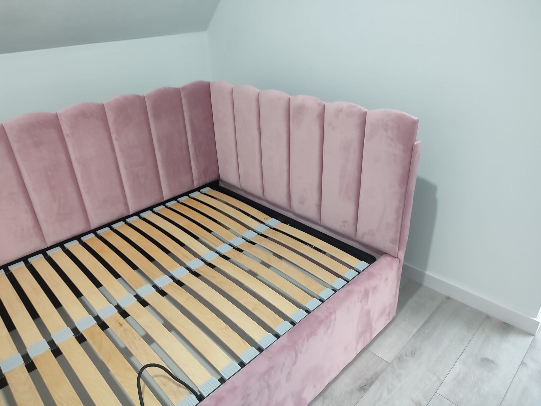 Łóżko tapicerowane narożne z wezgłowiami w pasy z górą leko zaokrągloną wyposażone w stelaż podnoszony od dłuższej strony lub od krótszej w zależności od wymagań klienta, pod stelażem mamy pojemnik na pościel i nie tylko którego to głębokość uzależniona jest od wysokości boków łózka oraz zastosowanych nóżek . Ściany pojemnika są obite materiałem podbiciowym czarnym. Obite wysokiej jakości materiałem który posłuży użytkownikom przez wiele lat, materiały firmy prohurt nazwa materiału IVE.