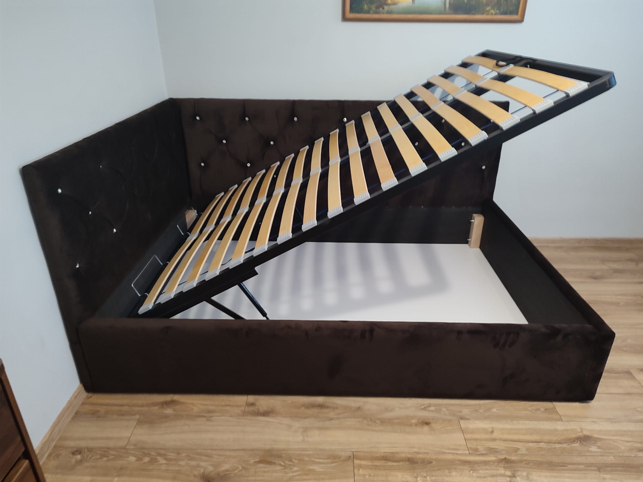 Łóżko tapicerowane narożne z wezgłowiami pikowanymi wyposażone w stelaż podnoszony od dłuższej strony lub od krótszej w zależności od wymagań klienta, pod stelażem mamy pojemnik na pościel i nie tylko którego to głębokość uzależniona jest od wysokości boków łózka oraz zastosowanych nóżek . Ściany pojemnika są obite materiałem podbiciowym czarnym. Obite wysokiej jakości materiałem który posłuży użytkownikom przez wiele lat, materiały firmy prohurt nazwa materiału IVE.