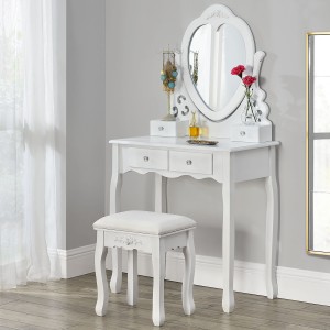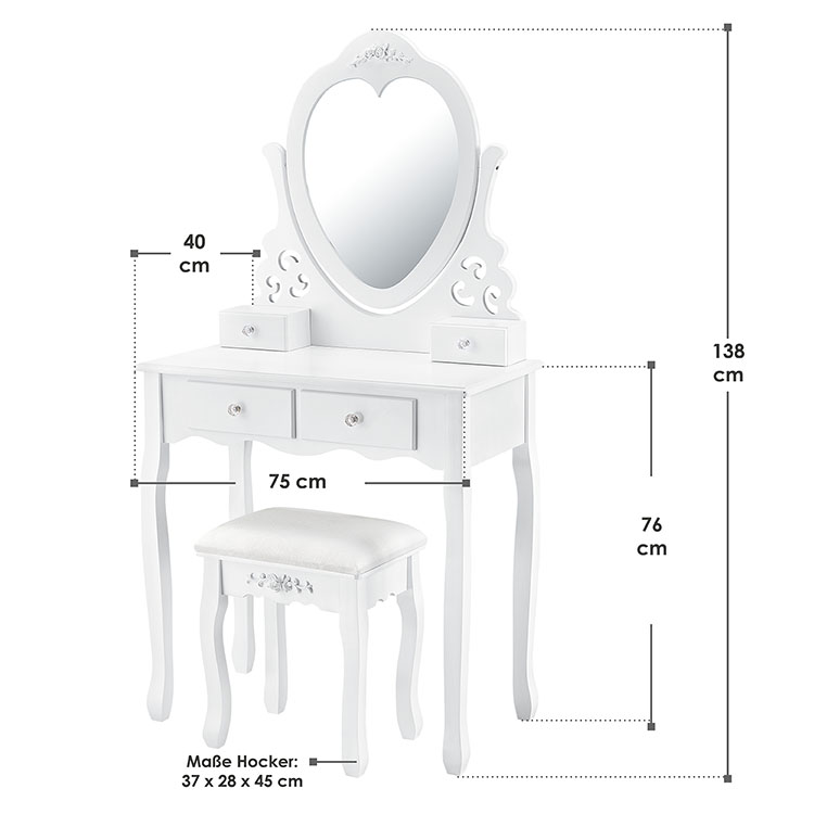 Pięknie wykonany ręcznie stolik do makijażu w wesołym wiejskim stylu stanowi idealne uzupełnienie sypialni, pokoju młodzieżowego i dziecięcego. Lustro w kształcie serca, zakrzywione kształty i umiejętnie rozmieszczone akcenty sprawiają, że serca kobiet i dziewcząt biją szybciej. Ponadto biały lakierowany stolik kosmetyczny z drewna MDF zachwyca wysoką funkcjonalnością. Duże lustro, szuflady i taboret zapewniają wysoki komfort codziennej stylizacji.