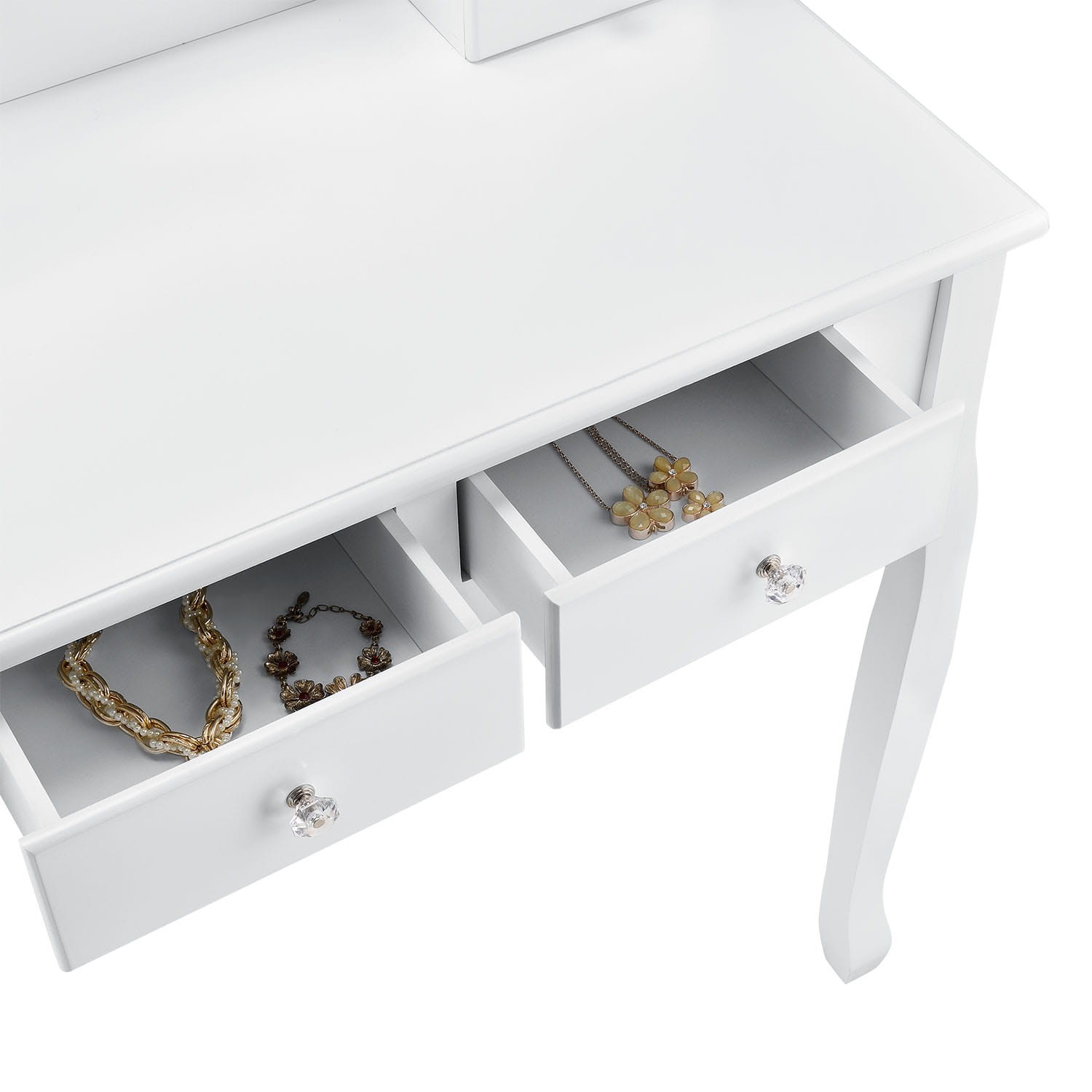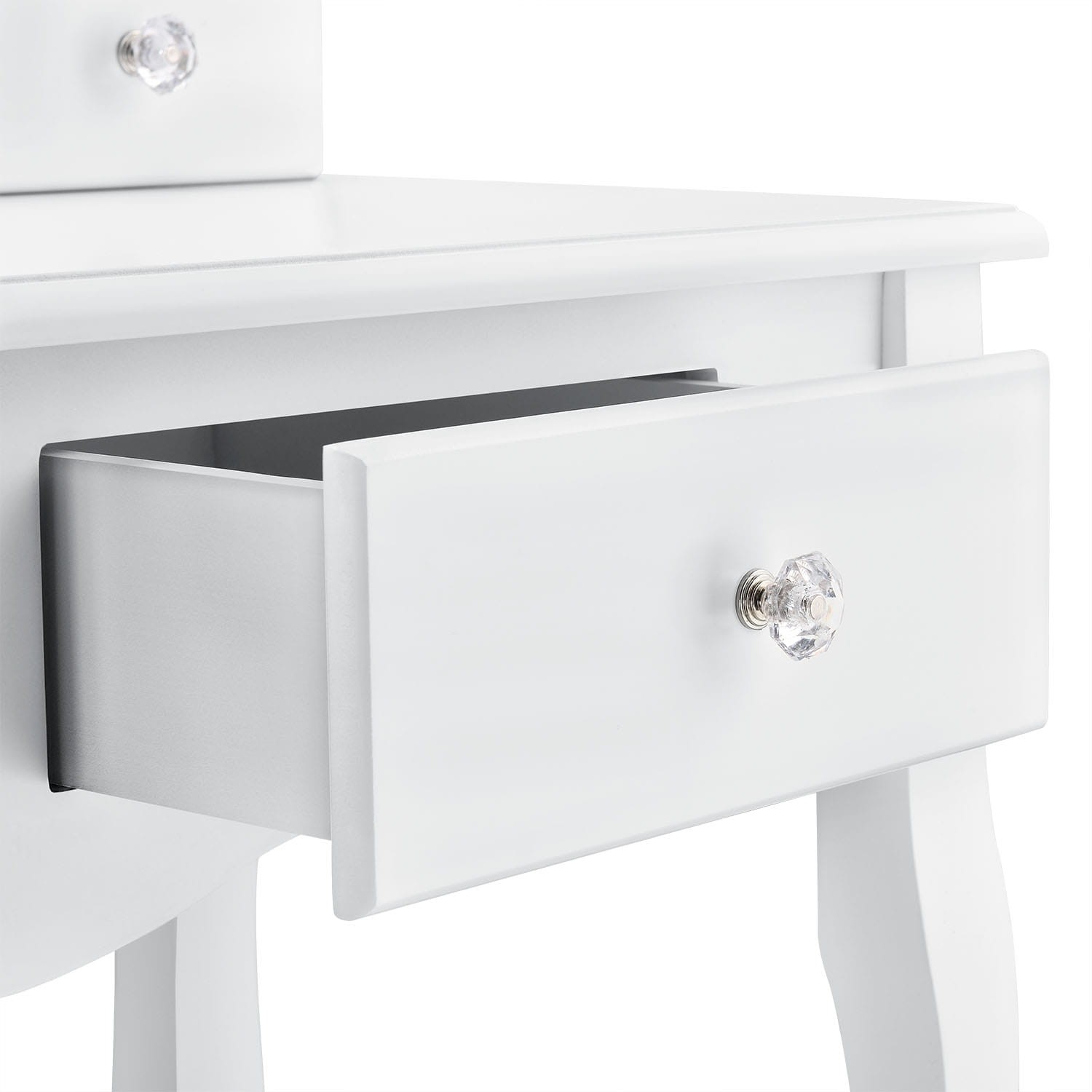 2 szuflady w konsoli i 2 dodatkowe w eseju zapewniają wystarczająco dużo miejsca do przechowywania tuszu do rzęs, eyelinera, szminki i innych produktów. Zachowaj porządnie cały niezbędny makijaż w jednym miejscu i rano masz wszystko na wyciągnięcie ręki. Piękne pokrętła sprawiają, że szuflady wyglądają elegancko i nadają toalecie wdzięku.