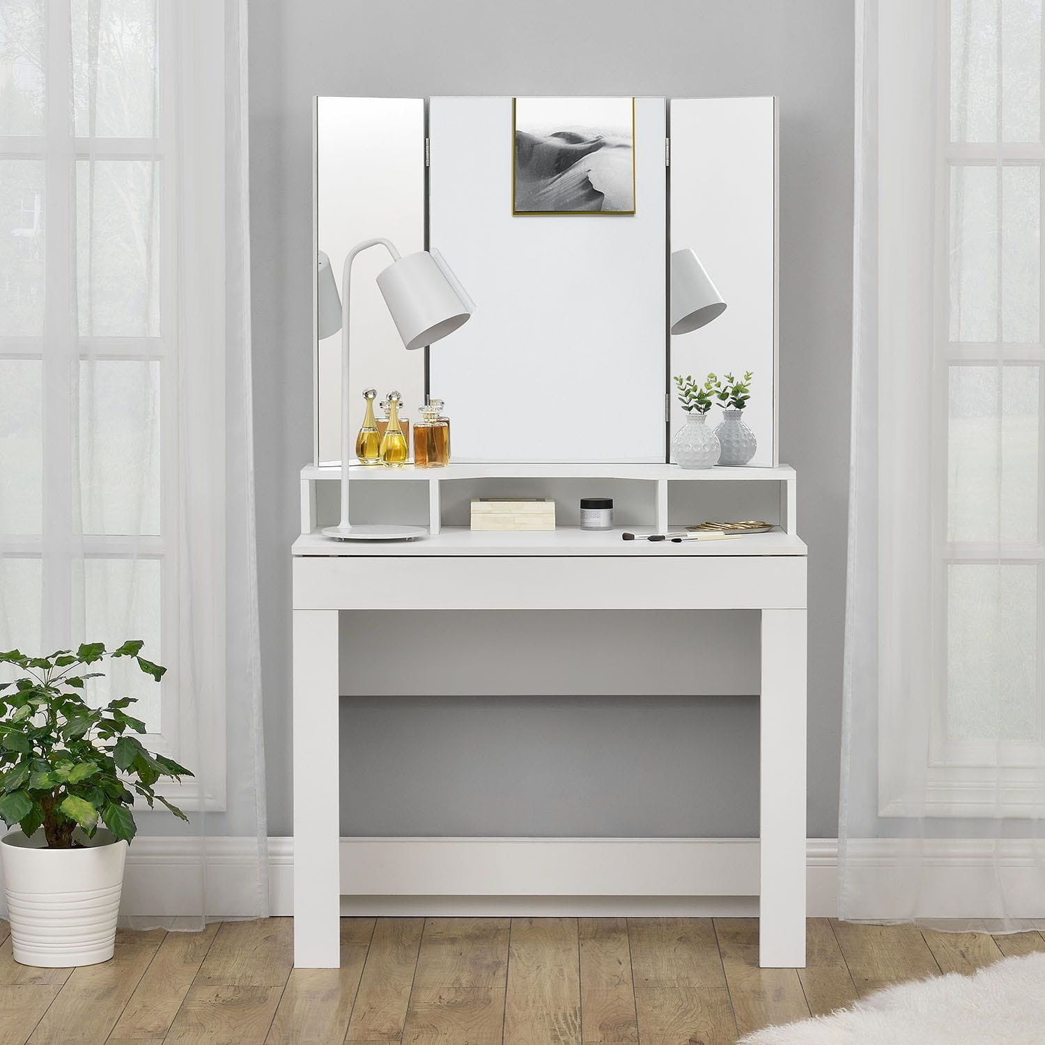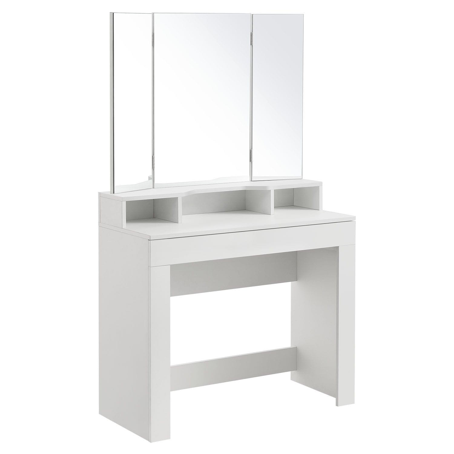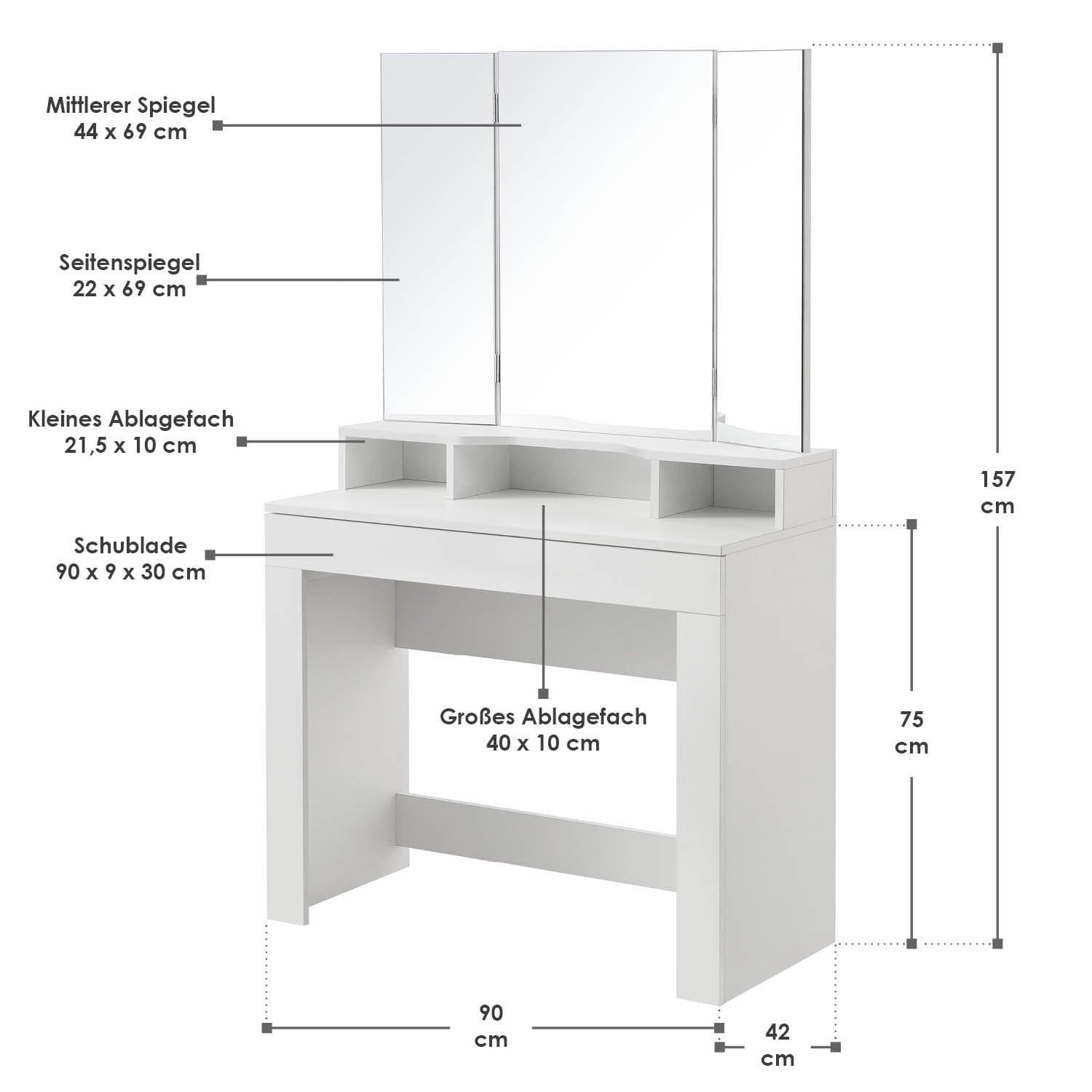 Komoda do makijażu składa się z 1 dużego lusterka do makijażu i 2 lusterek bocznych, które można przechylać o 180°. 3 prostokątne lusterka ułatwiają wykonanie makijażu. A stylizując wyszukane fryzury, nastolatki lub dorośli zawsze mają na siebie doskonały widok.