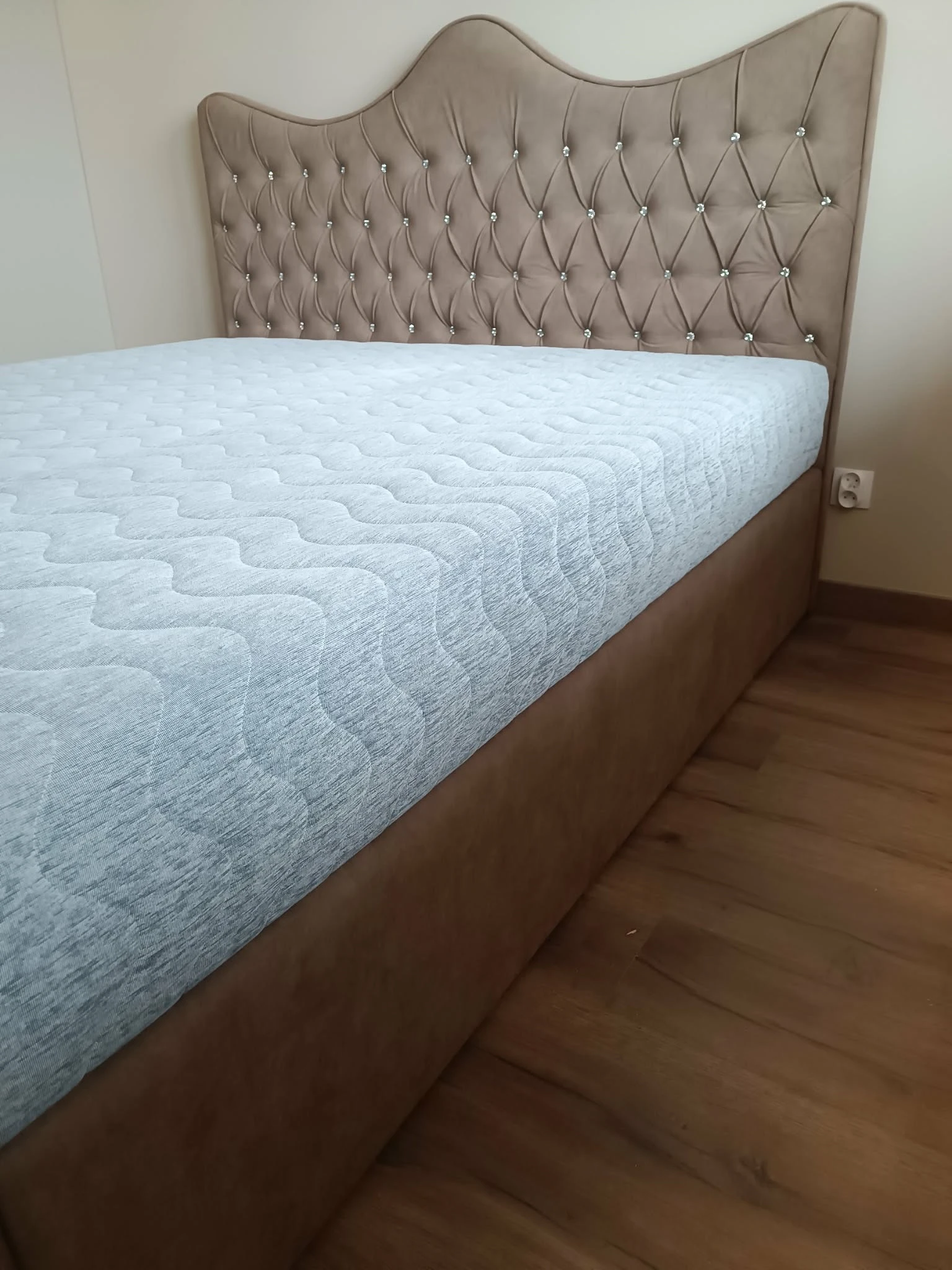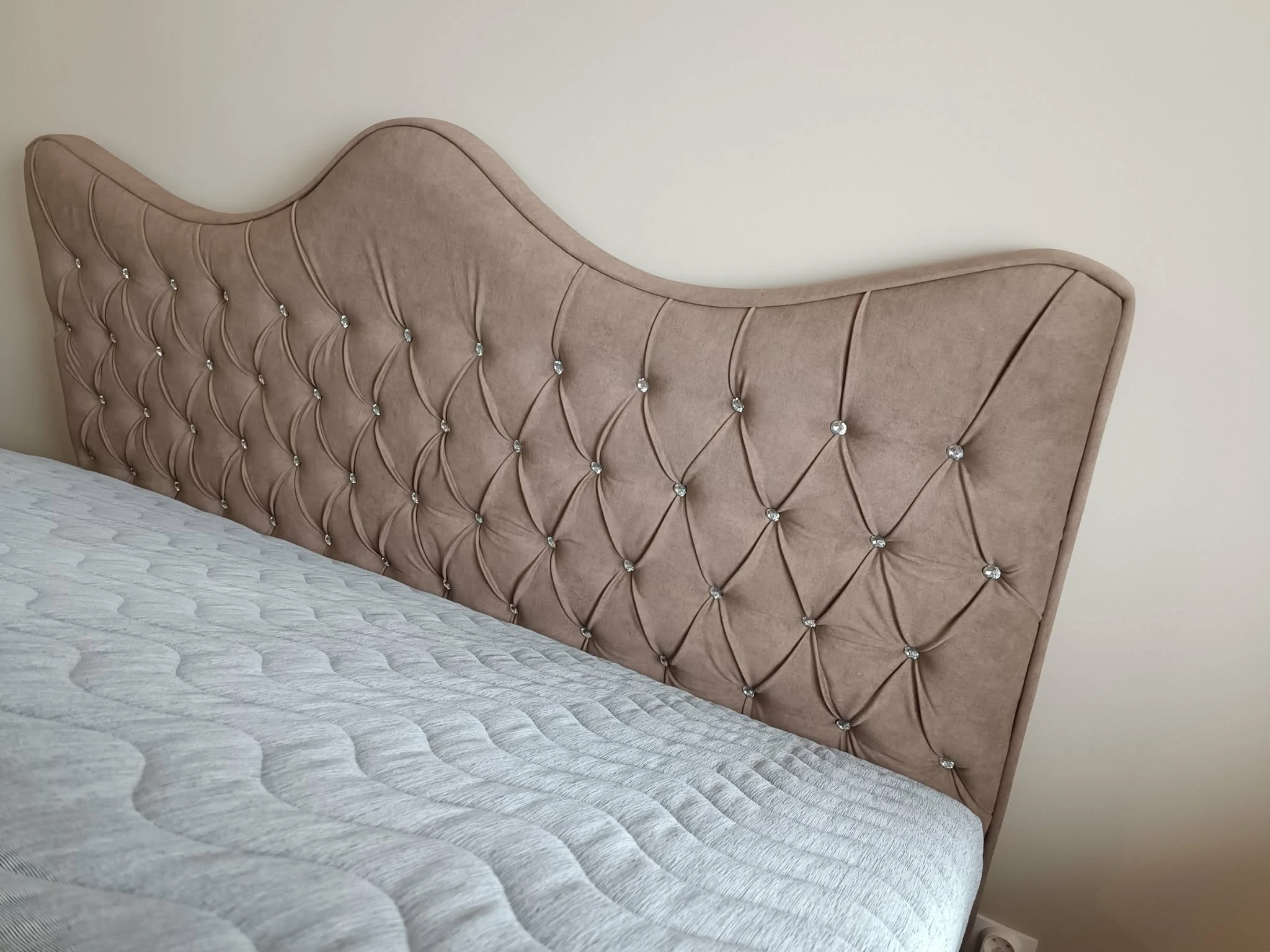 Łóżko tapicerowane z wezgłowiem pikowanym kryształkami wysokim wyposażone w stelaż podnoszony od dłuższej strony lub od krótszej w zależności od wymagań klienta, pod stelażem mamy pojemnik na pościel i nie tylko którego to głębokość uzależniona jest od wysokości boków łózka oraz zastosowanych nóżek . Ściany pojemnika są obite materiałem podbiciowym czarnym. Obite wysokiej jakości materiałem który posłuży użytkownikom przez wiele lat, materiały firmy prohurt.