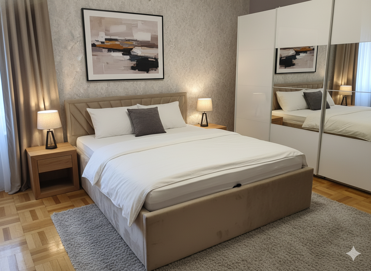 Łóżko tapicerowane z wezgłowiam w tzw. słoneczko z obrysem wyposażone w stelaż podnoszony od dłuższej strony lub od krótszej w zależności od wymagań klienta, pod stelażem mamy pojemnik na pościel i nie tylko którego to głębokość uzależniona jest od wysokości boków łózka oraz zastosowanych nóżek . Ściany pojemnika są obite materiałem podbiciowym czarnym. Obite wysokiej jakości materiałem który posłuży użytkownikom przez wiele lat, materiały firmy prohurt nazwa materiału IVE.