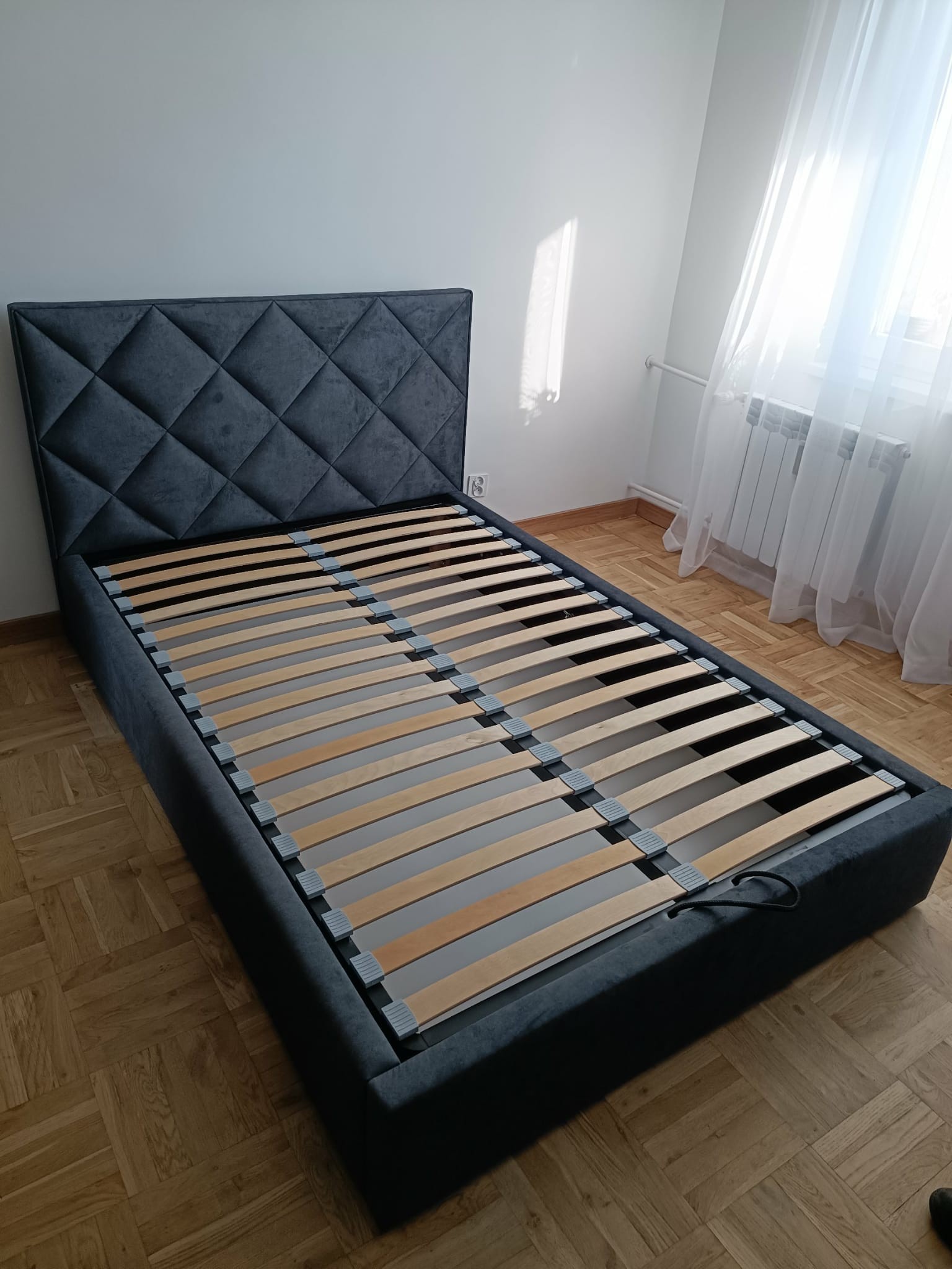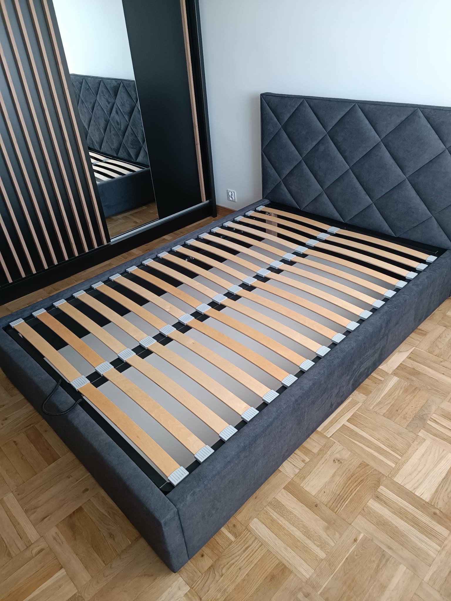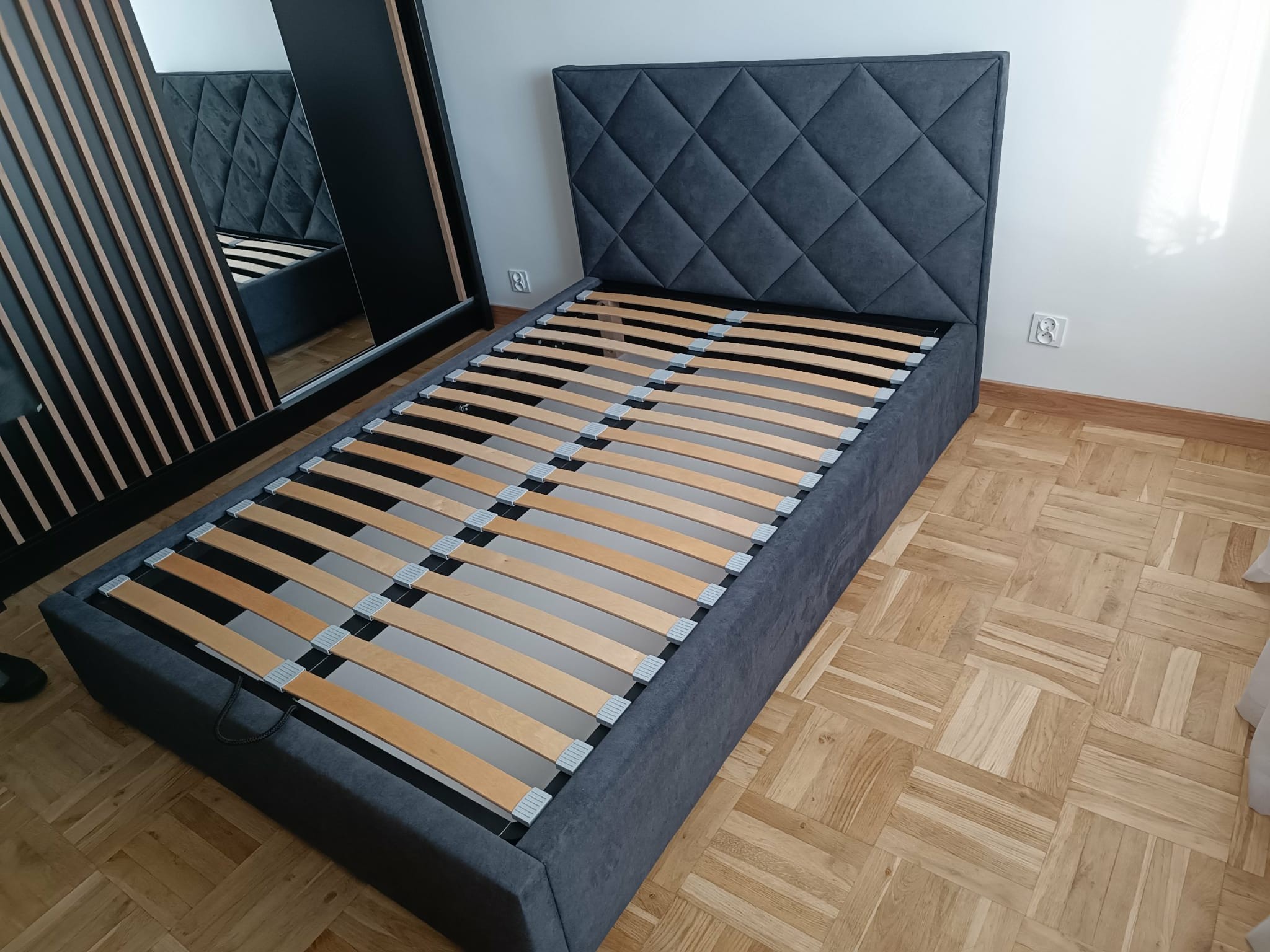 Łóżko tapicerowane z wezgłowiem w dzwonke wyposażone w stelaż podnoszony od dłuższej strony lub od krótszej w zależności od wymagań klienta, pod stelażem mamy pojemnik na pościel i nie tylko którego to głębokość uzależniona jest od wysokości boków łózka oraz zastosowanych nóżek . Ściany pojemnika są obite materiałem podbiciowym czarnym. Obite wysokiej jakości materiałem który posłuży użytkownikom przez wiele lat, materiały firmy prohurt.