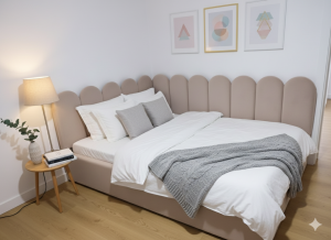 Łóżko tapicerowane narożne z wezgłowiami w biszkopty wyposażone w stelaż podnoszony od dłuższej strony lub od krótszej w zależności od wymagań klienta, pod stelażem mamy pojemnik na pościel i nie tylko którego to głębokość uzależniona jest od wysokości boków łózka oraz zastosowanych nóżek . Ściany pojemnika są obite materiałem podbiciowym czarnym. Obite wysokiej jakości materiałem który posłuży użytkownikom przez wiele lat, materiały firmy prohurt nazwa materiału IVE.