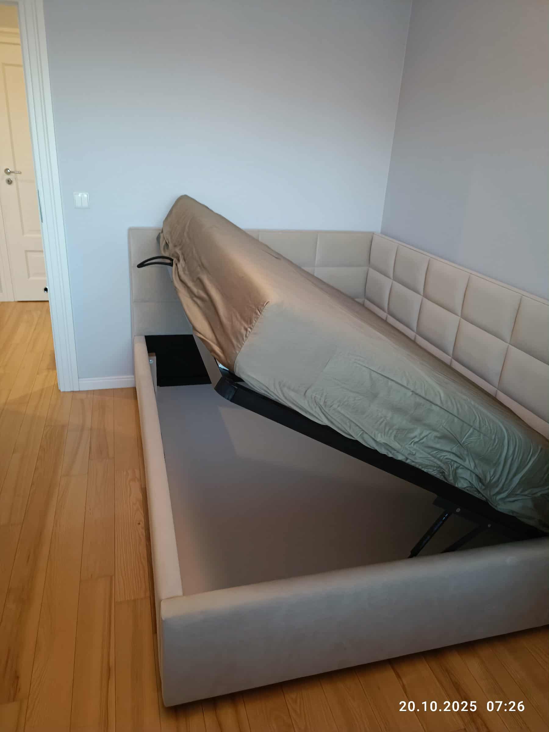 Łóżko tapicerowane narożne z wezgłowiami w kwadraty wyposażone w stelaż podnoszony od dłuższej strony lub od krótszej w zależności od wymagań klienta, pod stelażem mamy pojemnik na pościel i nie tylko którego to głębokość uzależniona jest od wysokości boków łózka oraz zastosowanych nóżek . Ściany pojemnika są obite materiałem podbiciowym czarnym. Obite wysokiej jakości materiałem który posłuży użytkownikom przez wiele lat, materiały firmy prohurt