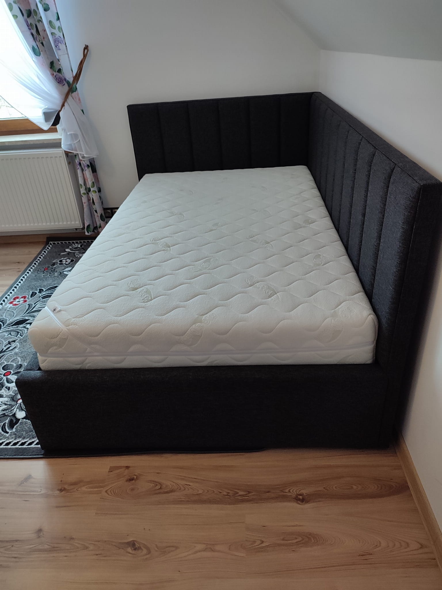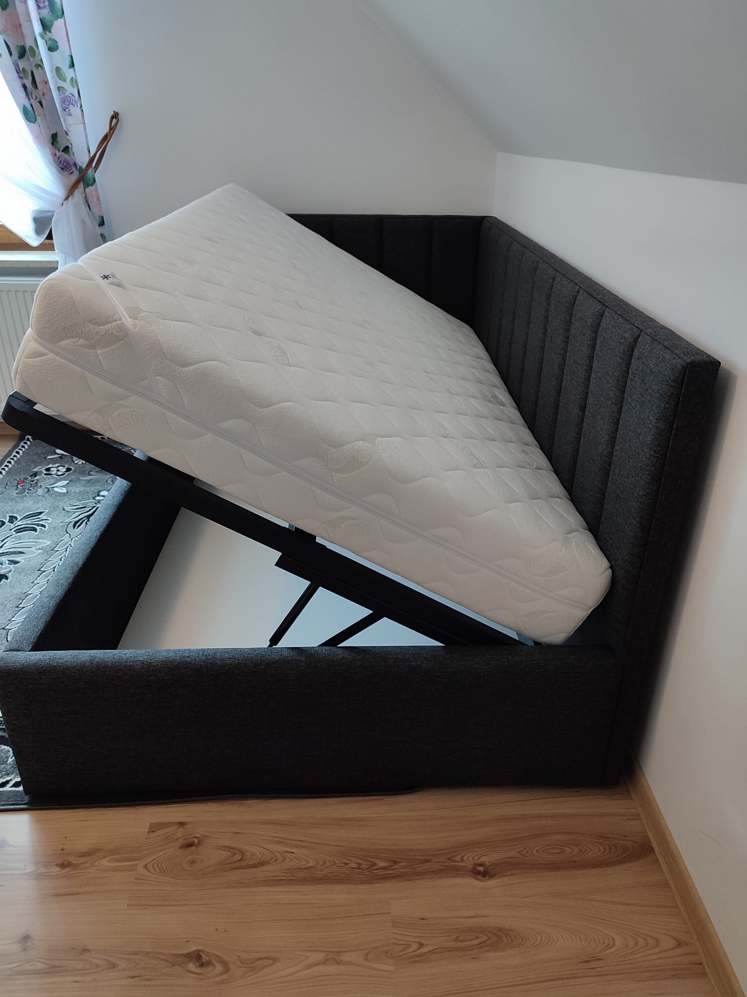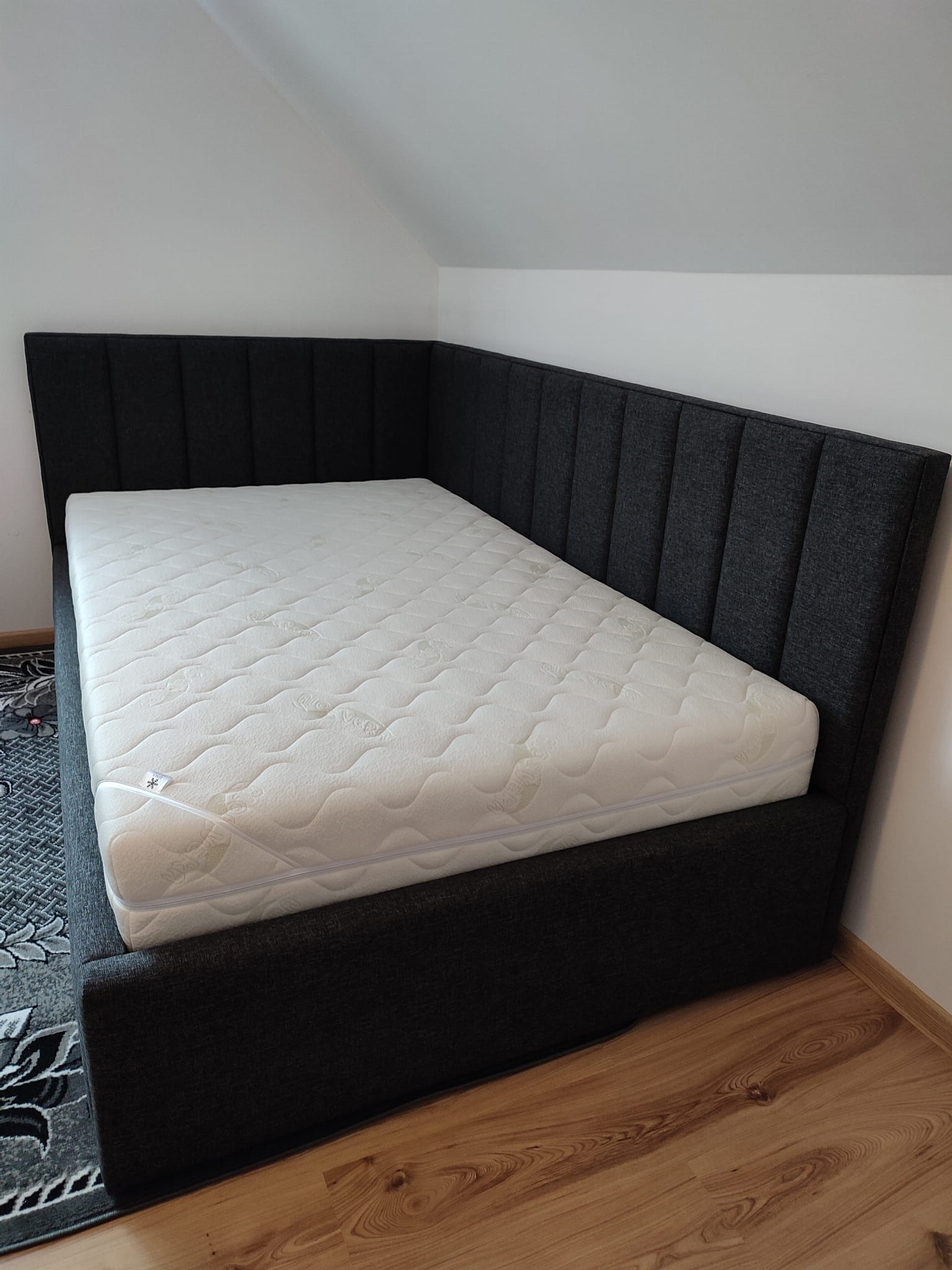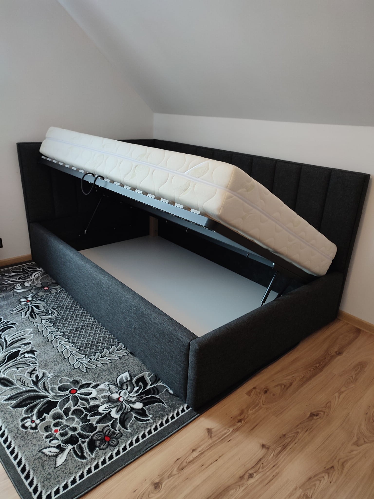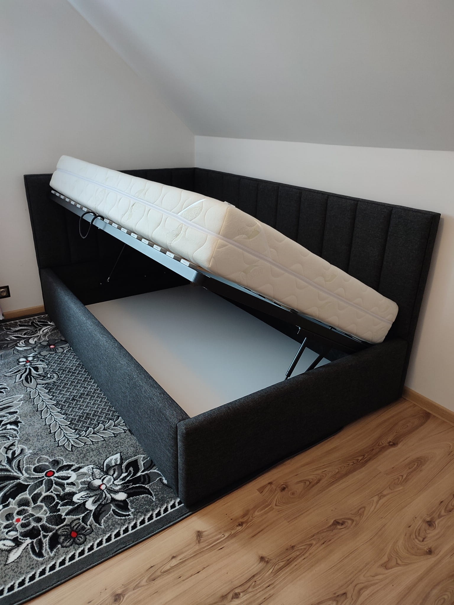 Łóżko tapicerowane narożne z wezgłowiami w pasy wyposażone w stelaż podnoszony od dłuższej strony lub od krótszej w zależności od wymagań klienta, pod stelażem mamy pojemnik na pościel i nie tylko którego to głębokość uzależniona jest od wysokości boków łózka oraz zastosowanych nóżek . Ściany pojemnika są obite materiałem podbiciowym czarnym. Obite wysokiej jakości materiałem który posłuży użytkownikom przez wiele lat, materiały firmy prohurt nazwa materiału IVE.