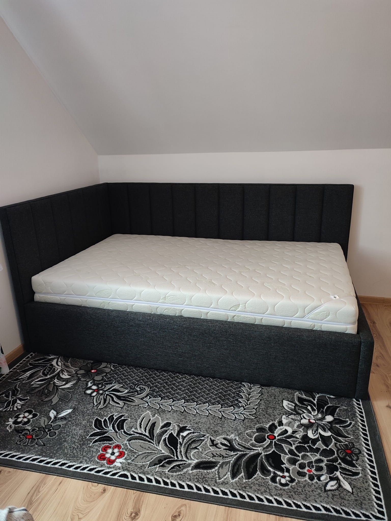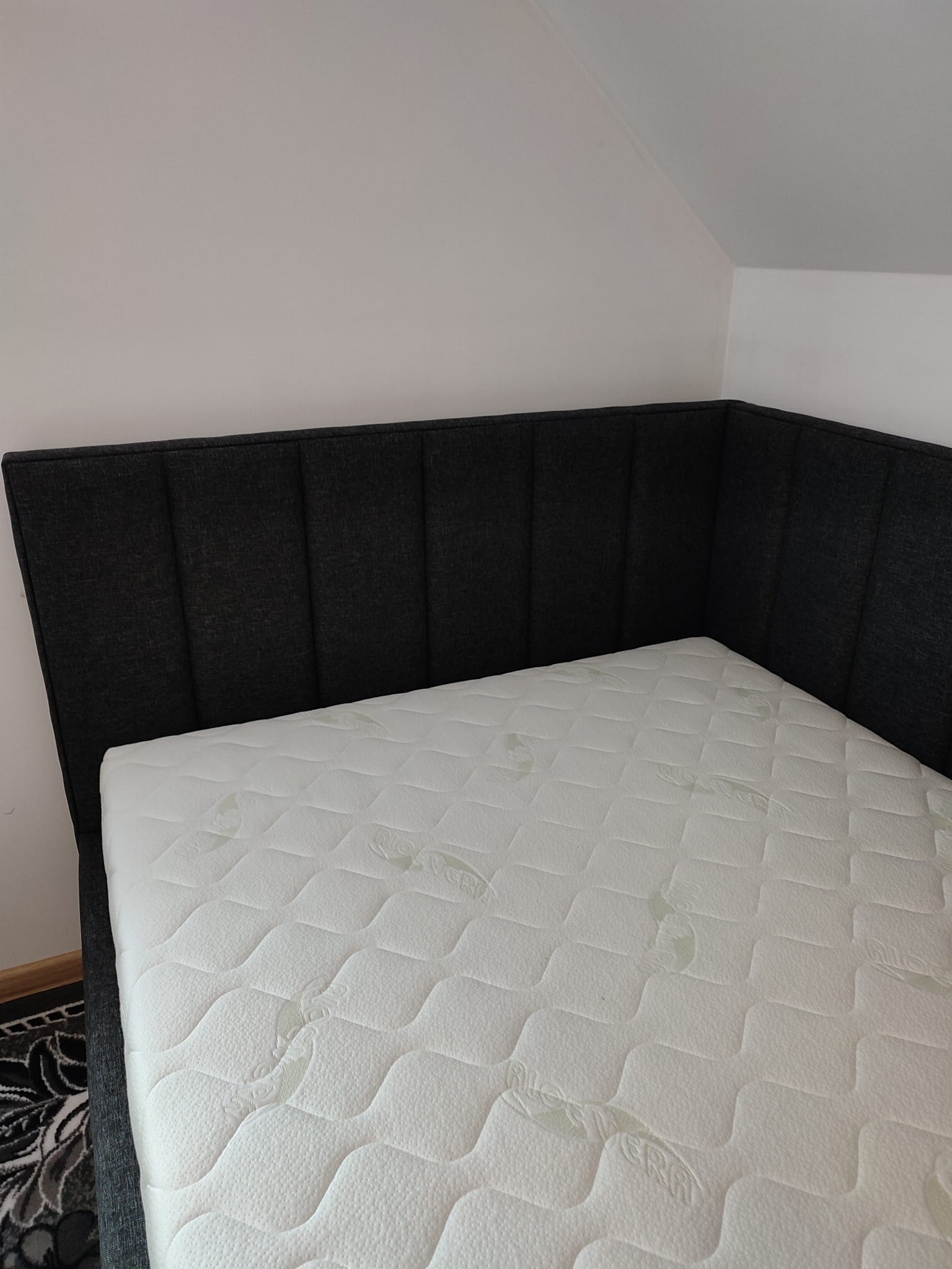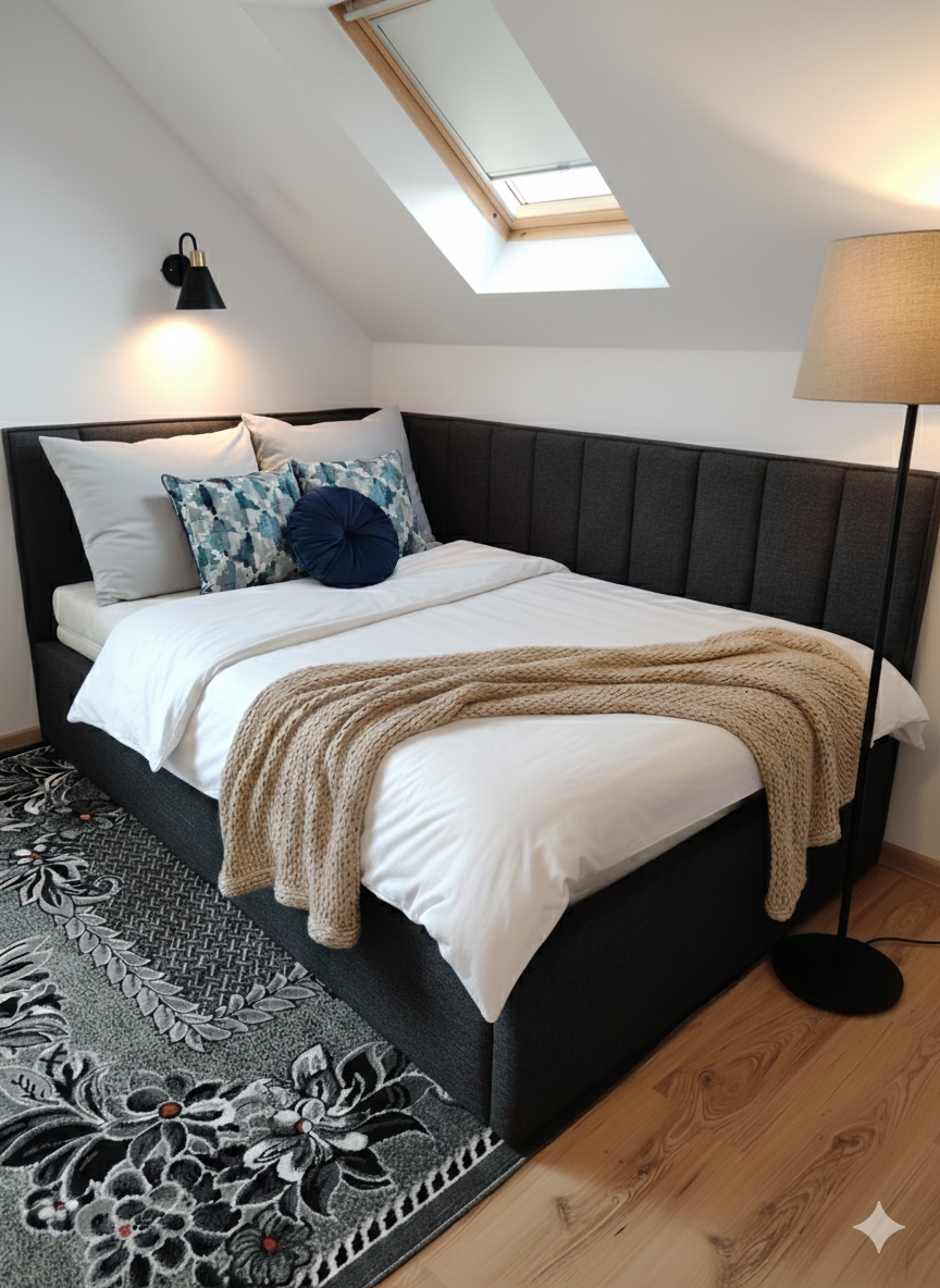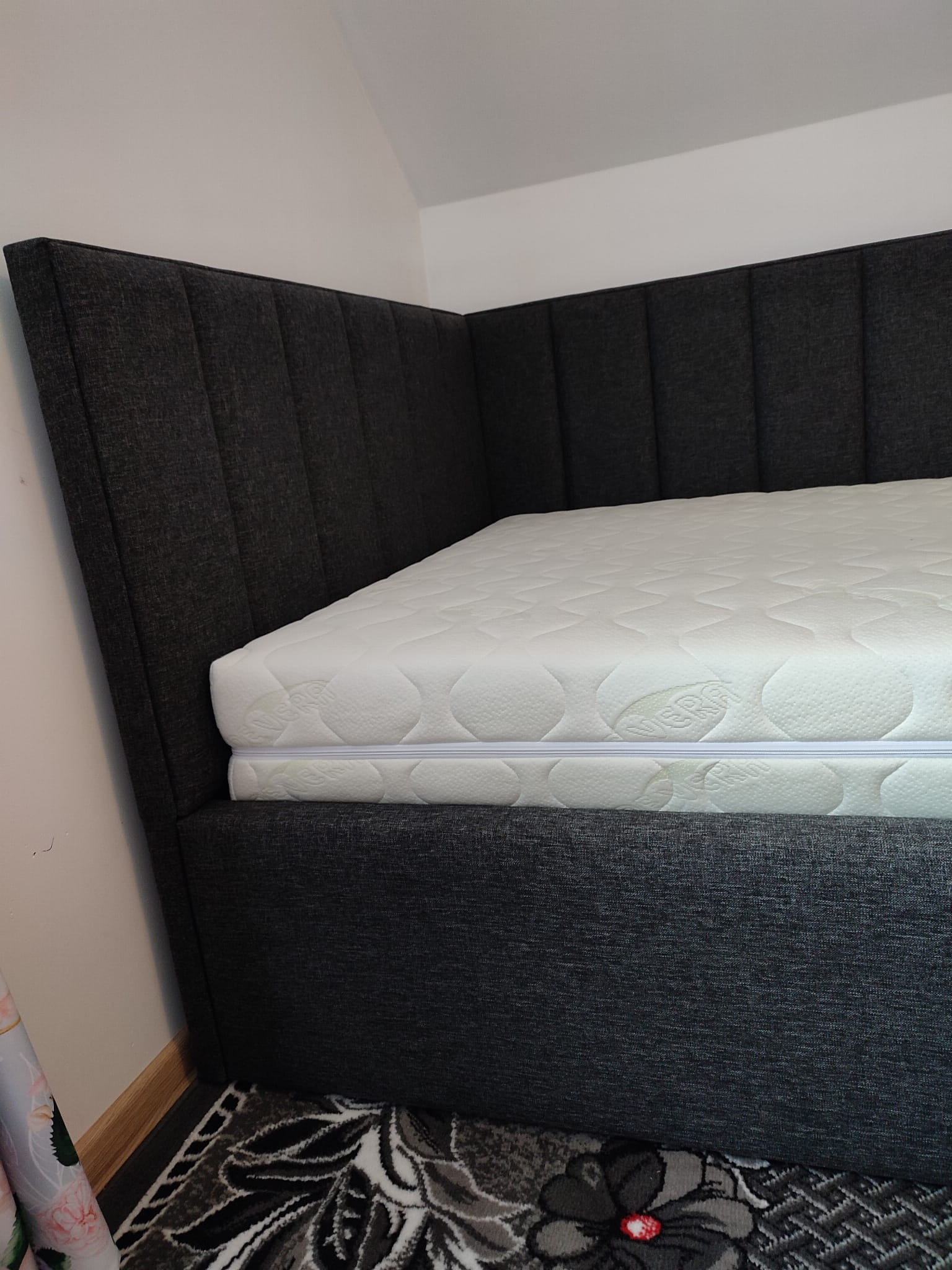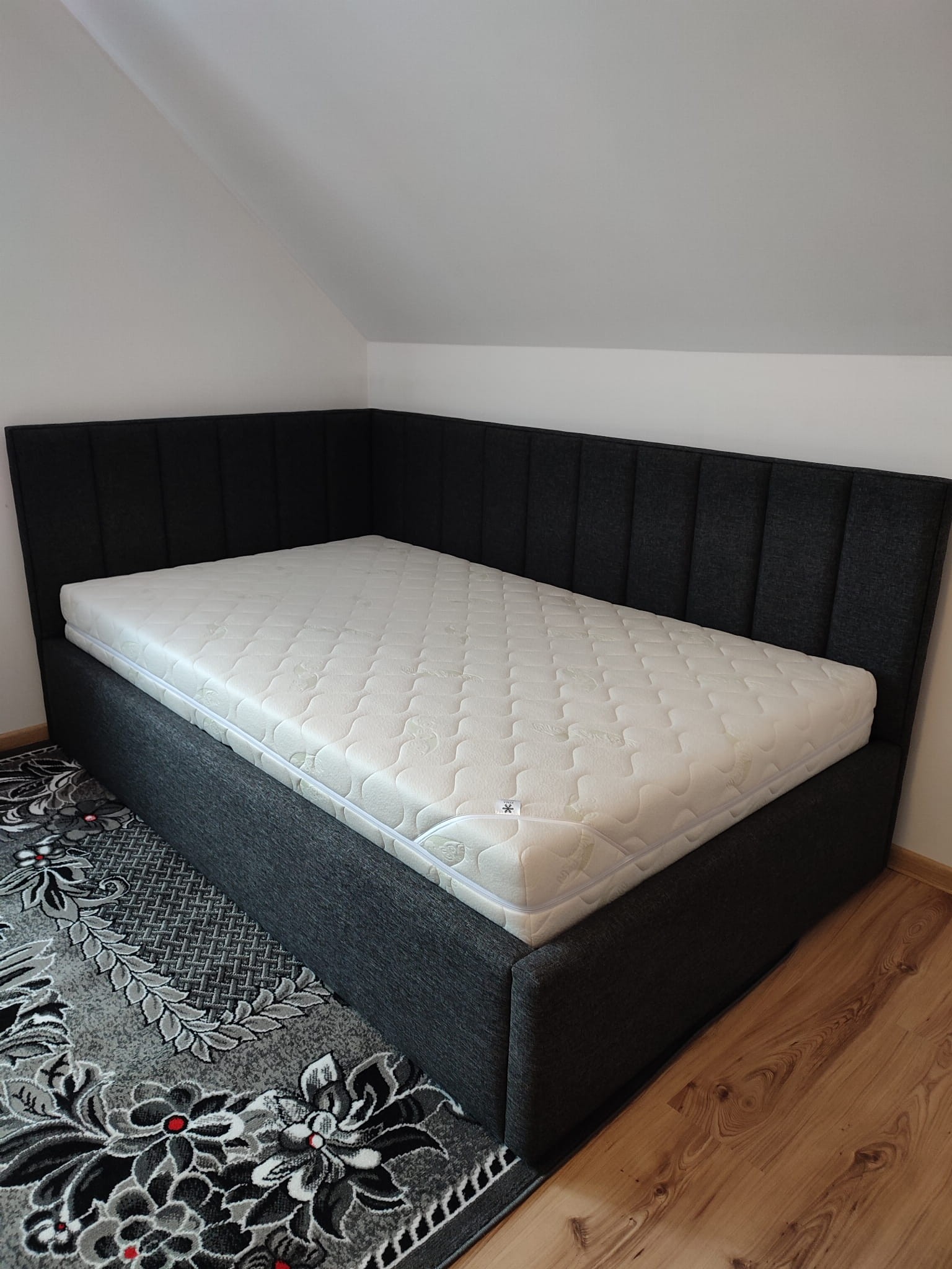 Łóżko tapicerowane narożne z wezgłowiami w pasy wyposażone w stelaż podnoszony od dłuższej strony lub od krótszej w zależności od wymagań klienta, pod stelażem mamy pojemnik na pościel i nie tylko którego to głębokość uzależniona jest od wysokości boków łózka oraz zastosowanych nóżek . Ściany pojemnika są obite materiałem podbiciowym czarnym. Obite wysokiej jakości materiałem który posłuży użytkownikom przez wiele lat, materiały firmy prohurt nazwa materiału IVE.