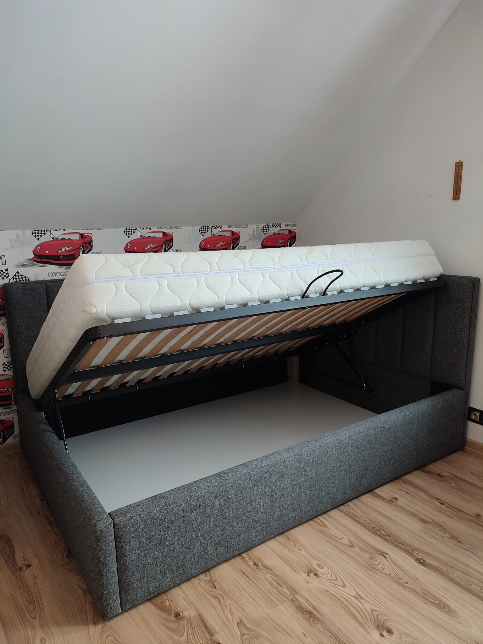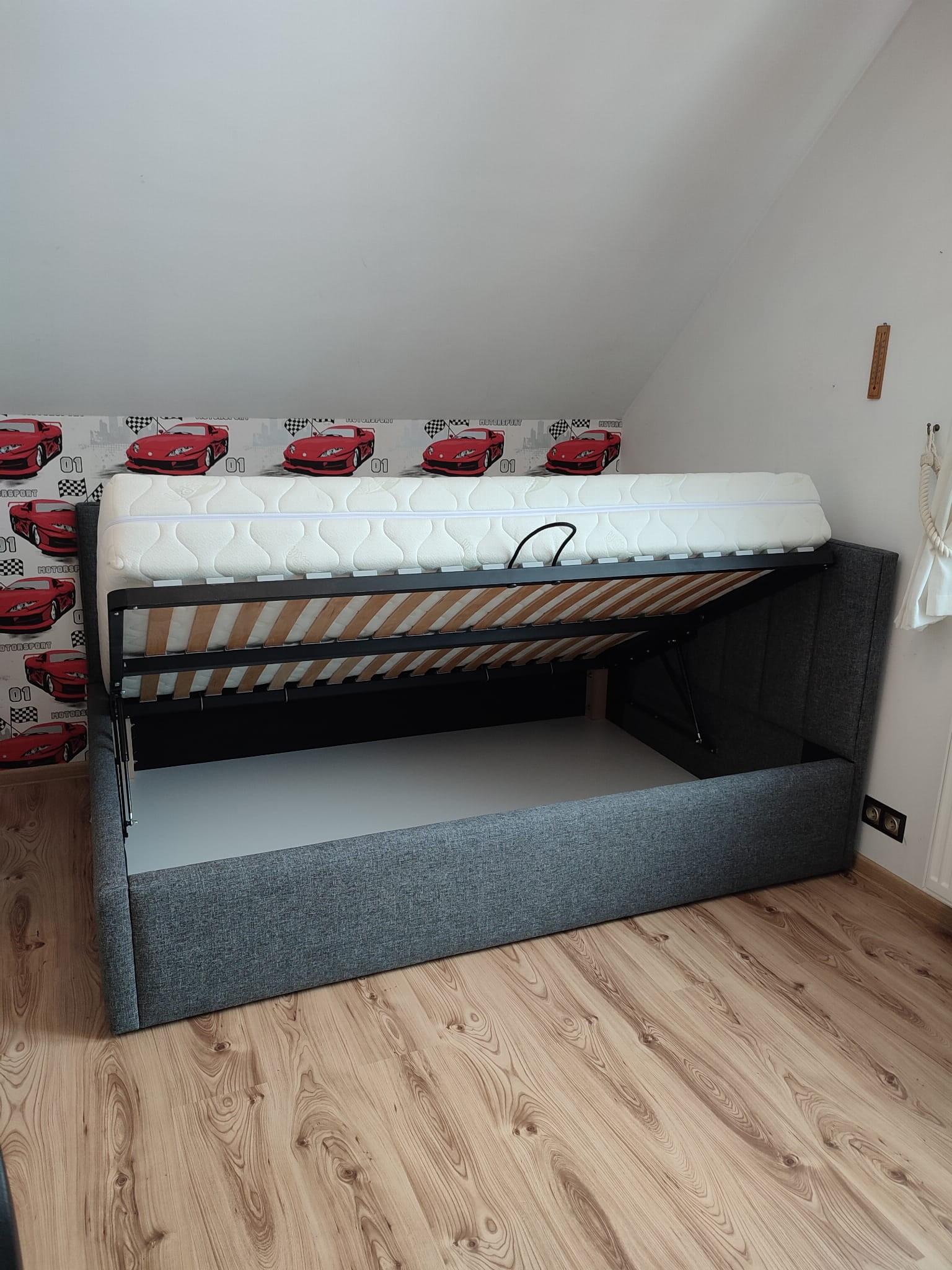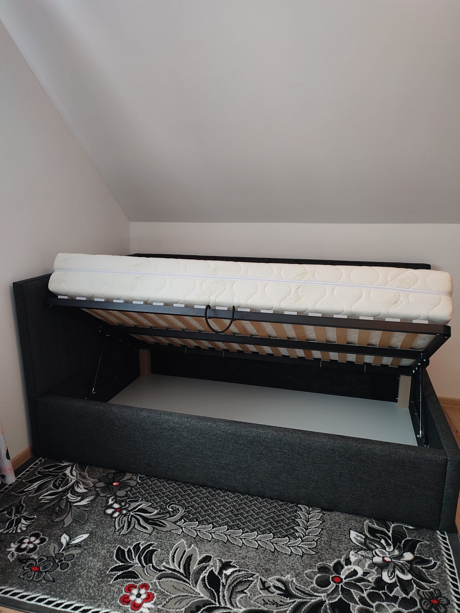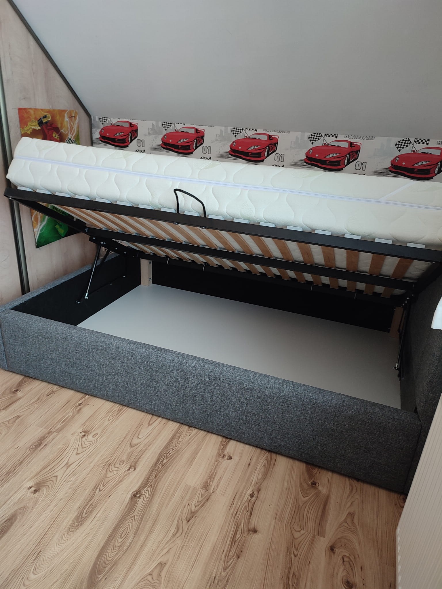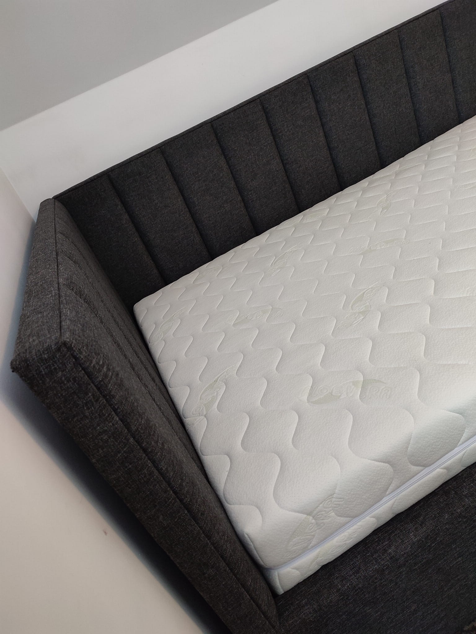 Łóżko tapicerowane narożne z wezgłowiami w pasy wyposażone w stelaż podnoszony od dłuższej strony lub od krótszej w zależności od wymagań klienta, pod stelażem mamy pojemnik na pościel i nie tylko którego to głębokość uzależniona jest od wysokości boków łózka oraz zastosowanych nóżek . Ściany pojemnika są obite materiałem podbiciowym czarnym. Obite wysokiej jakości materiałem który posłuży użytkownikom przez wiele lat, materiały firmy prohurt nazwa materiału IVE.