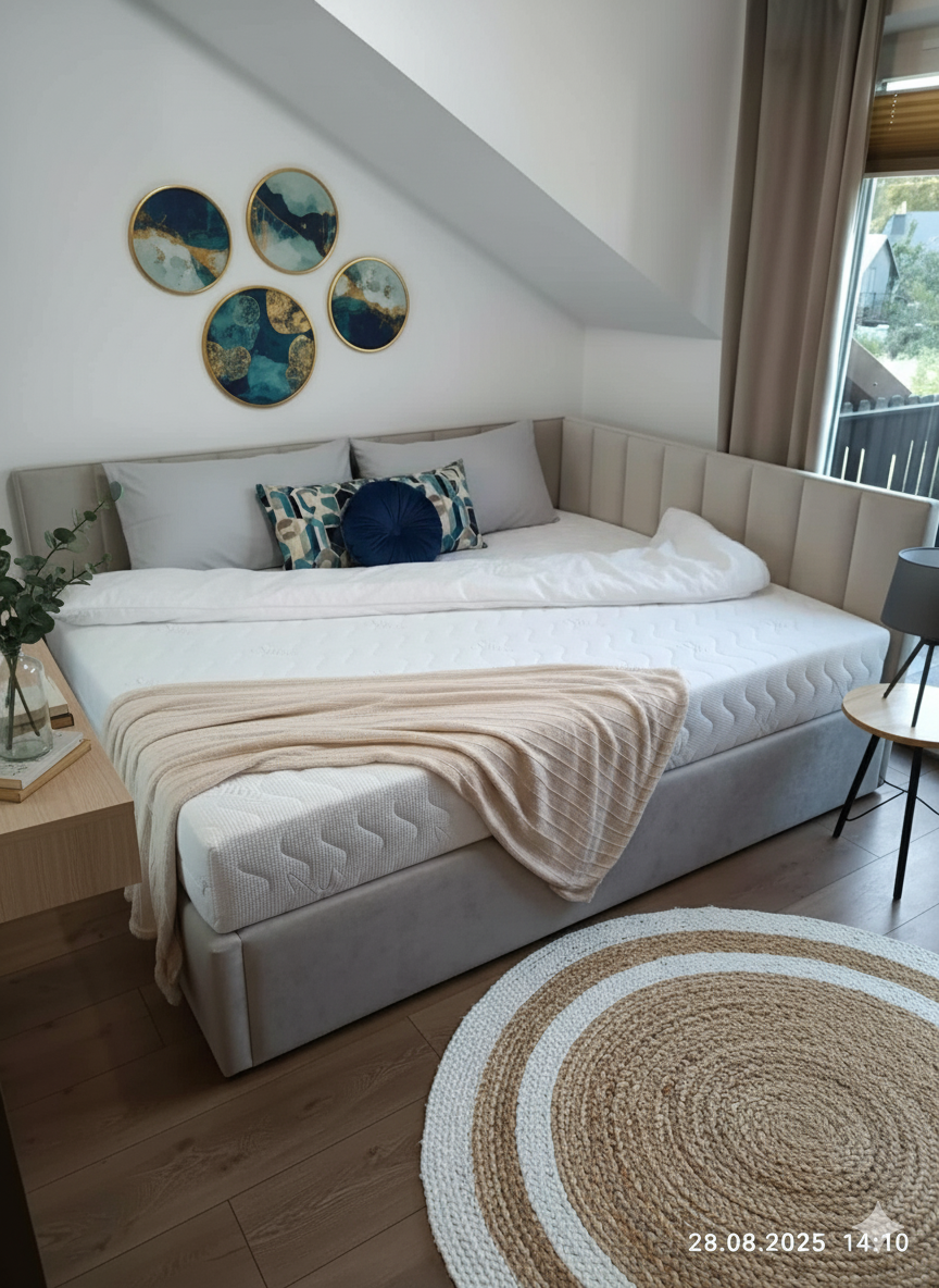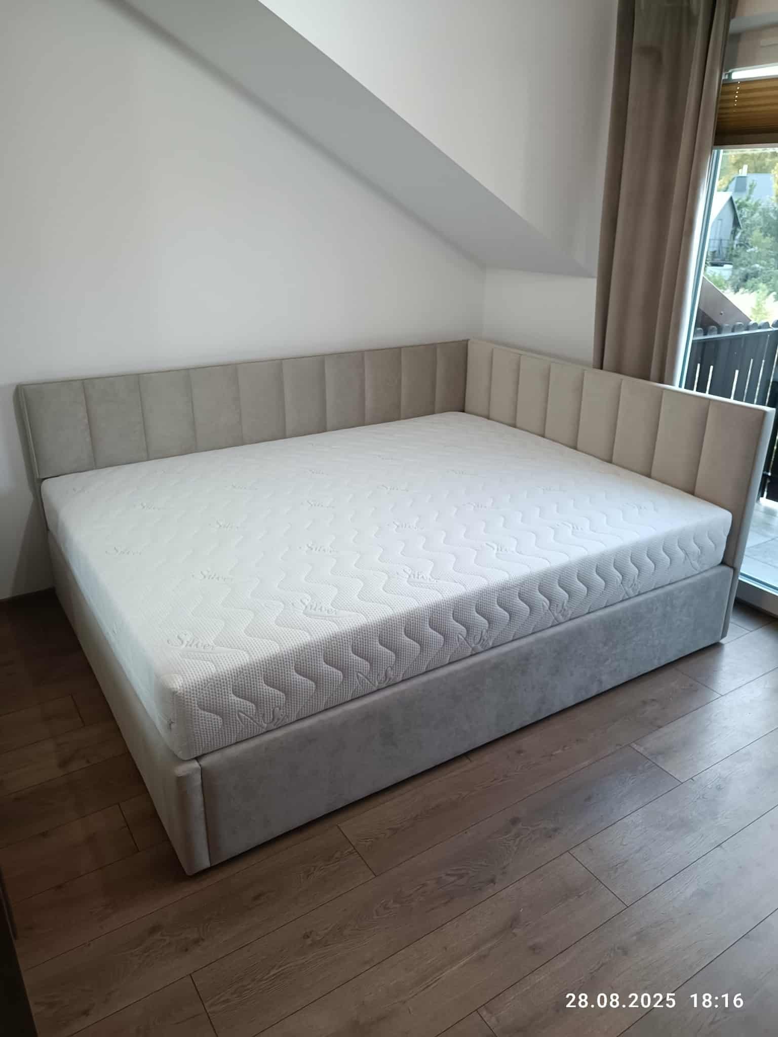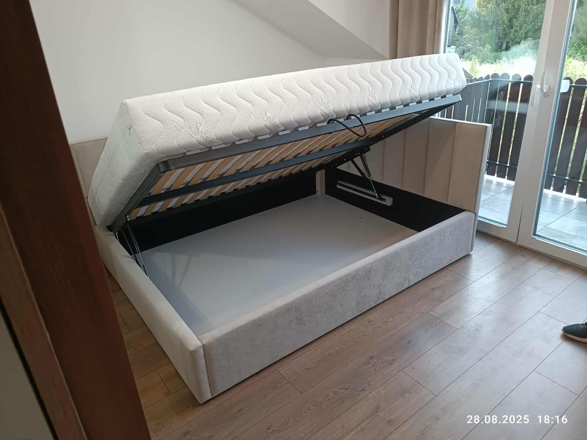 Łóżko tapicerowane narożne z wezgłowiami w pasy wyposażone w stelaż podnoszony od dłuższej strony lub od krótszej w zależności od wymagań klienta, pod stelażem mamy pojemnik na pościel i nie tylko którego to głębokość uzależniona jest od wysokości boków łózka oraz zastosowanych nóżek . Ściany pojemnika są obite materiałem podbiciowym czarnym. Obite wysokiej jakości materiałem który posłuży użytkownikom przez wiele lat, materiały firmy prohurt nazwa materiału IVE.