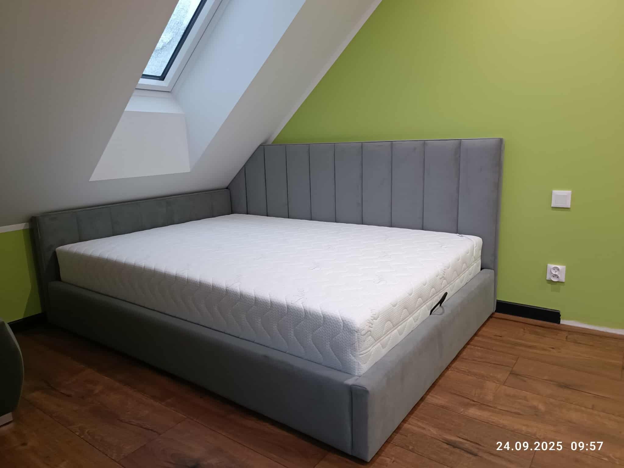Łóżko tapicerowane narożne z wezgłowiami w pasy wyposażone w stelaż podnoszony od dłuższej strony lub od krótszej w zależności od wymagań klienta, pod stelażem mamy pojemnik na pościel i nie tylko którego to głębokość uzależniona jest od wysokości boków łózka oraz zastosowanych nóżek . Ściany pojemnika są obite materiałem podbiciowym czarnym. Obite wysokiej jakości materiałem który posłuży użytkownikom przez wiele lat, materiały firmy prohurt.