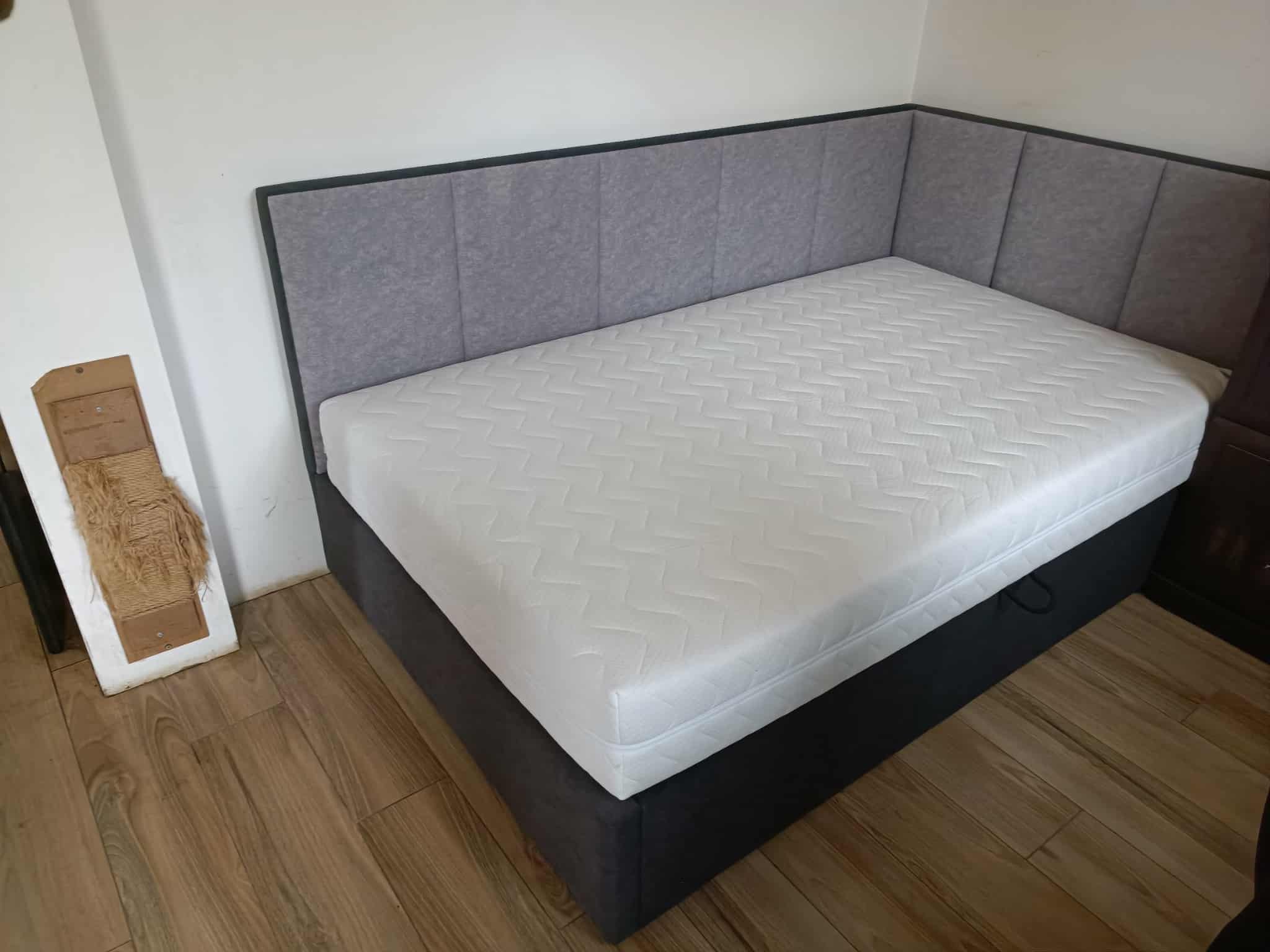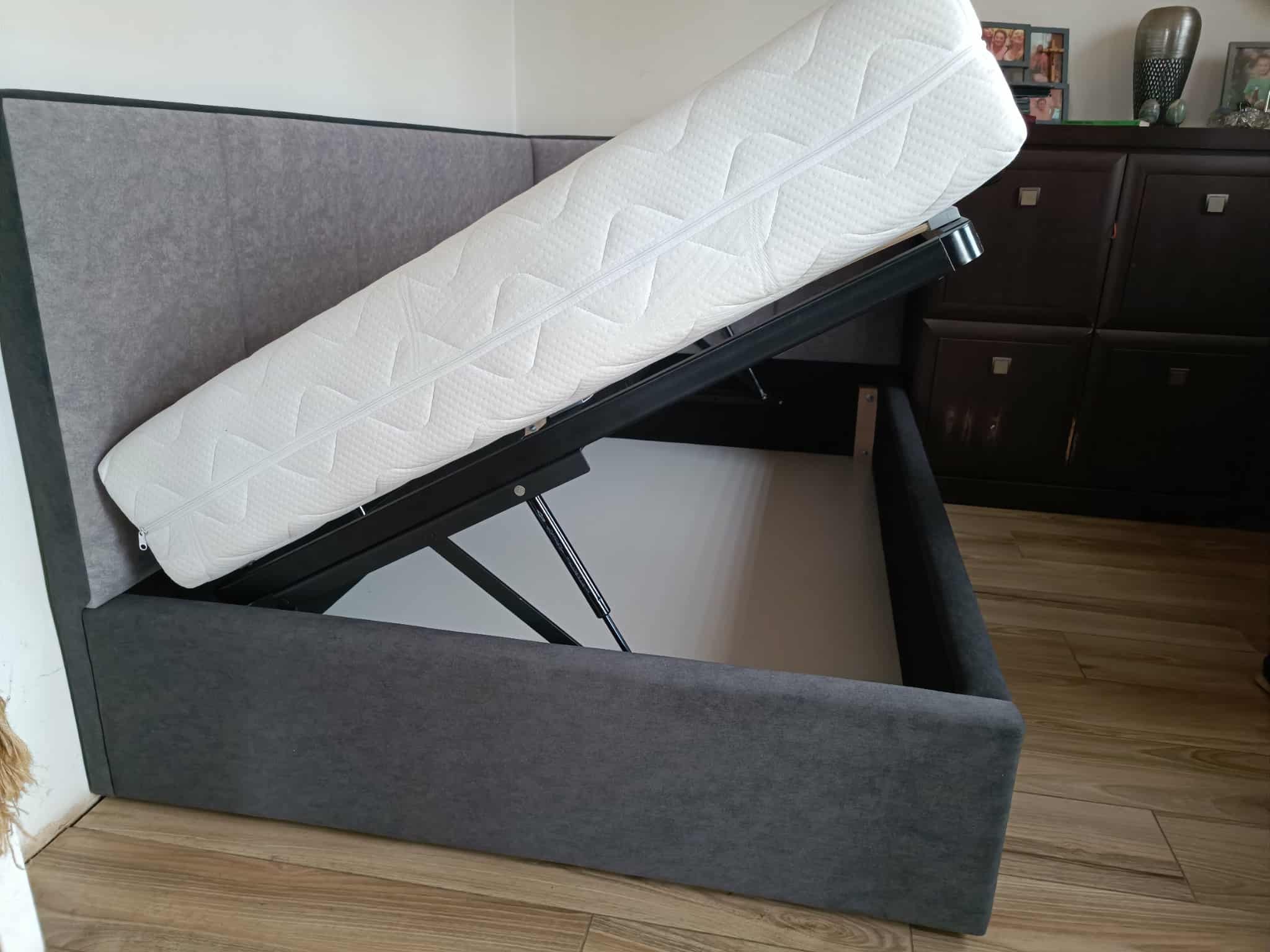 Łóżko tapicerowane narożne dwukolorowe z wezgłowiami w pasy wyposażone w stelaż podnoszony od dłuższej strony lub od krótszej w zależności od wymagań klienta, pod stelażem mamy pojemnik na pościel i nie tylko którego to głębokość uzależniona jest od wysokości boków łózka oraz zastosowanych nóżek . Ściany pojemnika są obite materiałem podbiciowym czarnym. Obite wysokiej jakości materiałem który posłuży użytkownikom przez wiele lat, materiały firmy prohurt.