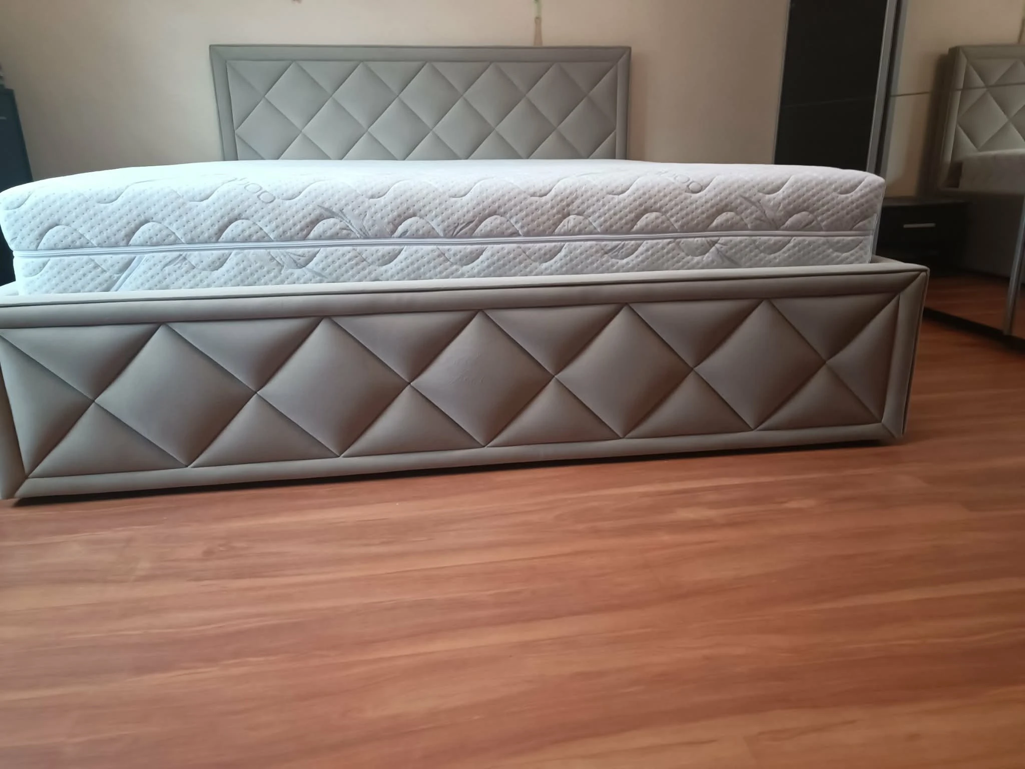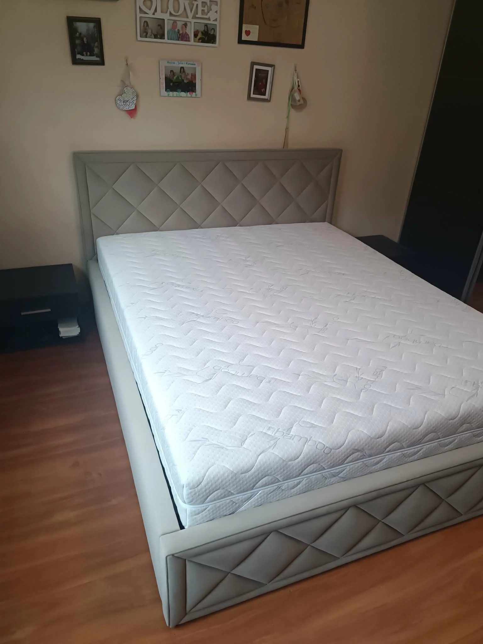 Łóżko tapicerowane z wezgłowiem w caro z otoczką wyposażone w stelaż podnoszony od dłuższej strony lub od krótszej w zależności od wymagań klienta, pod stelażem mamy pojemnik na pościel i nie tylko którego to głębokość uzależniona jest od wysokości boków łózka oraz zastosowanych nóżek . Ściany pojemnika są obite materiałem podbiciowym czarnym. Obite wysokiej jakości materiałem który posłuży użytkownikom przez wiele lat, materiały firmy prohurt