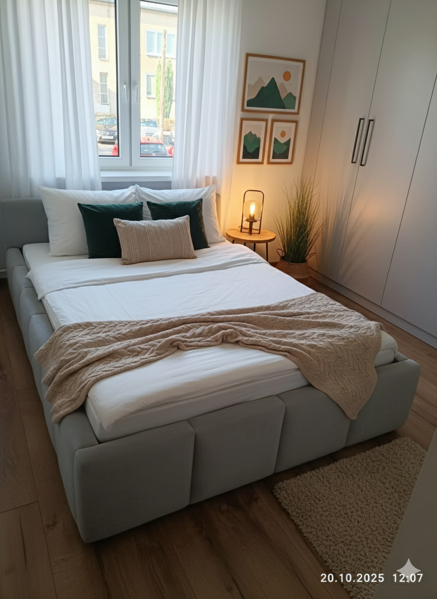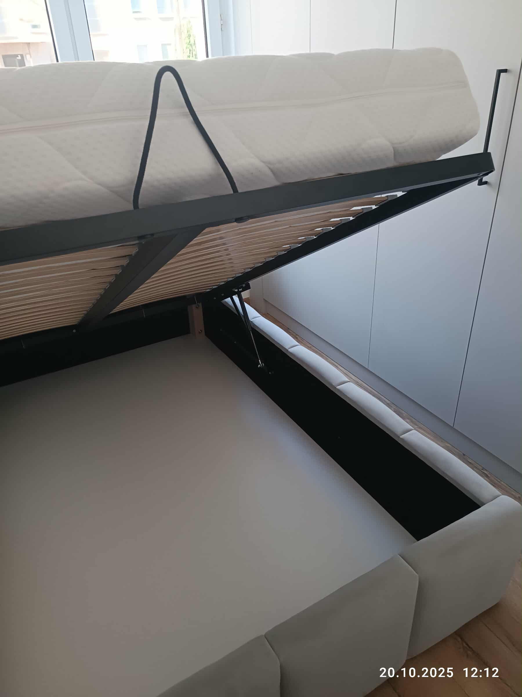 Łóżko tapicerowane z wezgłowiam w pasy bufiaste z 3 stron wraz z zagłowiem wyposażone w stelaż podnoszony od dłuższej strony lub od krótszej w zależności od wymagań klienta, pod stelażem mamy pojemnik na pościel i nie tylko którego to głębokość uzależniona jest od wysokości boków łózka oraz zastosowanych nóżek . Ściany pojemnika są obite materiałem podbiciowym czarnym. Obite wysokiej jakości materiałem który posłuży użytkownikom przez wiele lat, materiały firmy prohurt.