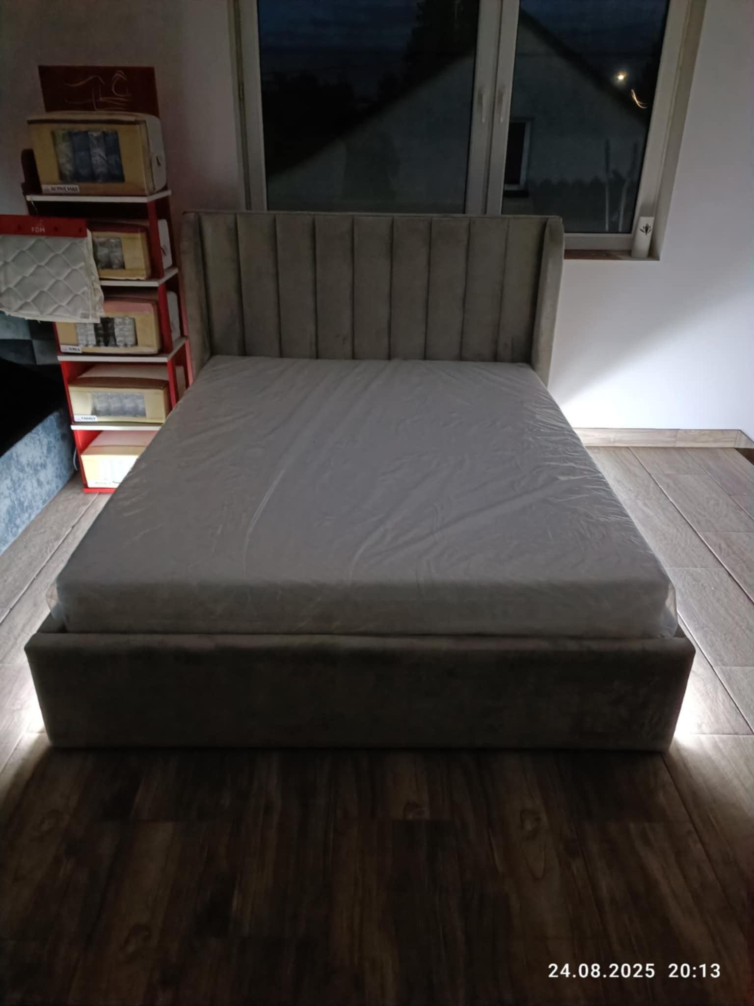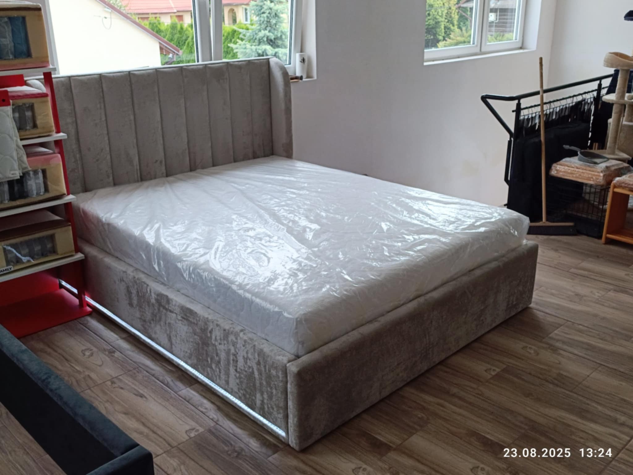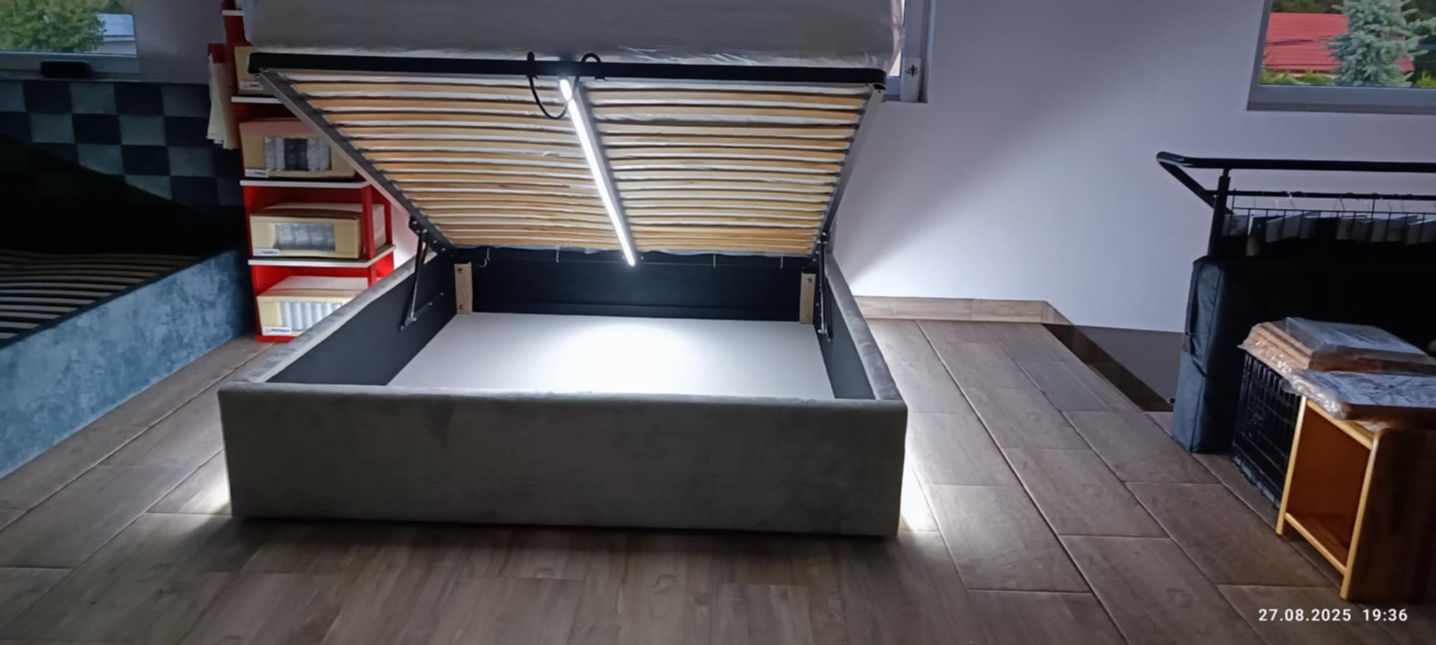 Łóżko tapicerowane z wezgłowiam w pasy szerokie i i boki tzw. uszatek z podświetleniem LED w dolnej części lub po otworzeniu stelaża wyposażone w stelaż podnoszony od dłuższej strony lub od krótszej w zależności od wymagań klienta, pod stelażem mamy pojemnik na pościel i nie tylko którego to głębokość uzależniona jest od wysokości boków łózka oraz zastosowanych nóżek . Ściany pojemnika są obite materiałem podbiciowym czarnym. Obite wysokiej jakości materiałem który posłuży użytkownikom przez wiele lat, materiały firmy prohurt.