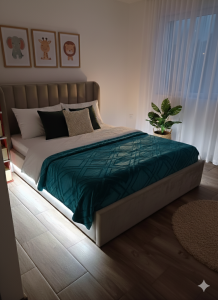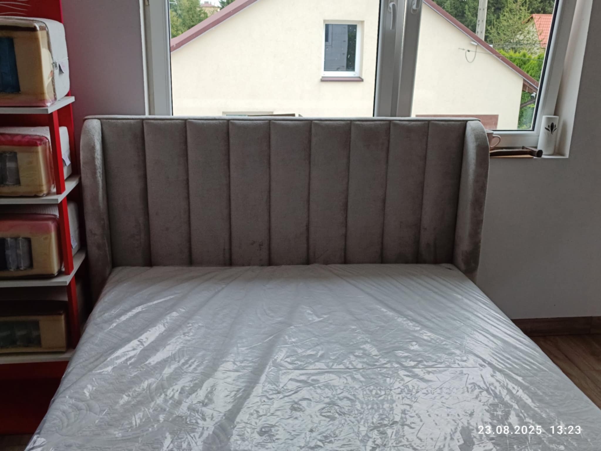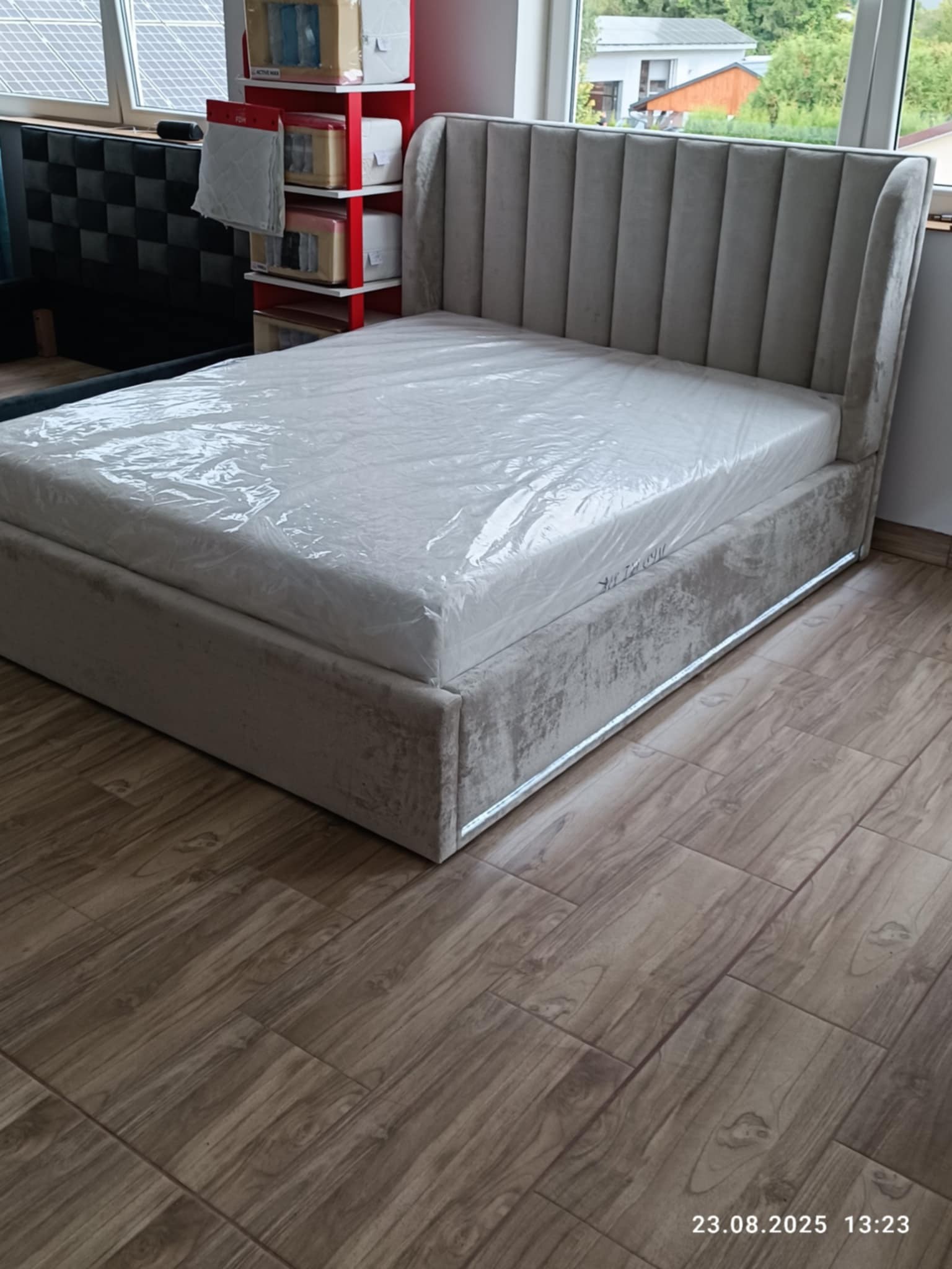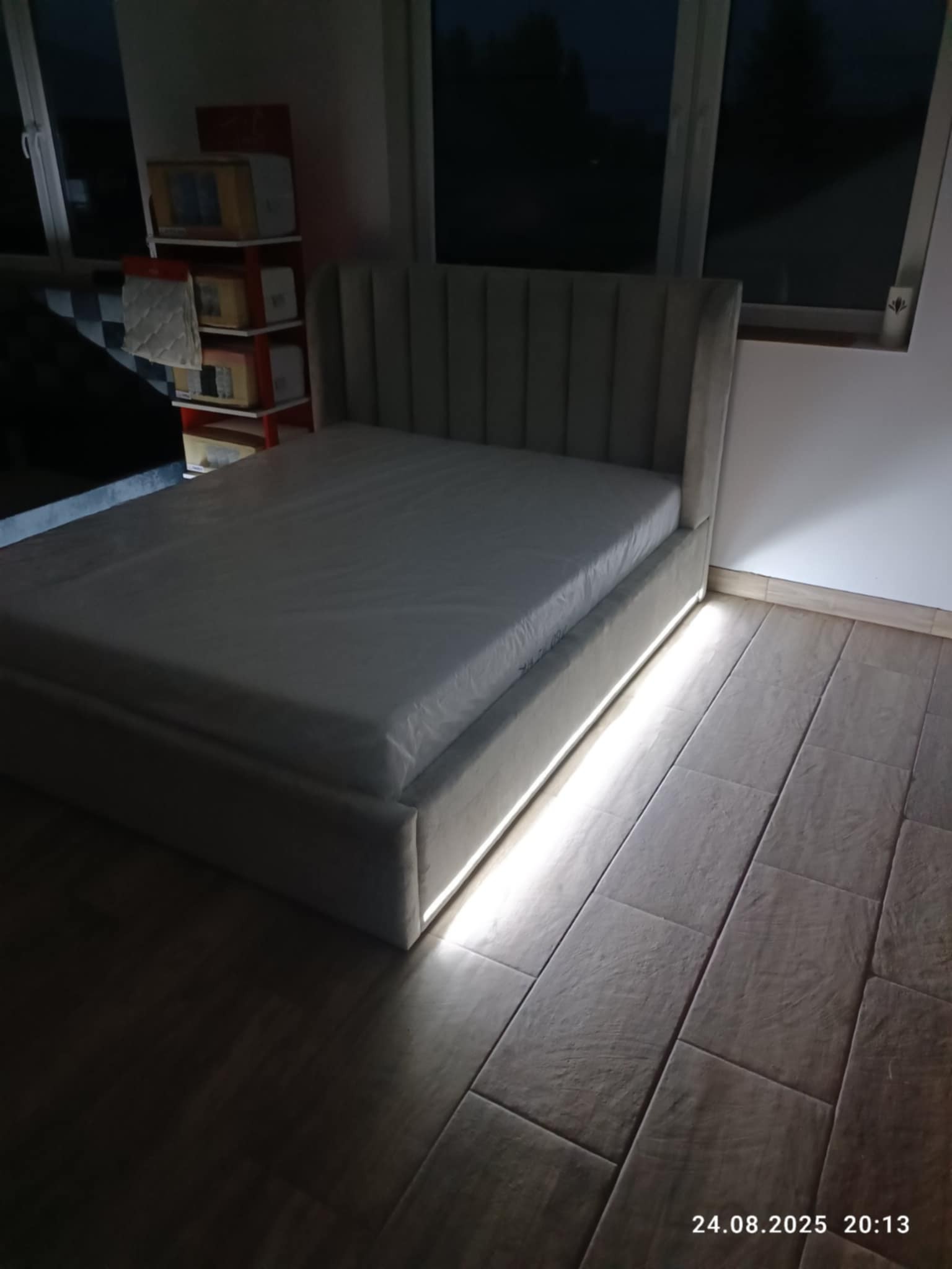Łóżko tapicerowane z wezgłowiam w pasy szerokie i i boki tzw. uszatek z podświetleniem LED w dolnej części lub po otworzeniu stelaża wyposażone w stelaż podnoszony od dłuższej strony lub od krótszej w zależności od wymagań klienta, pod stelażem mamy pojemnik na pościel i nie tylko którego to głębokość uzależniona jest od wysokości boków łózka oraz zastosowanych nóżek . Ściany pojemnika są obite materiałem podbiciowym czarnym. Obite wysokiej jakości materiałem który posłuży użytkownikom przez wiele lat, materiały firmy prohurt.