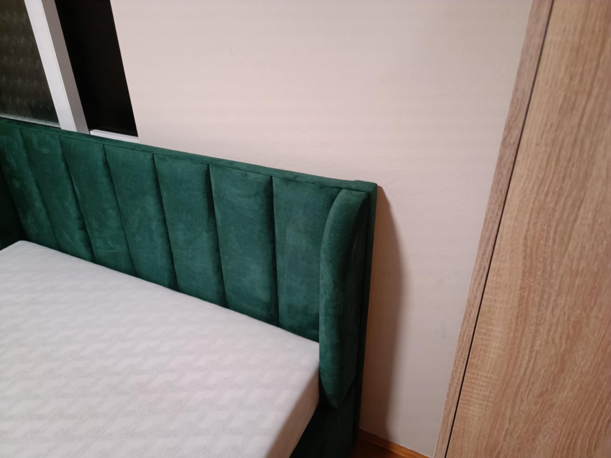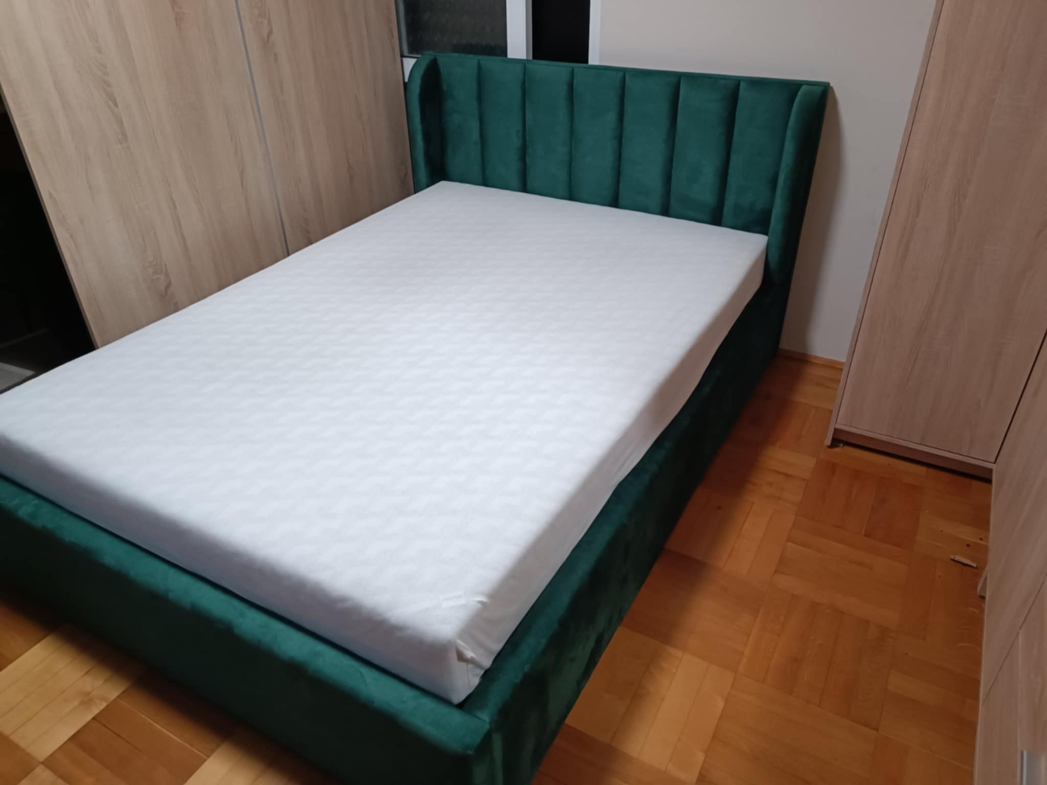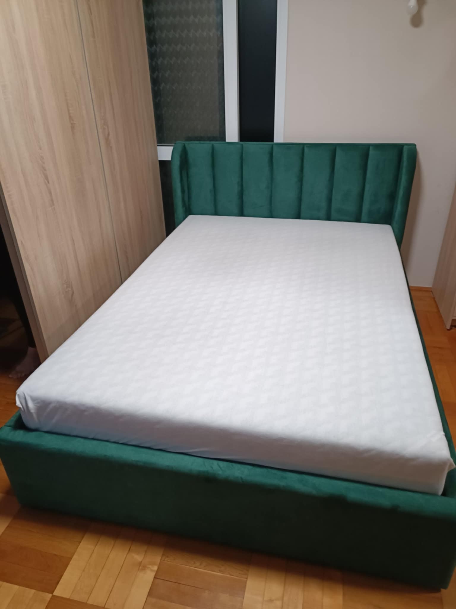 140x200 Łóżko tapicerowane w pasy uszatek zielony, pojemnik