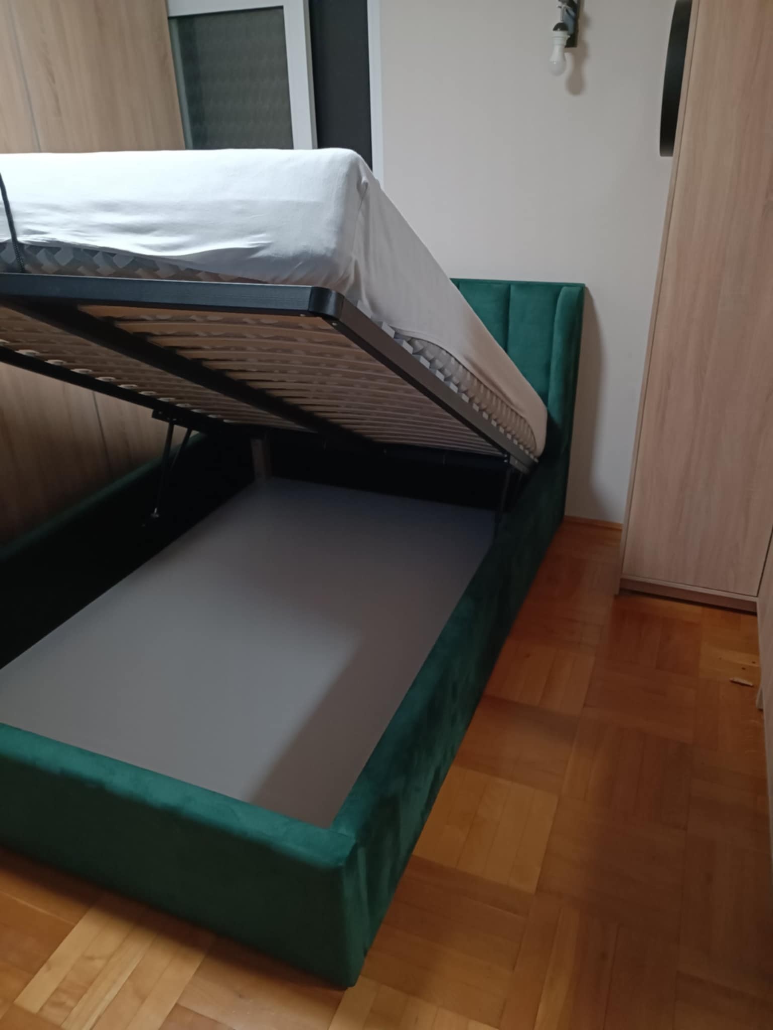 Łóżko tapicerowane z wezgłowiam w pasy szerokie i i boki tzw. uszatek wyposażone w stelaż podnoszony od dłuższej strony lub od krótszej w zależności od wymagań klienta, pod stelażem mamy pojemnik na pościel i nie tylko którego to głębokość uzależniona jest od wysokości boków łózka oraz zastosowanych nóżek . Ściany pojemnika są obite materiałem podbiciowym czarnym. Obite wysokiej jakości materiałem który posłuży użytkownikom przez wiele lat, materiały firmy prohurt nazwa materiału IVE.