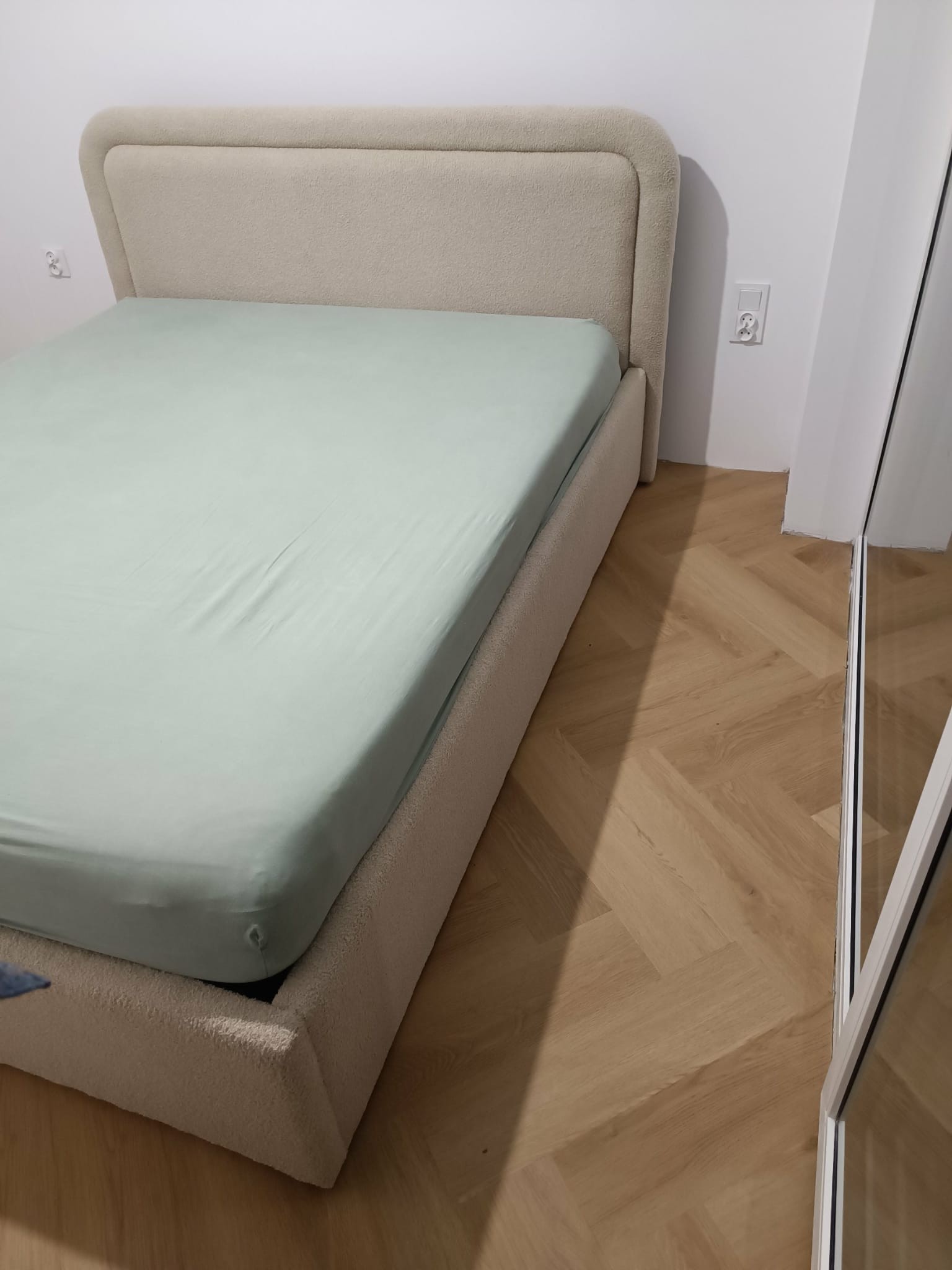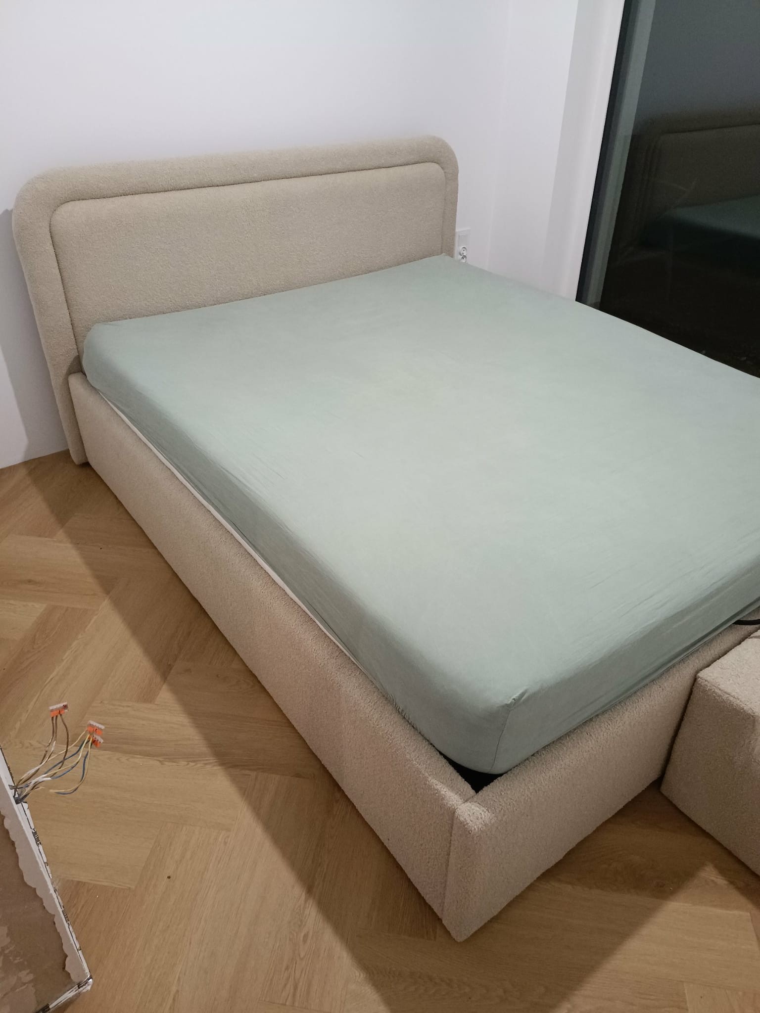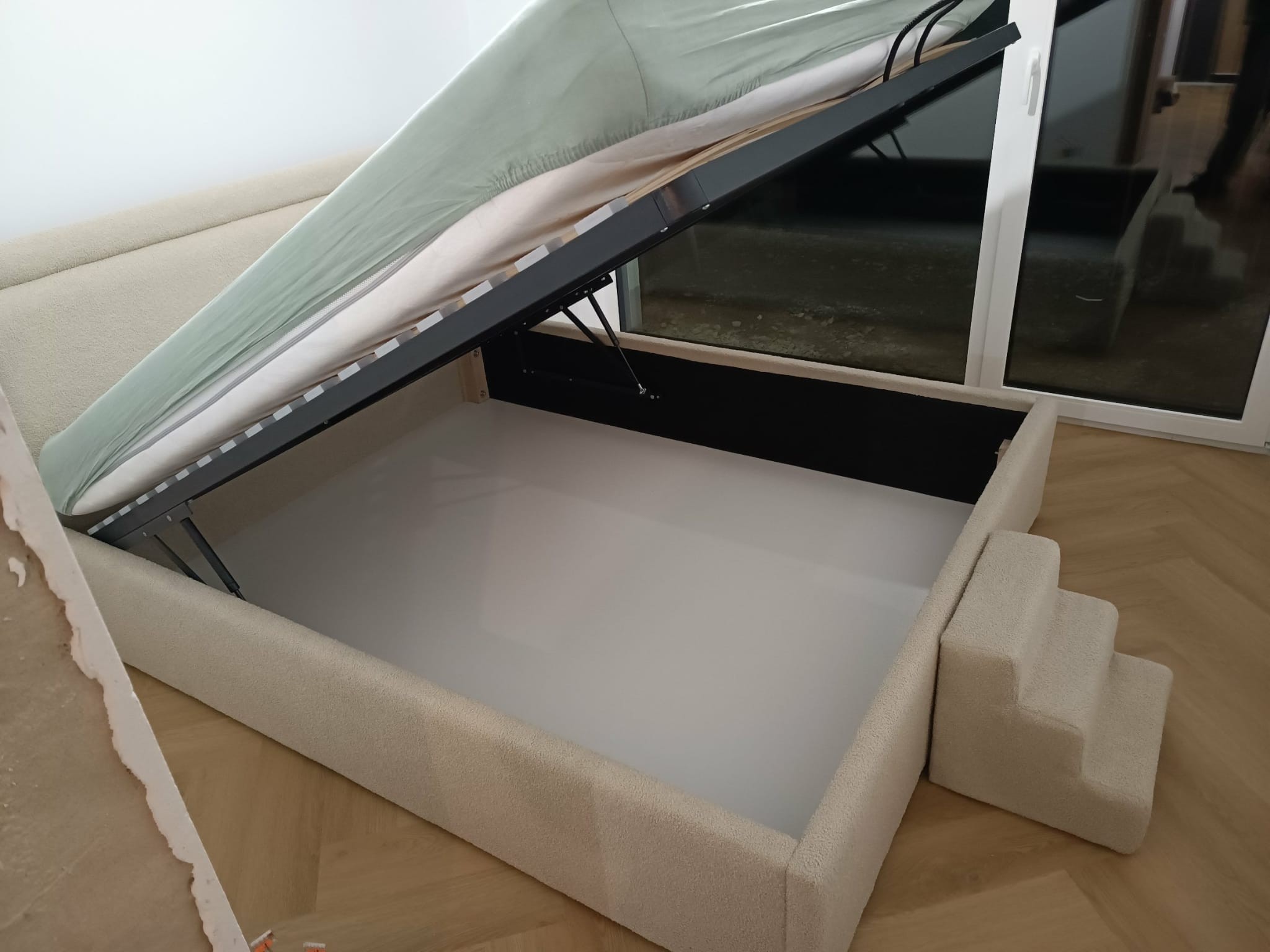 Łóżko tapicerowane z wezgłowiem gładkim i otoczką wyposażone w stelaż podnoszony od dłuższej strony lub od krótszej w zależności od wymagań klienta, pod stelażem mamy pojemnik na pościel i nie tylko którego to głębokość uzależniona jest od wysokości boków łózka oraz zastosowanych nóżek . Ściany pojemnika są obite materiałem podbiciowym czarnym. Obite wysokiej jakości materiałem który posłuży użytkownikom przez wiele lat, materiały firmy prohurt.