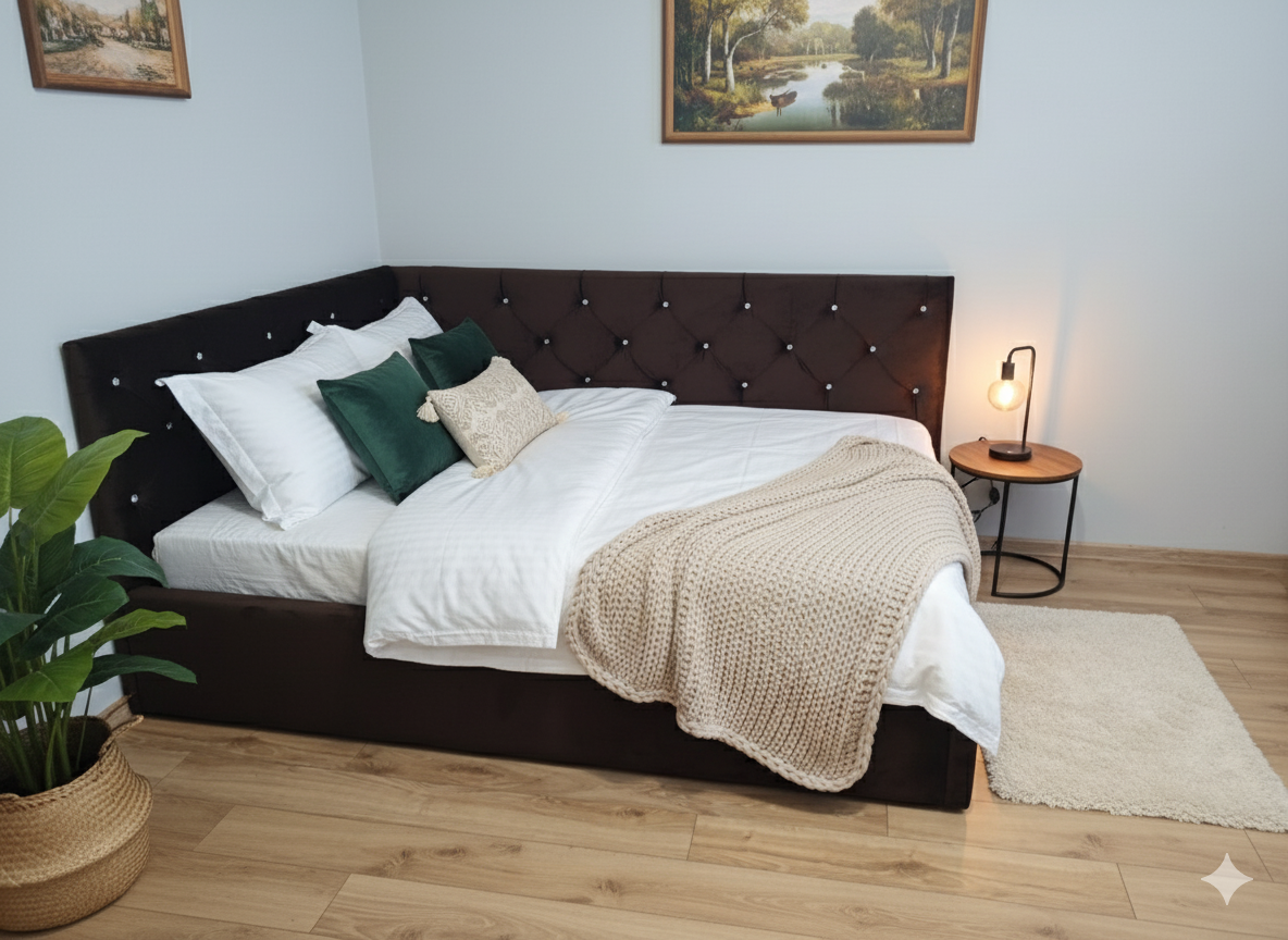 Łóżko tapicerowane narożne z wezgłowiami pikowanymi wyposażone w stelaż podnoszony od dłuższej strony lub od krótszej w zależności od wymagań klienta, pod stelażem mamy pojemnik na pościel i nie tylko którego to głębokość uzależniona jest od wysokości boków łózka oraz zastosowanych nóżek . Ściany pojemnika są obite materiałem podbiciowym czarnym. Obite wysokiej jakości materiałem który posłuży użytkownikom przez wiele lat, materiały firmy prohurt nazwa materiału IVE.