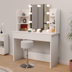 Stolik kosmetyczny jest wyposażony w 4 półki i dużą szufladę. Schowki zapewniają dużo miejsca na suszarkę do włosów, perfumy lub pudełko kosmetyków. W dużej szufladzie pod blatem znajdź pędzel, lokówki lub biżuterię..