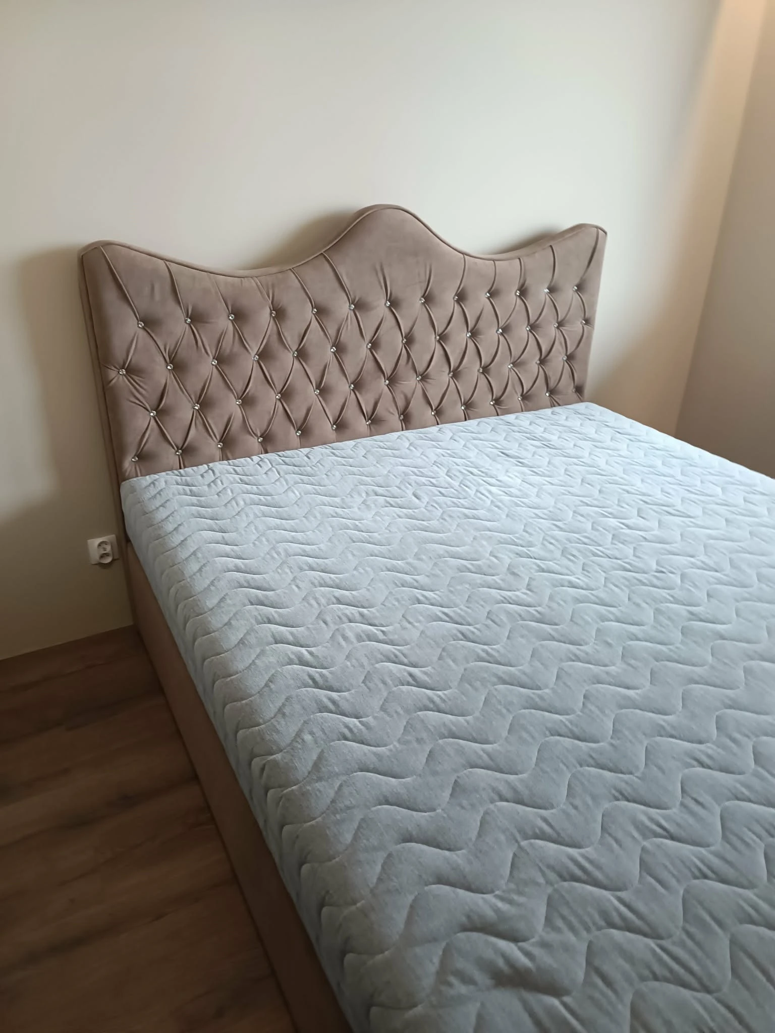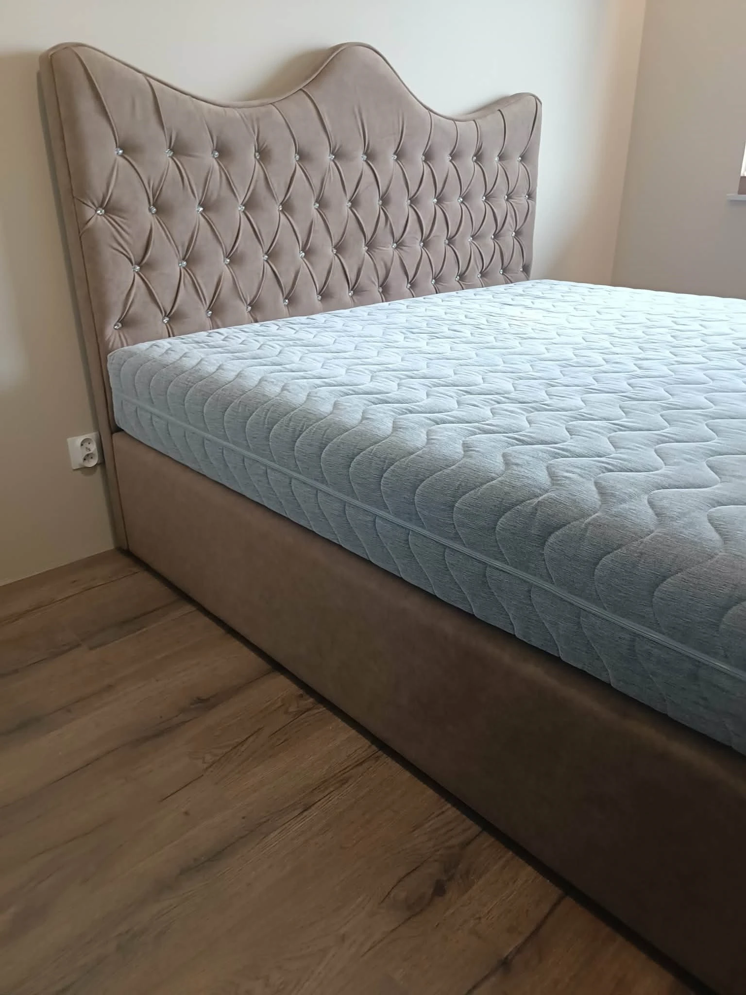 Łóżko tapicerowane z wezgłowiem pikowanym kryształkami wysokim wyposażone w stelaż podnoszony od dłuższej strony lub od krótszej w zależności od wymagań klienta, pod stelażem mamy pojemnik na pościel i nie tylko którego to głębokość uzależniona jest od wysokości boków łózka oraz zastosowanych nóżek . Ściany pojemnika są obite materiałem podbiciowym czarnym. Obite wysokiej jakości materiałem który posłuży użytkownikom przez wiele lat, materiały firmy prohurt.