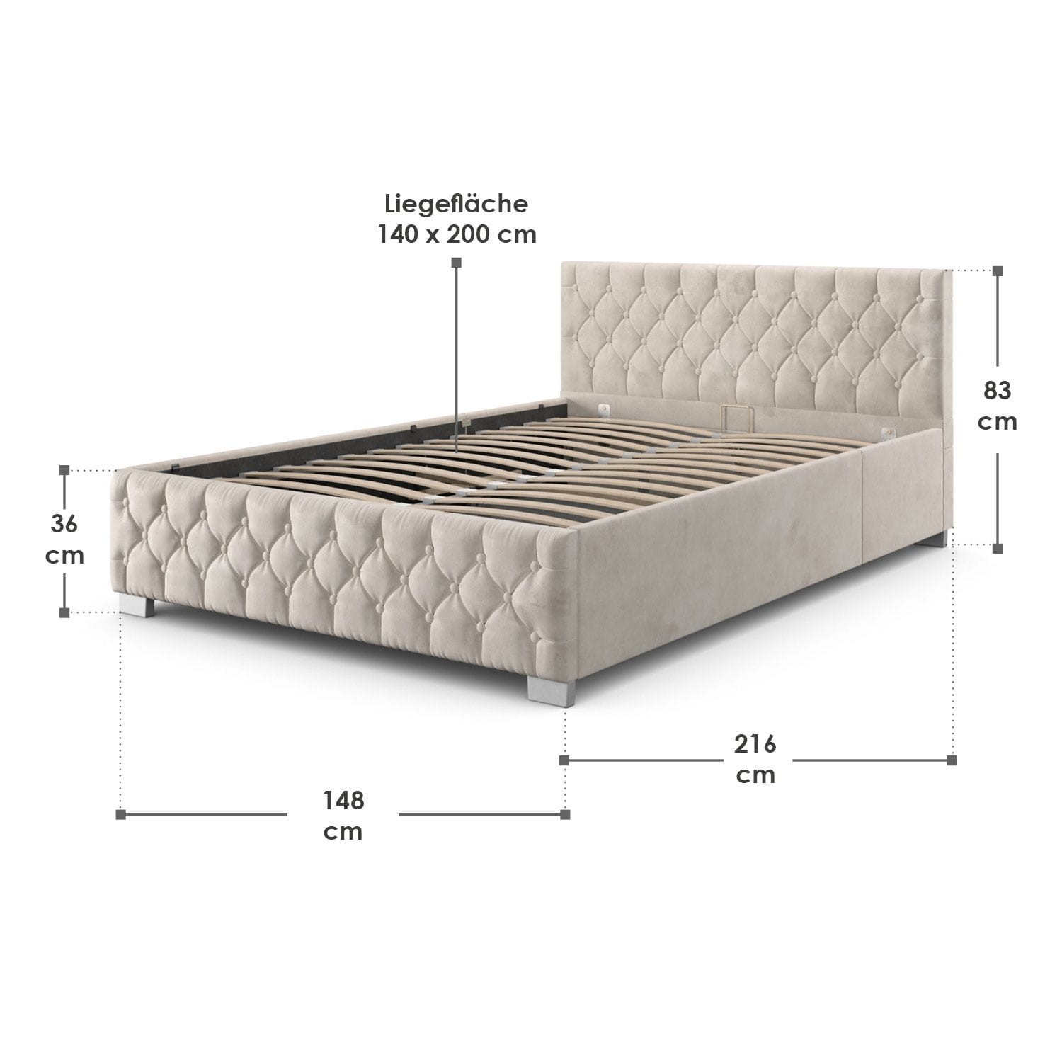 Piękne łóżko tapicerowane (140 x 200 cm,) z oświetleniem LED nada urok każdej sypialni. Można wspaniale odpocząć wciągu dnia i doskonale zregenerować siły podczas nocy. Tworzy wspaniałą atmosferę w twojej sypialni i poczujesz się całkowicie komfortowo. Dzięki miękkiej wyściółce z aksamitną tkaniną, oraz wysokim zagłowiem który służy jako wygodne oparcie