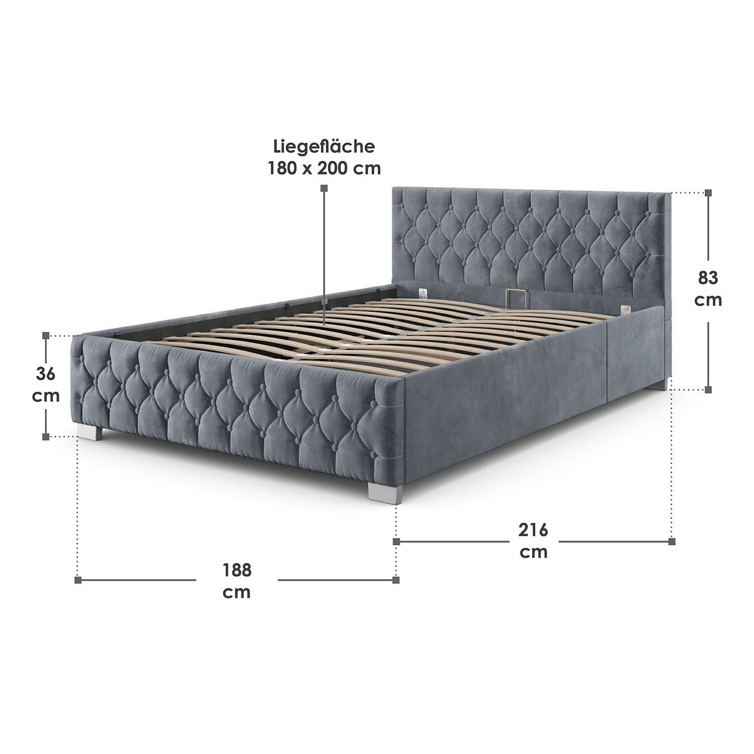 Sprężynowa rama z listew zapewnia relaksującą pozycję leżącą i spokojny sen. Wysoki zagłówek jest szczególnie wygodny dzięki wyściełaniu i aksamitnemu obiciu.