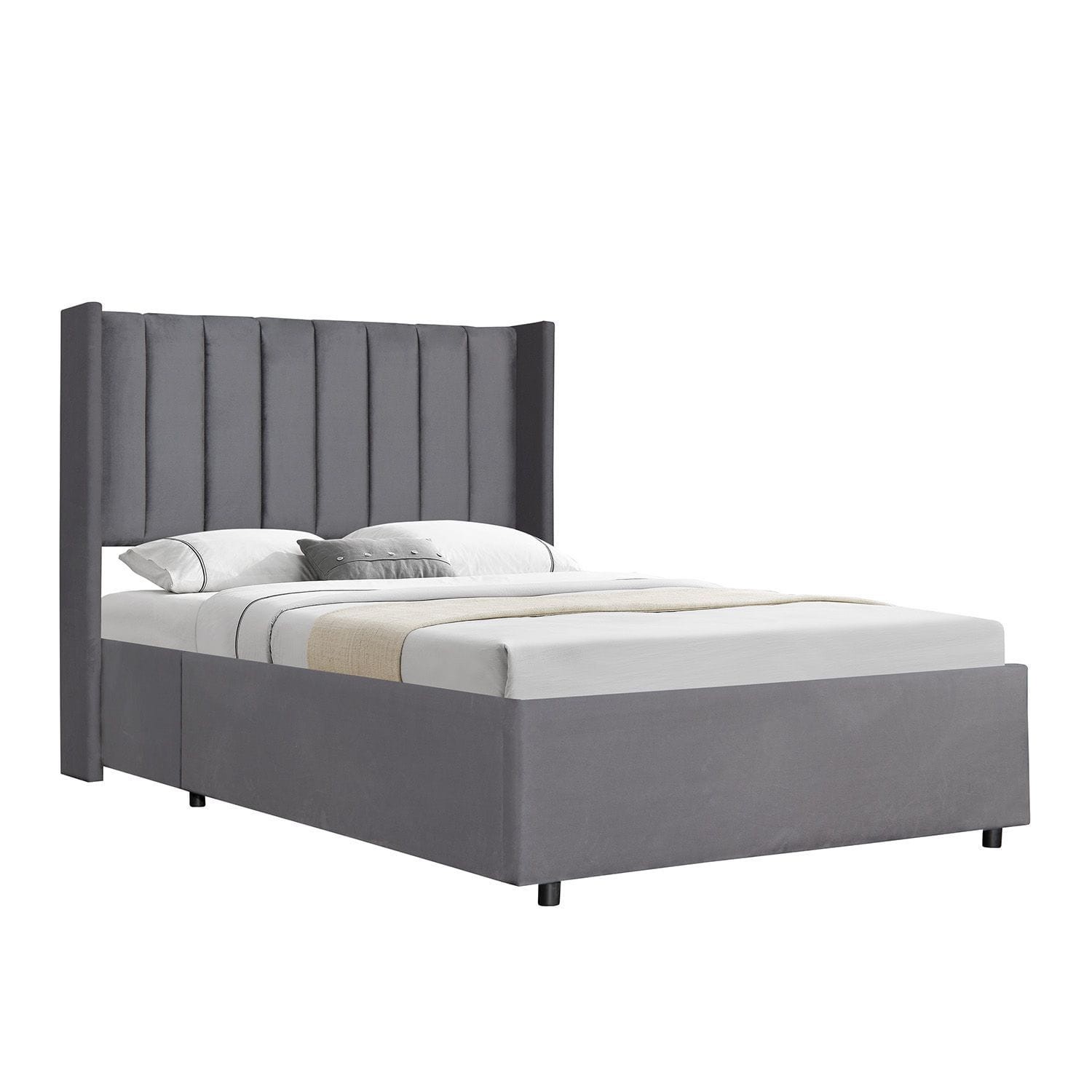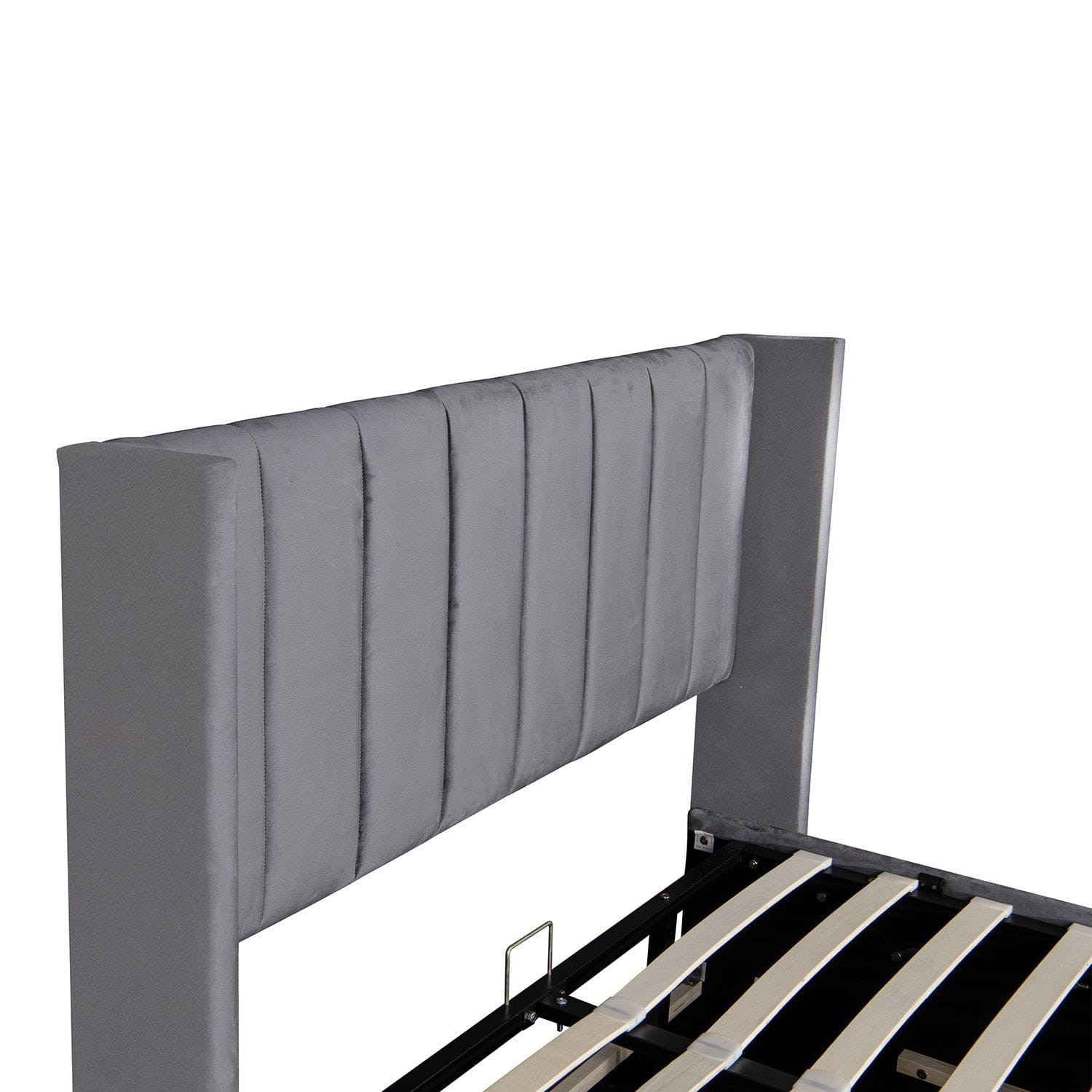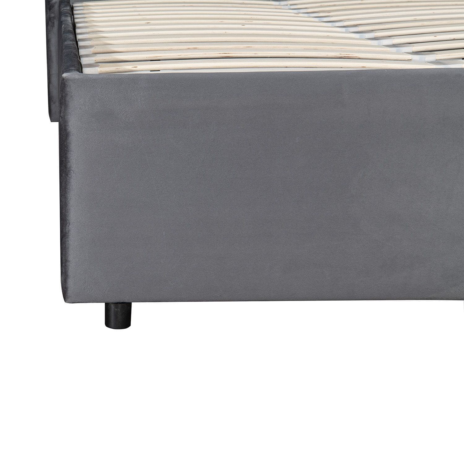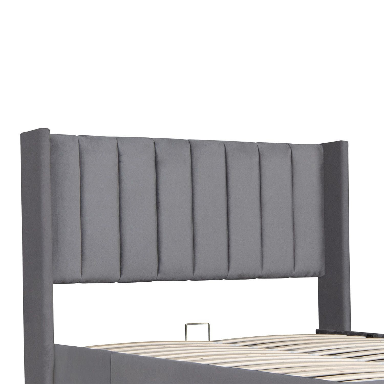 Sprężynowa rama z listew zapewnia relaksującą pozycję leżącą i spokojny sen. Wysoki zagłówek jest szczególnie wygodny dzięki wyściełaniu i aksamitnemu obiciu.