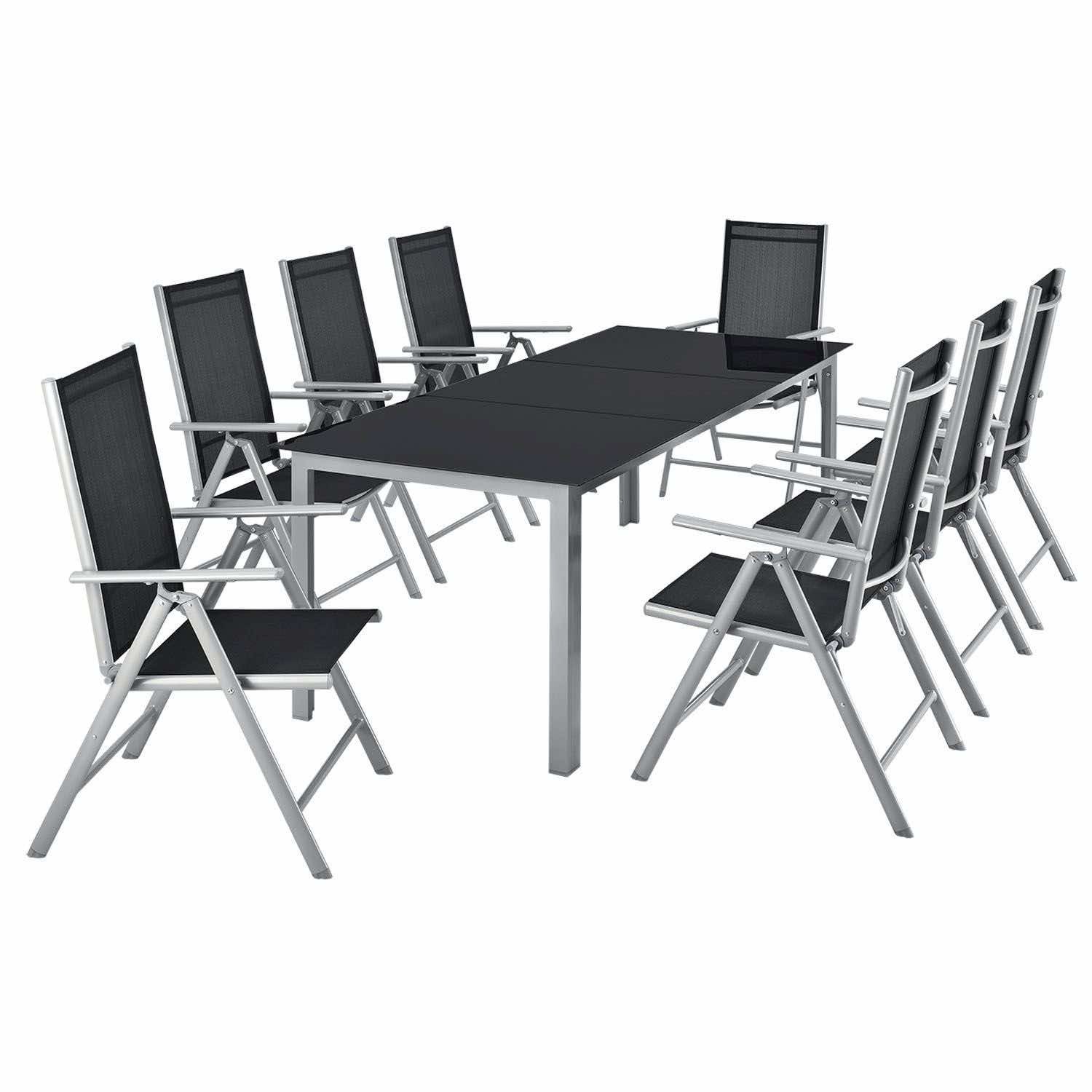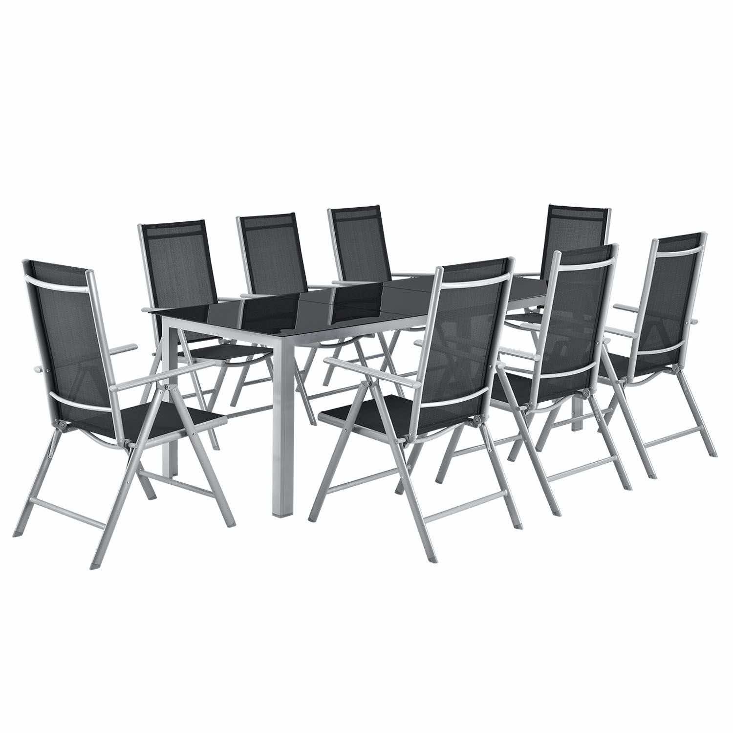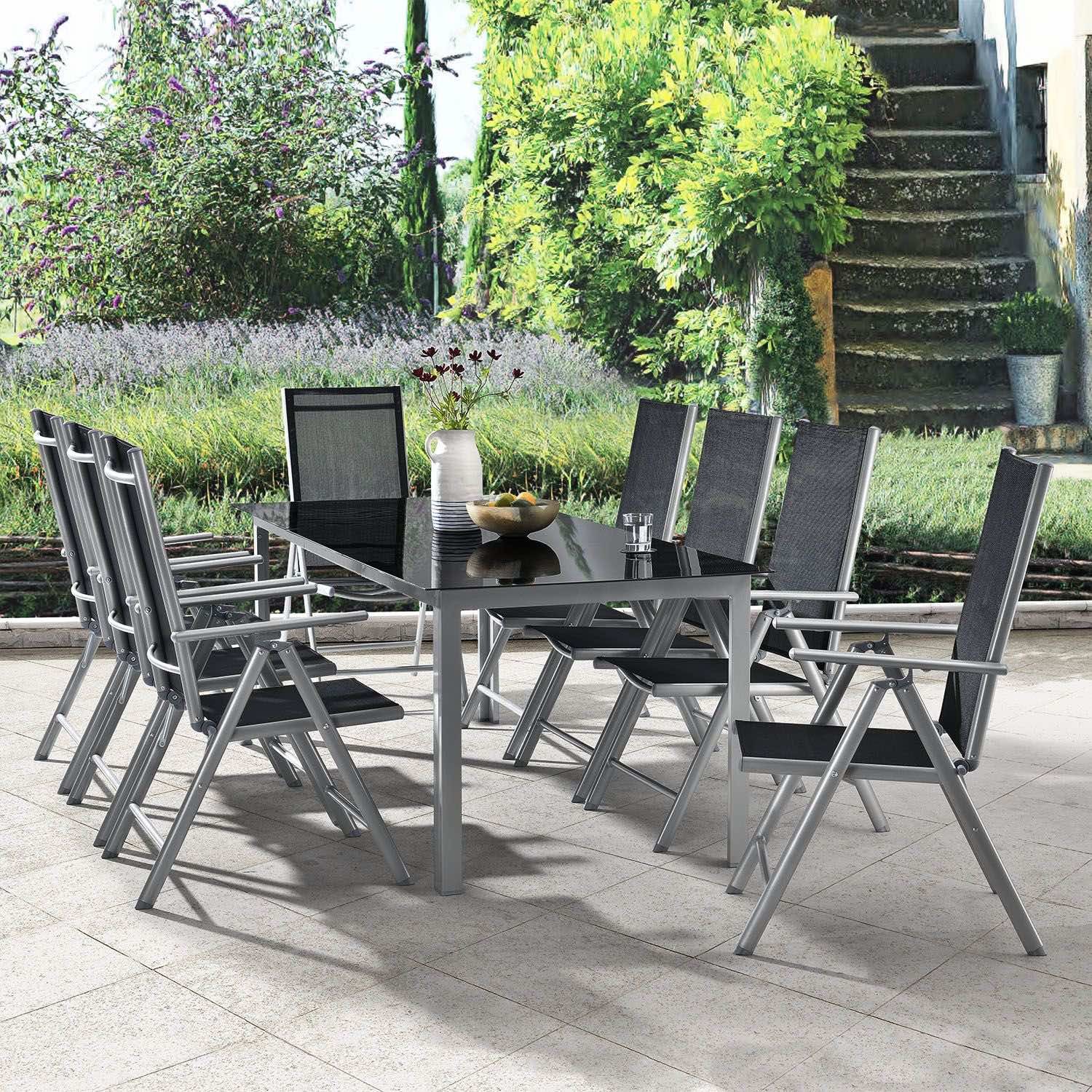 Dziewięcioczęściowy aluminiowy zestaw ogrodowy z dużym stołem i ośmioma krzesłami to idealny towarzysz lata dla tych, którzy lubią świeże powietrze. Spędź wieczory kawowe z grami, kolorowe urodziny dzieci i grille na komfortowych meblach. Montaż przebiega szybko, a lekkie meble ogrodowe można błyskawicznie przestawiać. Super łatwe czyszczenie i pielęgnacja nie trwa długo po każdej imprezie. Złóż krzesła jednym ruchem