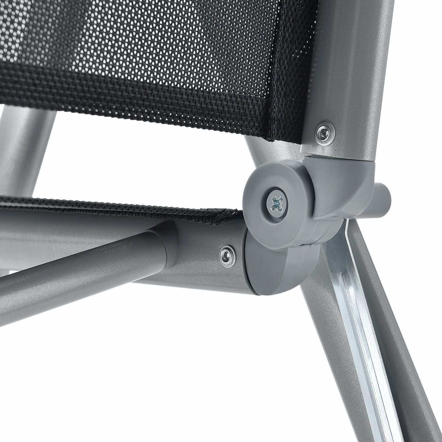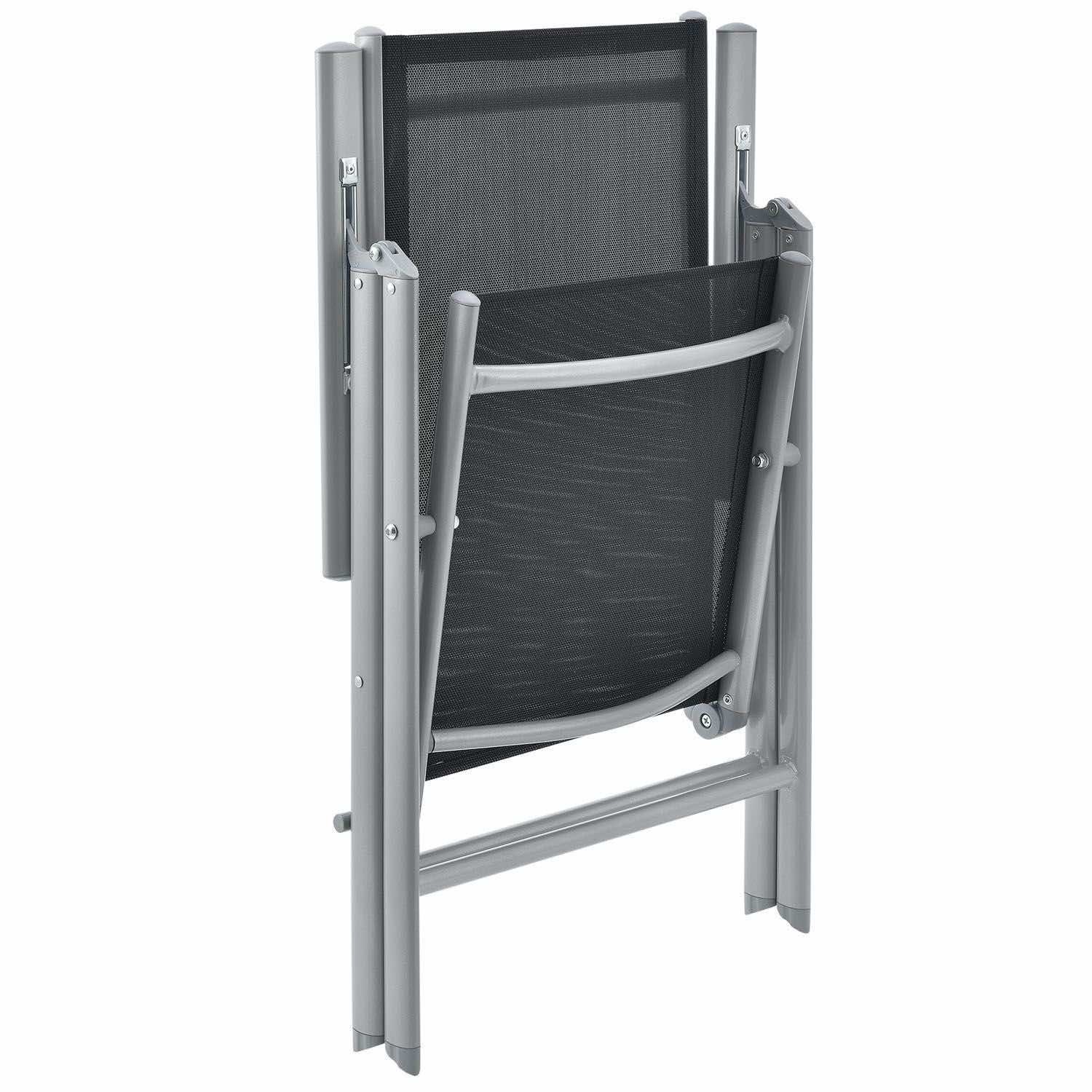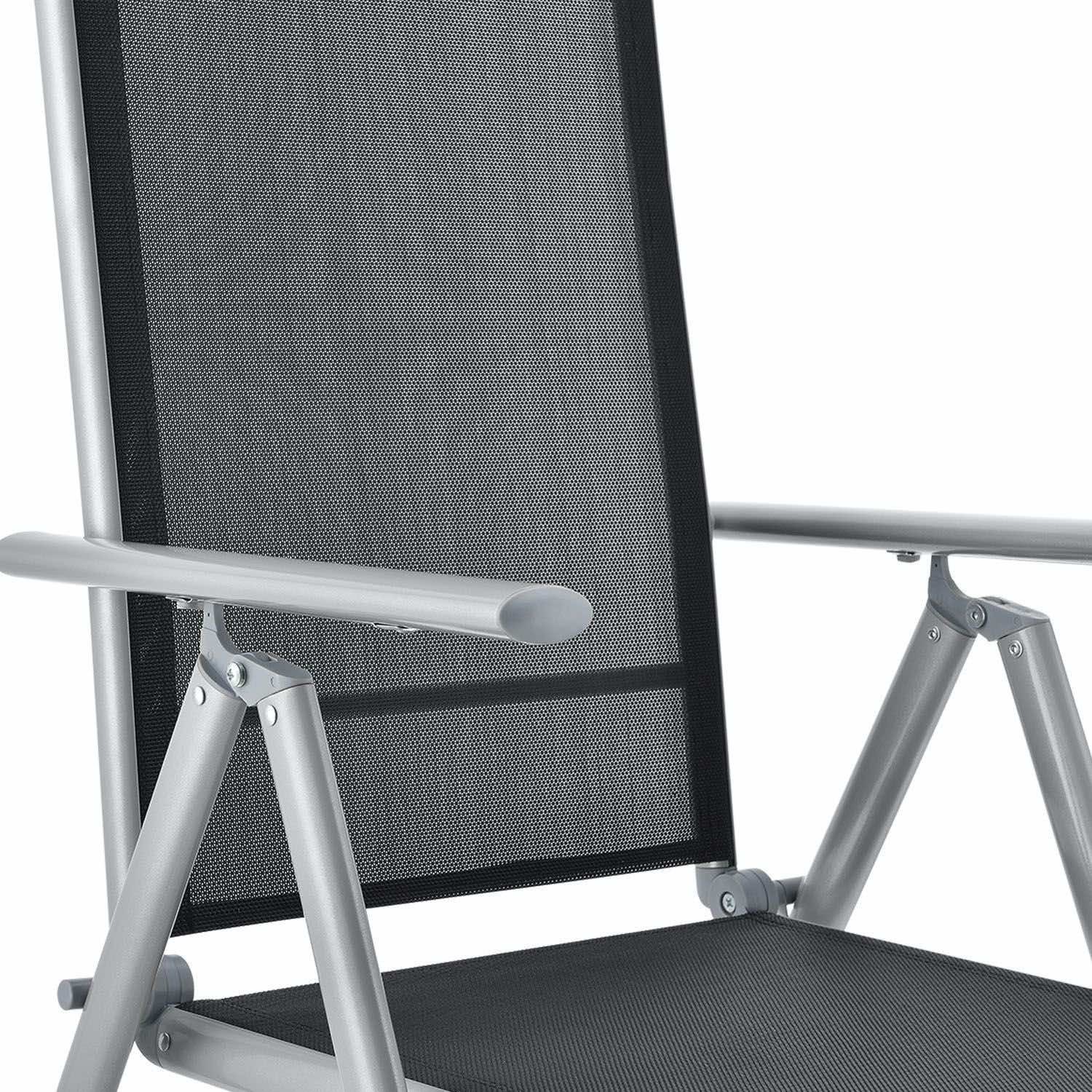 Sześć dużych krzeseł o wymiarach 58 x 65 x 111 cm z aluminiowymi ramami, pomimo swojej lekkości, jest wyjątkowo trwałe i stabilne. Aby uzyskać jak największy komfort siedzenia, odchyl oparcie krzesła. Krzesła można złożyć, aby zaoszczędzić miejsce.