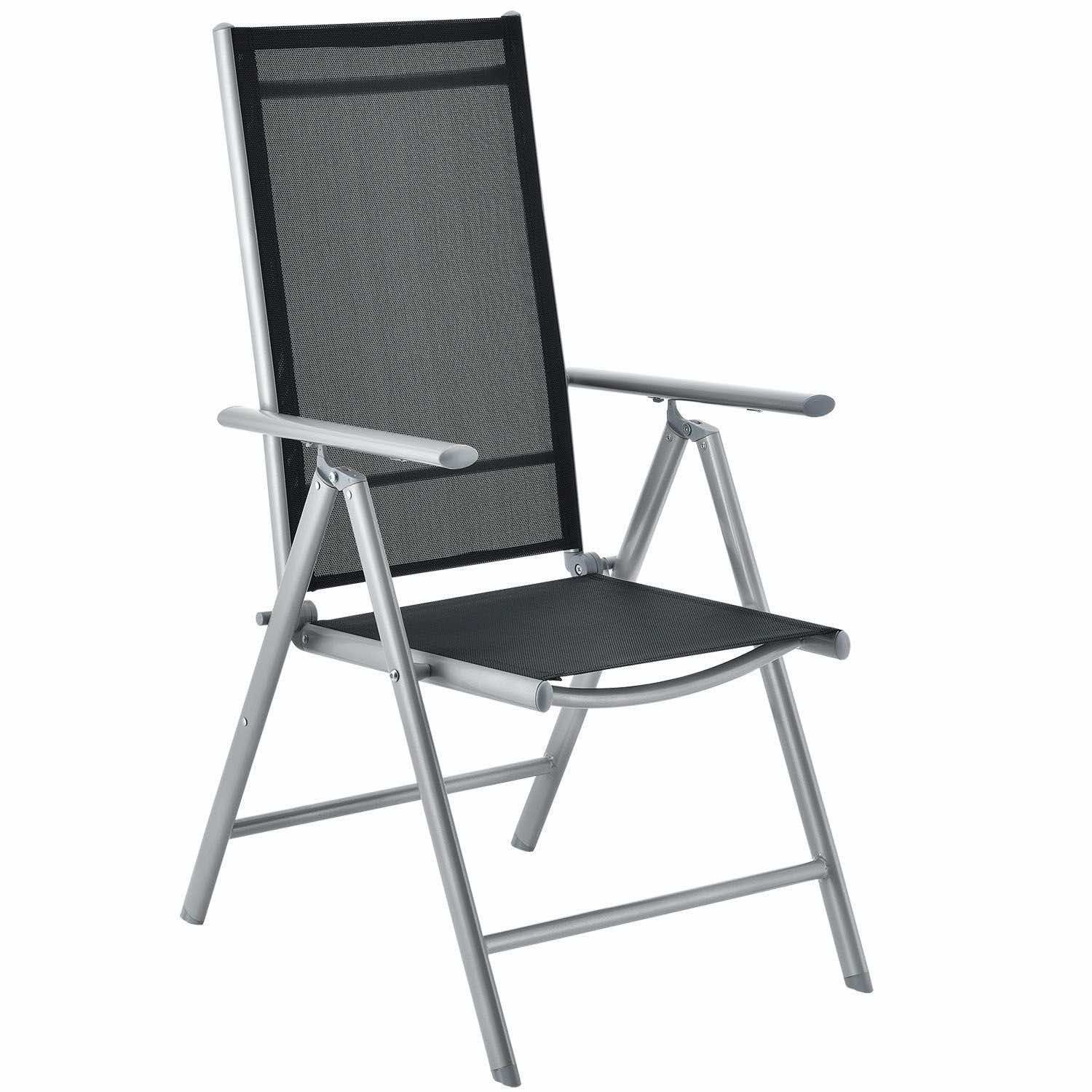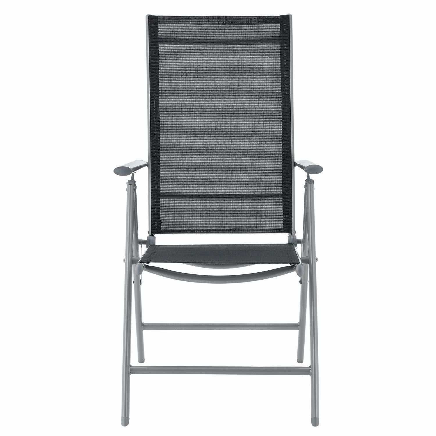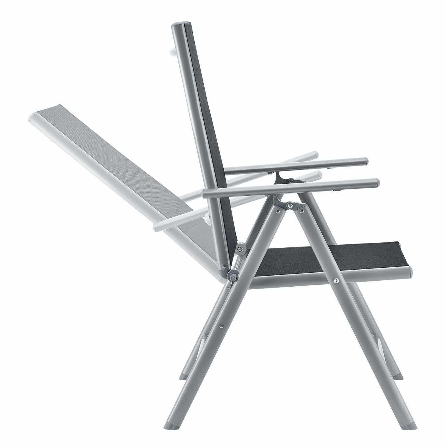 Sześć dużych krzeseł o wymiarach 58 x 65 x 111 cm z aluminiowymi ramami, pomimo swojej lekkości, jest wyjątkowo trwałe i stabilne. Aby uzyskać jak największy komfort siedzenia, odchyl oparcie krzesła. Krzesła można złożyć, aby zaoszczędzić miejsce.