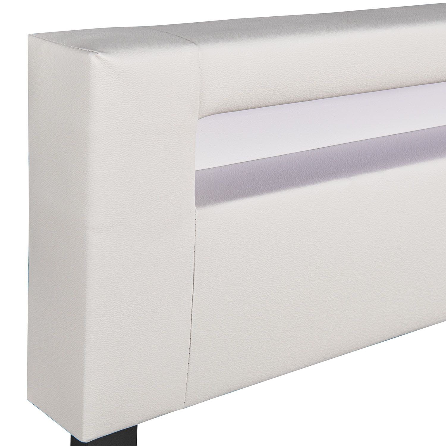 Elementem przyciągającym wzrok łóżka z imitacji skóry jest zagłówek z regulacją wysokości z wbudowanym oświetleniem LED. Za pomocą pilota możesz wybierać spośród 16 różnych kolorów światła i poziomów jasności. Zrelaksuj się w nastrojowej atmosferze i pośrednim oświetleniu, opierając się o wygodny zagłówek.