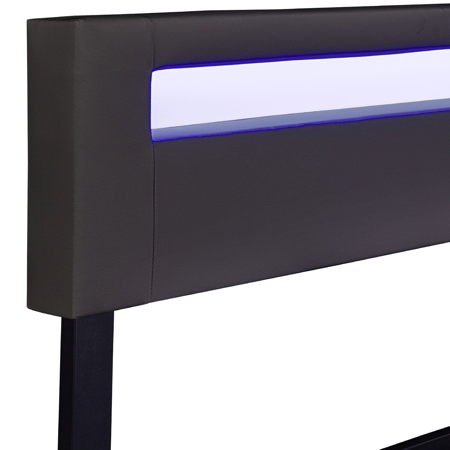 Elementem przyciągającym wzrok łóżka z imitacji skóry jest zagłówek z regulacją wysokości z wbudowanym oświetleniem LED. Za pomocą pilota możesz wybierać spośród 16 różnych kolorów światła i poziomów jasności. Zrelaksuj się w nastrojowej atmosferze i pośrednim oświetleniu, opierając się o wygodny zagłówek.