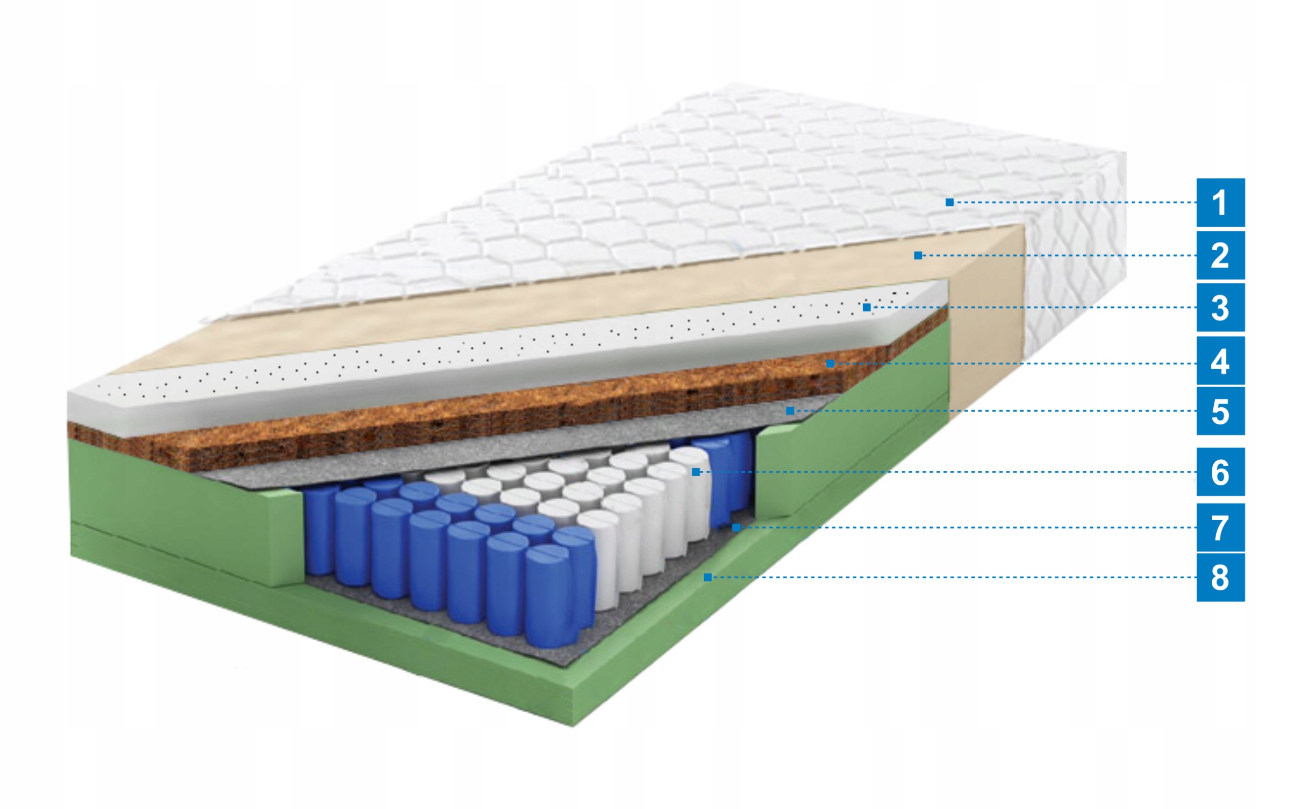 Filc przełożony jest wulkanizowaną matą kokosową o bardzo wysokiej gramaturze 1200g/m2. Mata jest dodatkowo lateksowana i igłowana, dzięki czemu materac nie odkształca się po długim okresie użytkowania i przeciwdziała powstawaniu odleżyn. Po stronie maty kokosowej materac jest twardszy i bardziej sztywny.